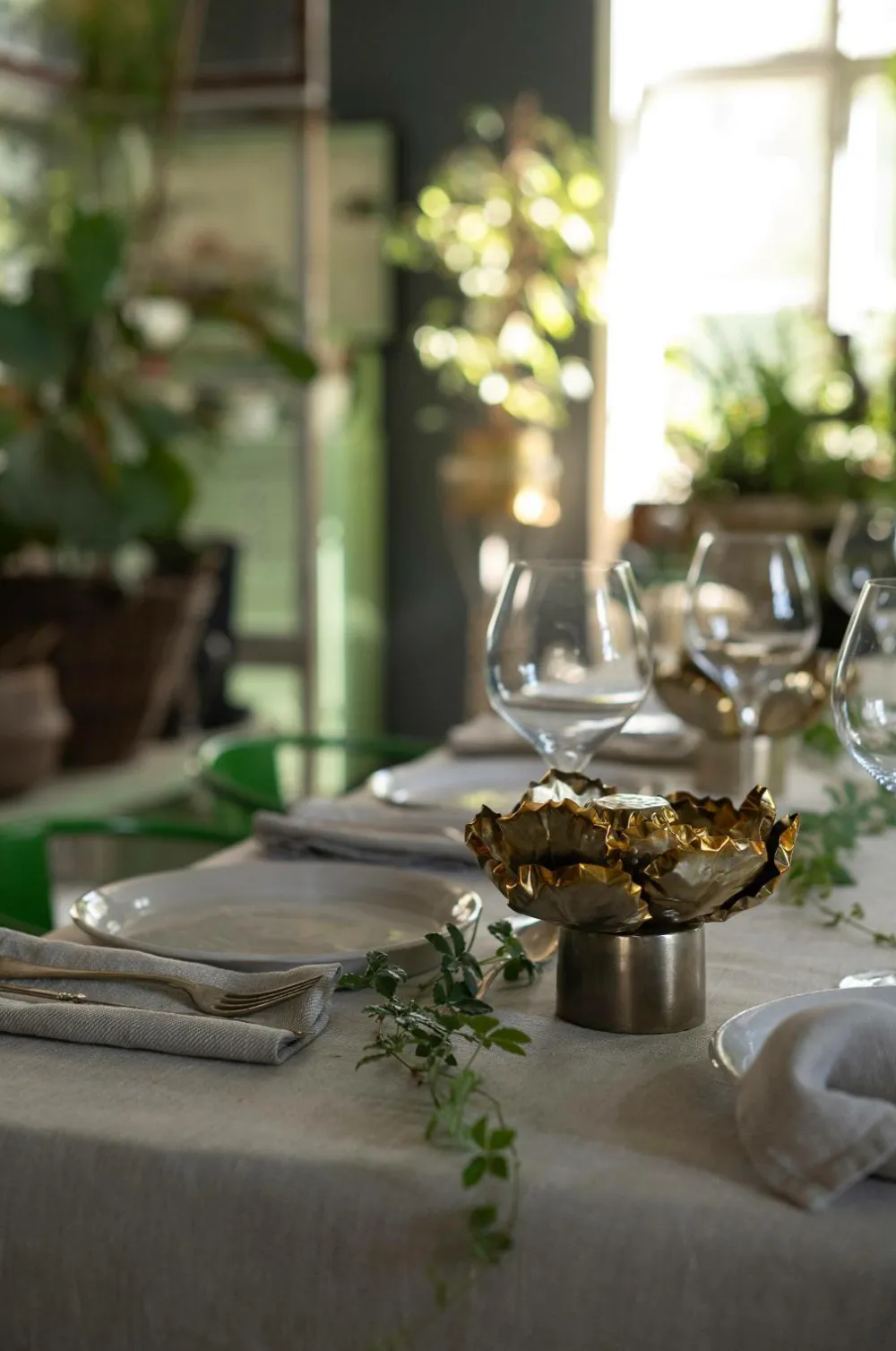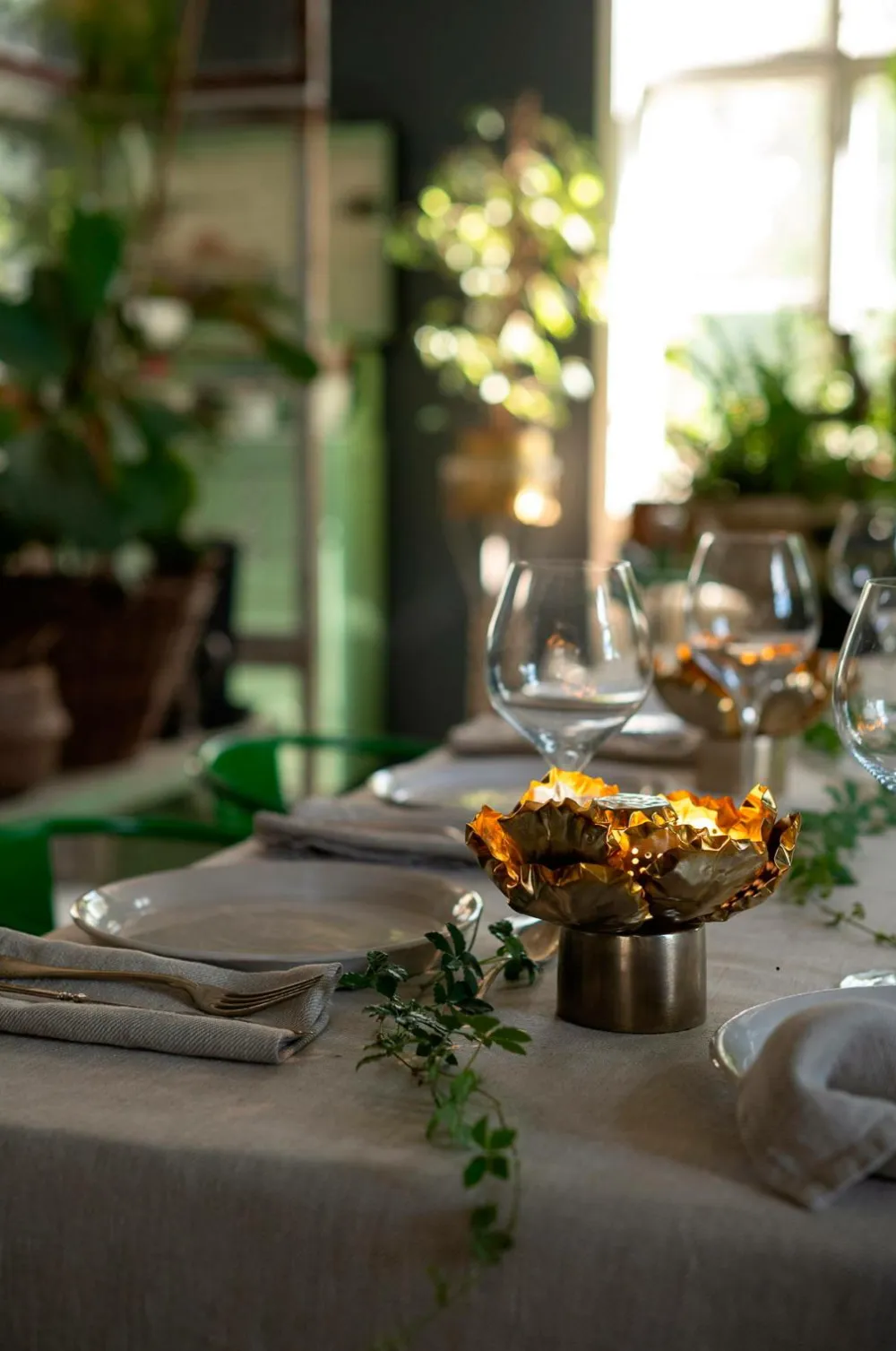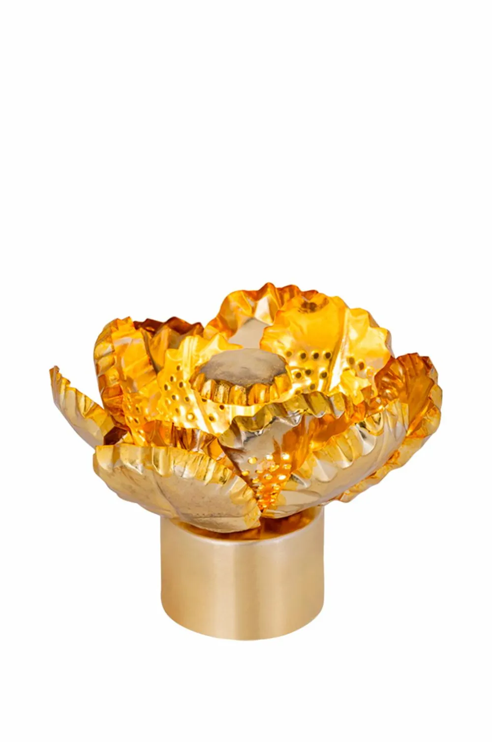 En lille trådløs lampe formet som en stor, bred blomst med tre lag kronblade, antikiseret i varme gyldne toner. Kronbladene er tynde og kan forsigtigt formes til den ønskede position. Lyskilden er placeret i midten under det lille “tag” og spreder lyset nedad og filtrerer gennem kronbladene. En smuk dekorativ lampe til at placere på et bord, en hylde eller hvorfor ikke flere til en borddækning. Lyser i 4-6 timer ved fuld styrke, 10-12 timer ved laveste styrke. Genopladelig – oplades med USB-C-kabel – medfølger ikke.