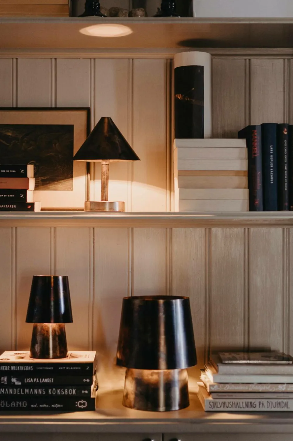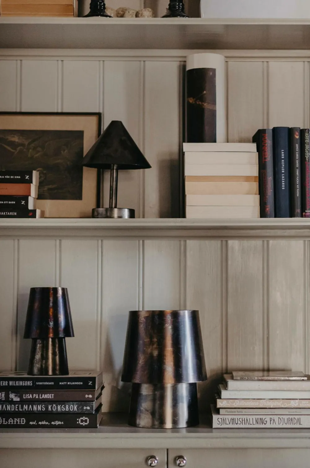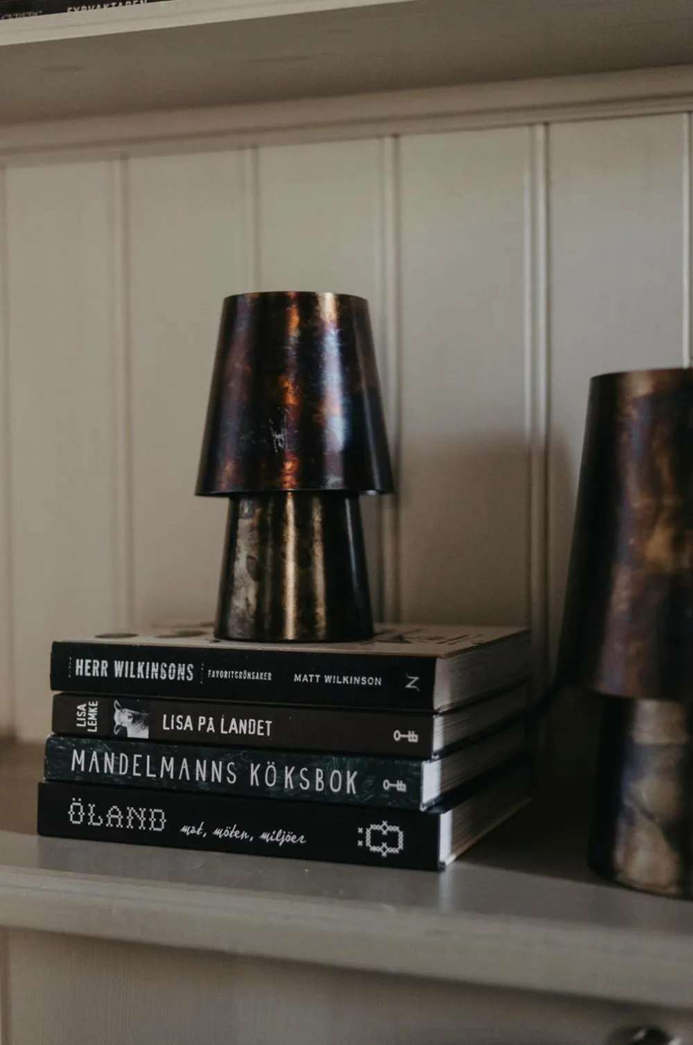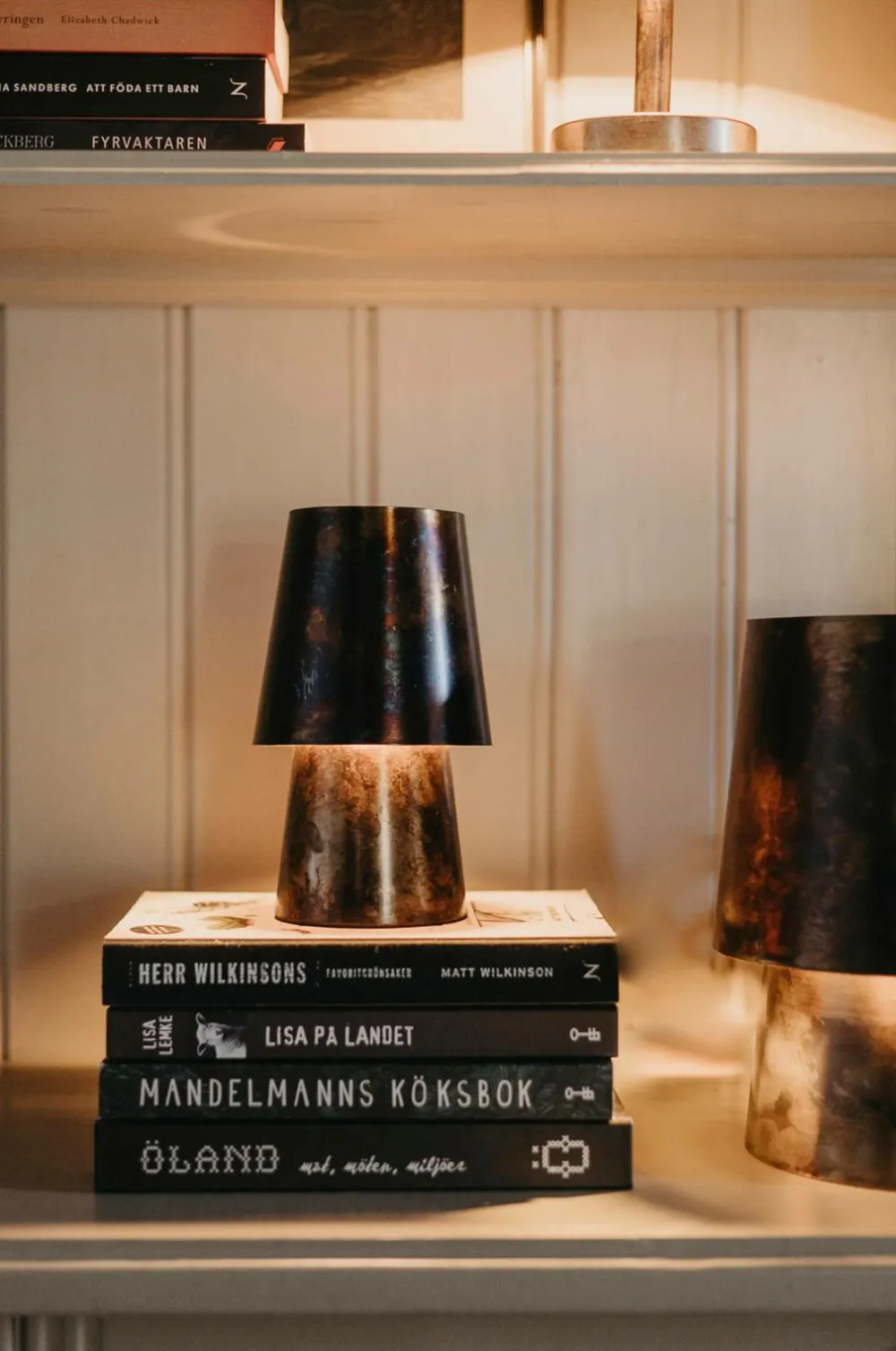 Svampelampen passer perfekt i et vindue, på en bogreol eller på en skænk. Giver et dekorativt lys både opad og nedad. Let at placere og fås i to overfladebehandlinger, der giver produktet en ekstra dimension og gør hvert produkt unikt. Fås i to størrelser og to finish.
