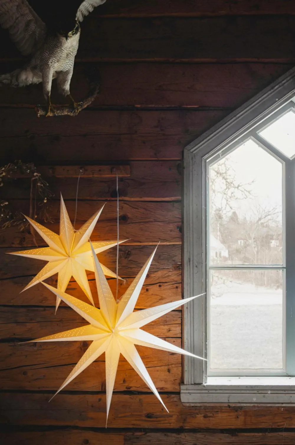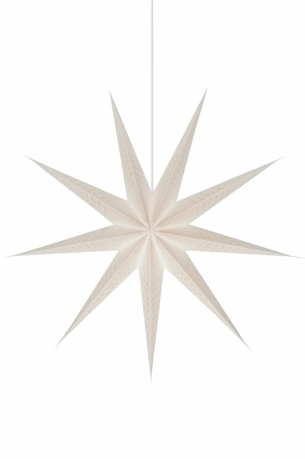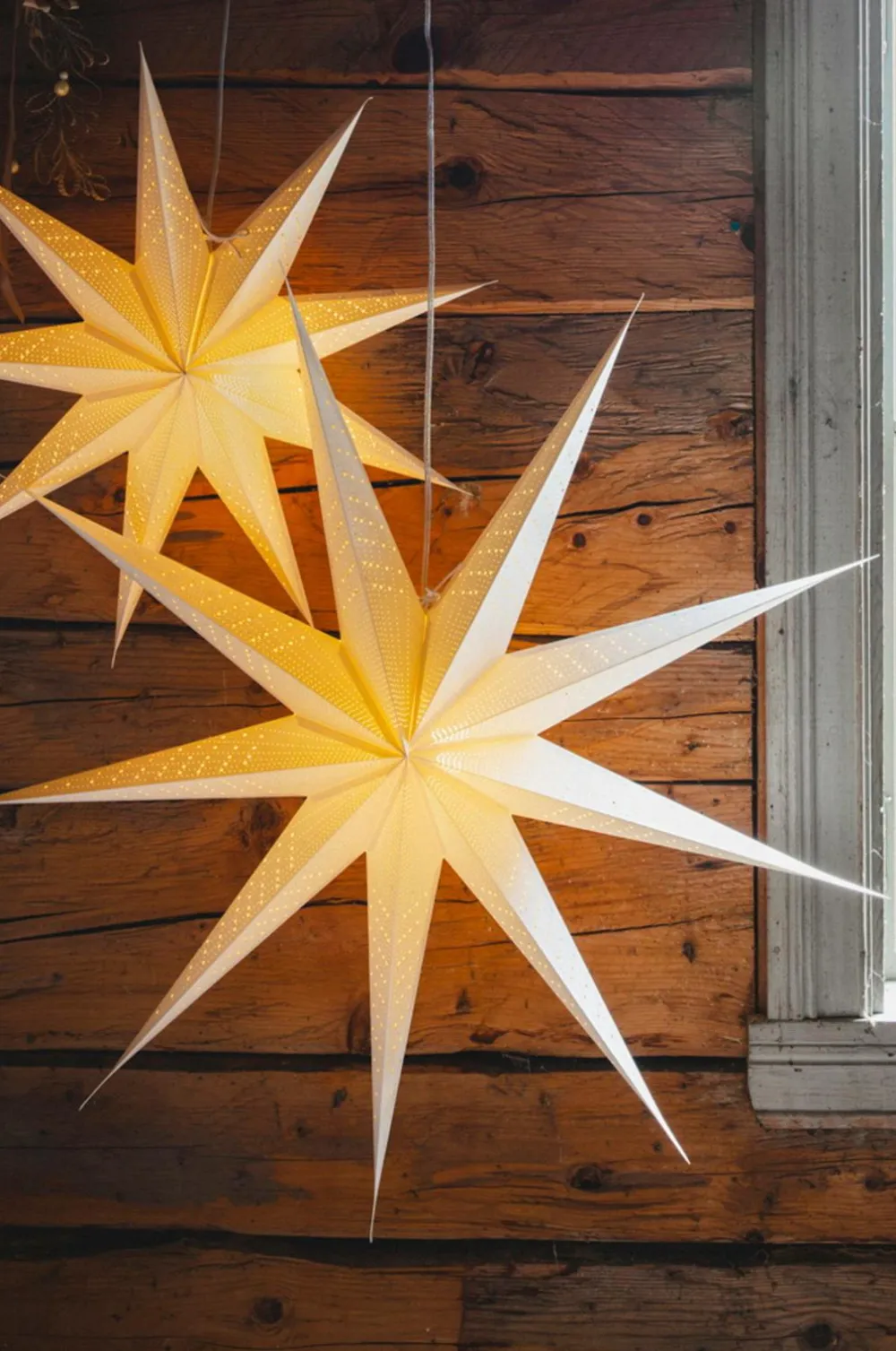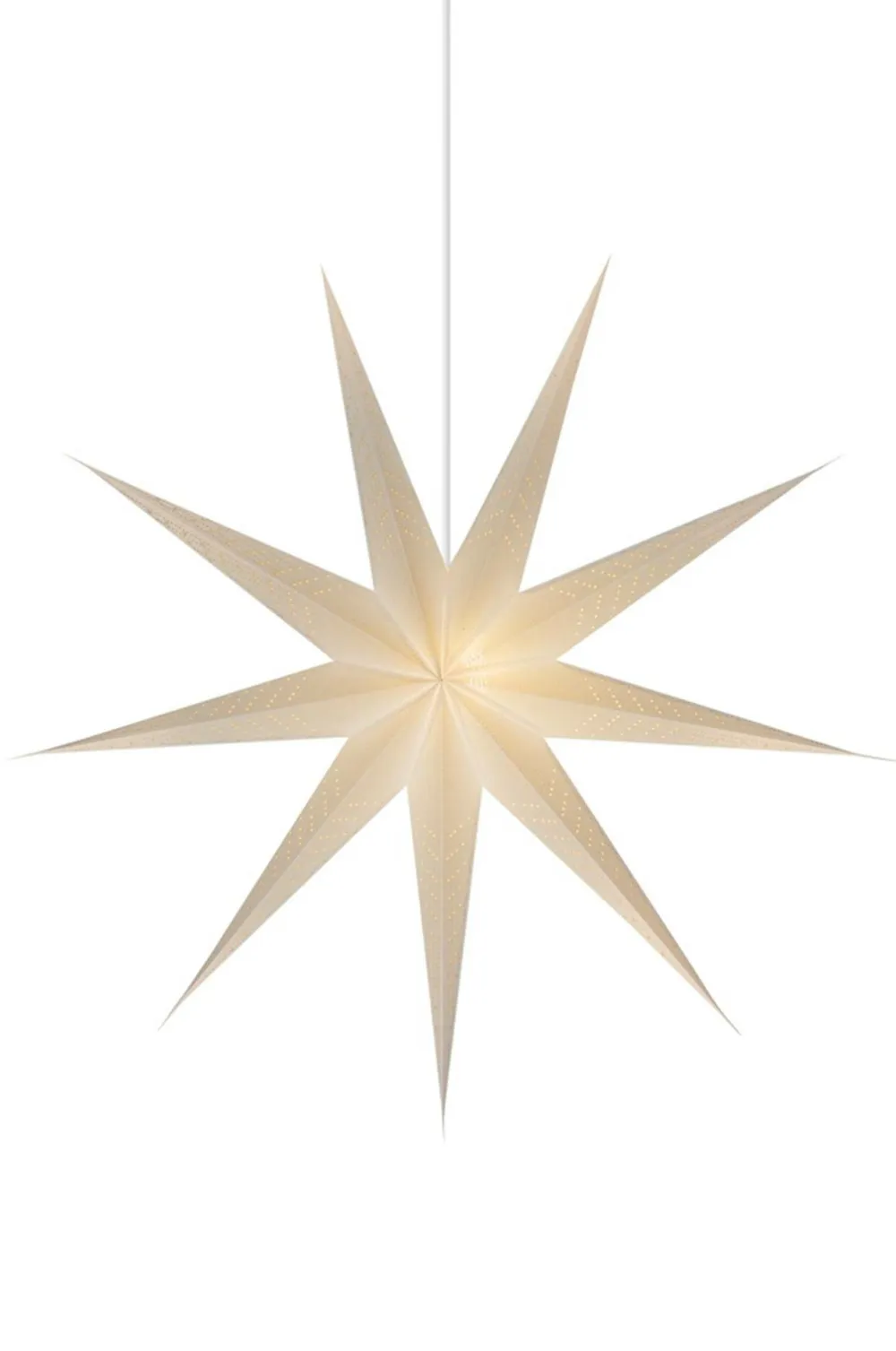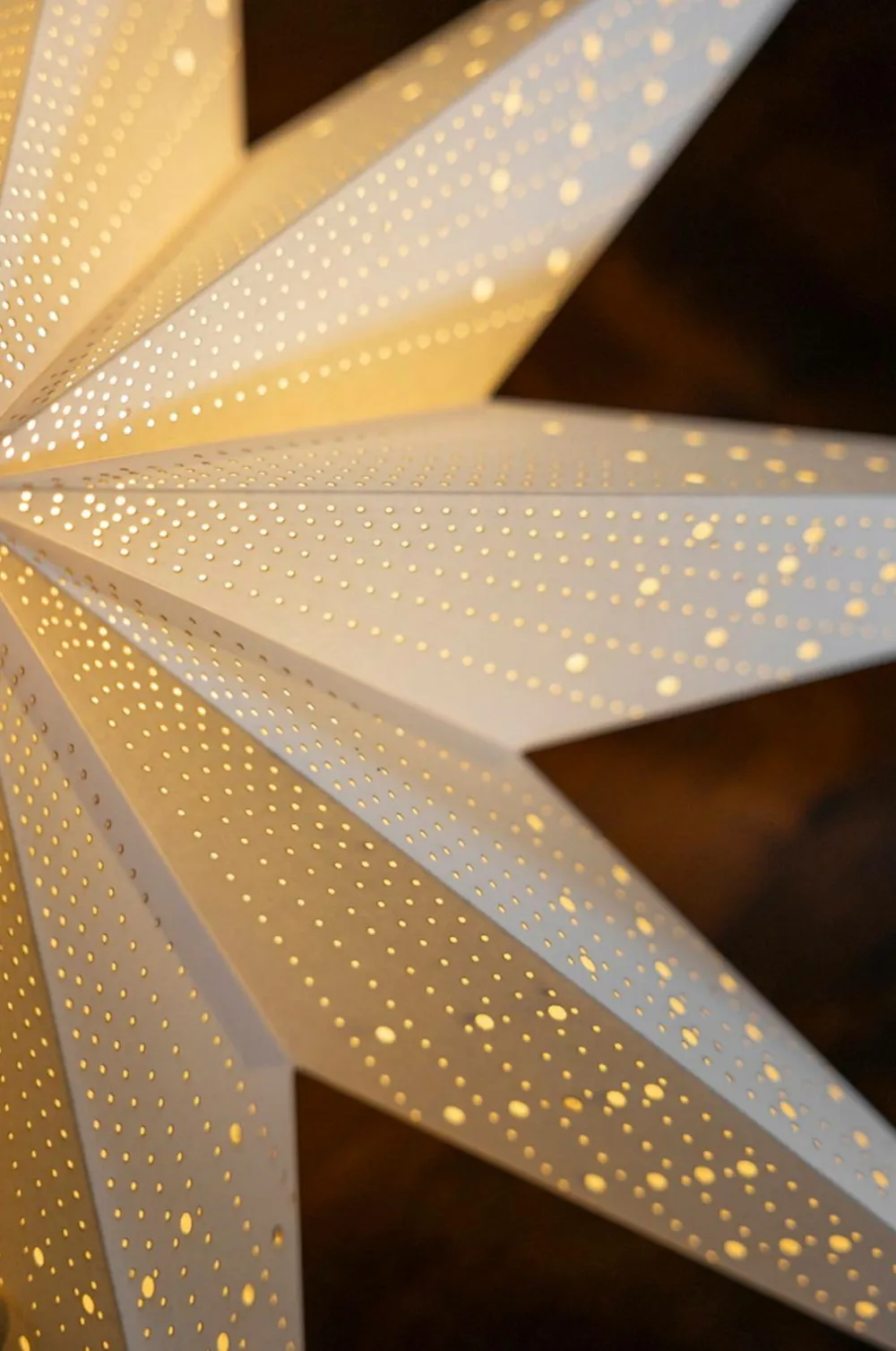 En klassisk hvid papstjerne i et slankt design, foldet i hånden af dygtige håndværkere og med et smukt hulmønster, der spreder en dejlig julestemning i hele rummet. Må kun bruges med LED-pære. Ledningssæt / loftophæng og lyskilde medfølger ikke.