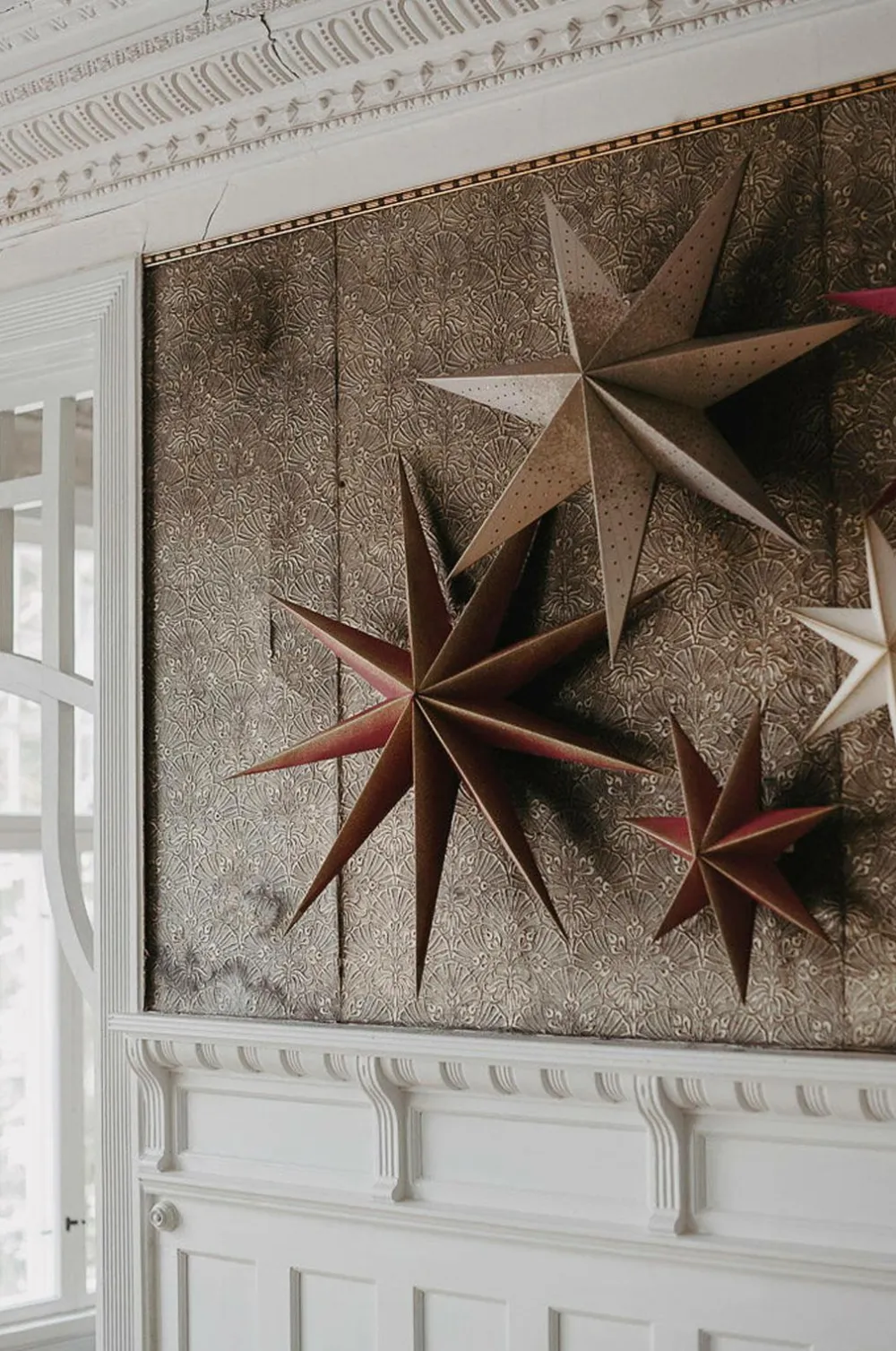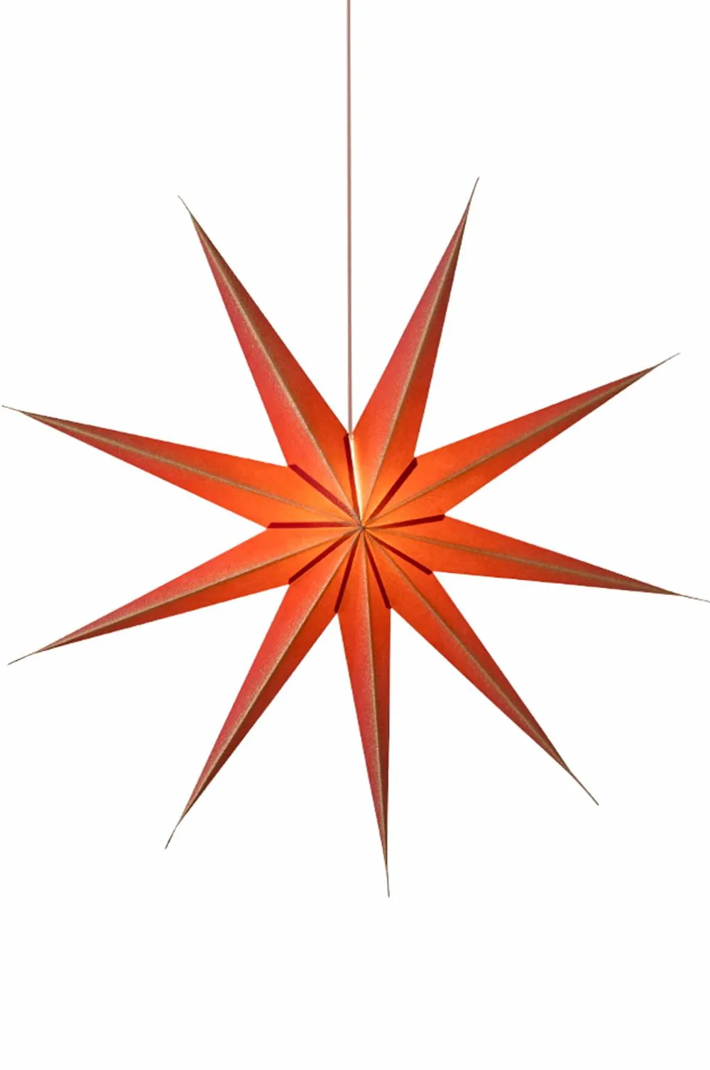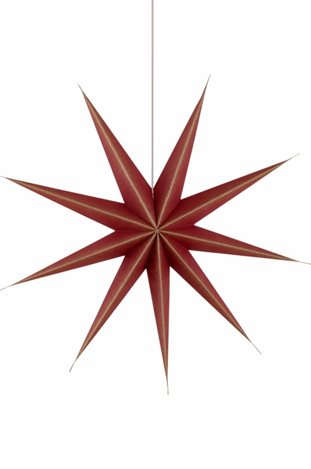 En håndlavet papstjerne i mørkerød med champagnefarvet glitter på hver spids. Må kun bruges med led-lampe. Ledningssæt / loftophæng og lyskilde medfølger ikke.