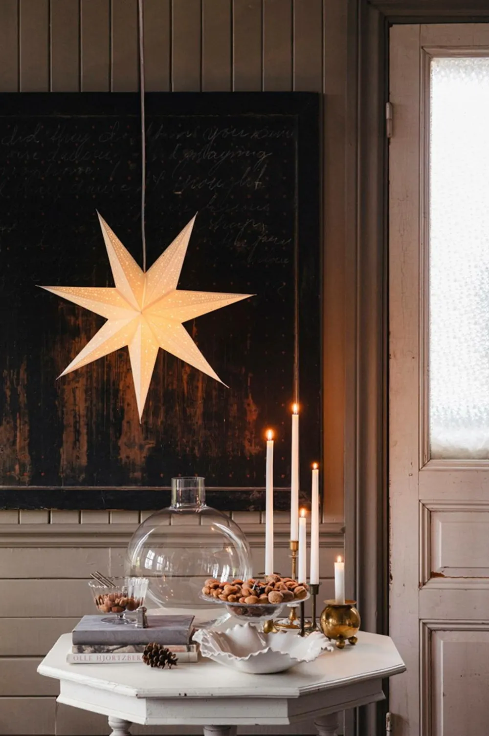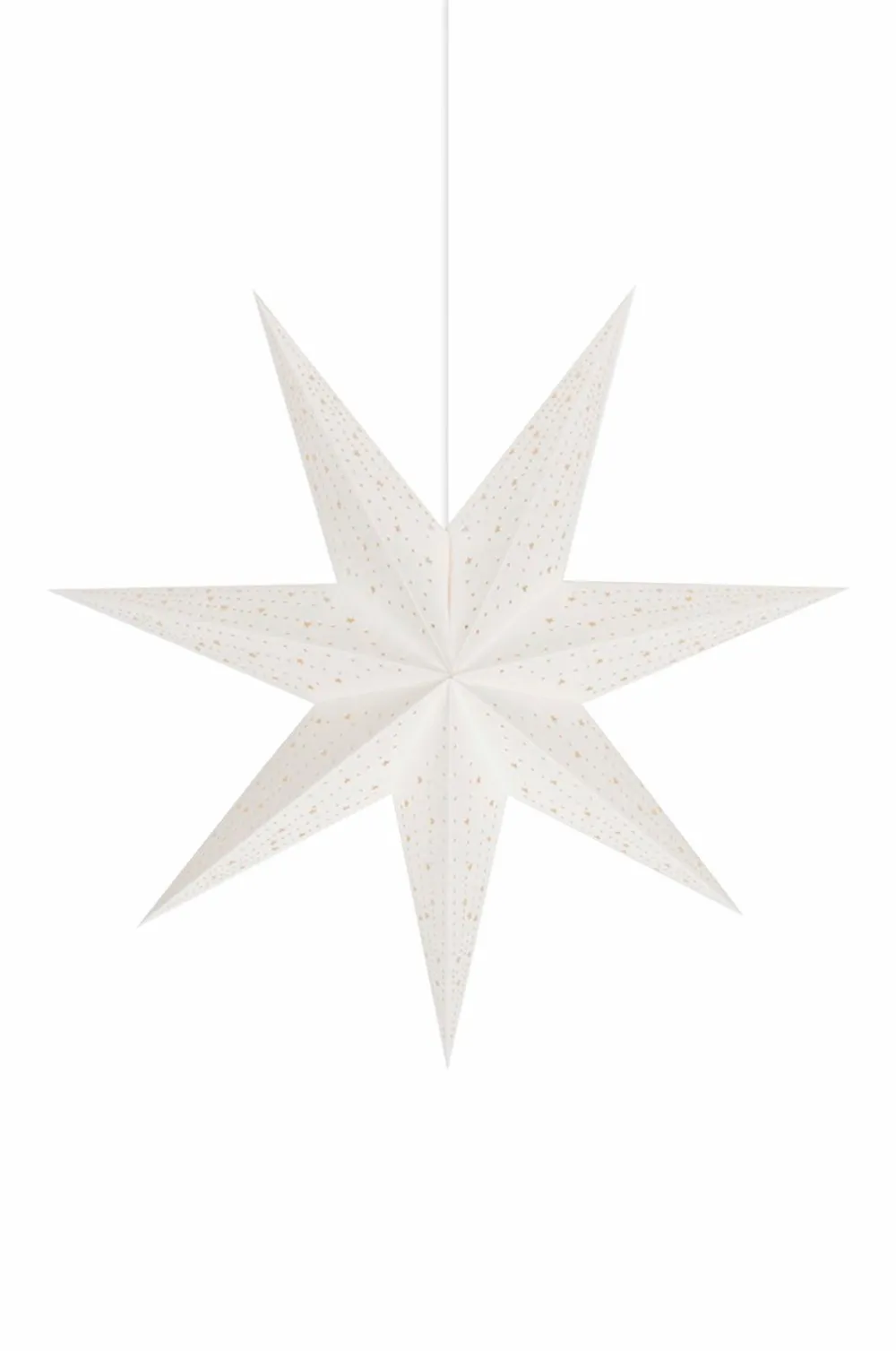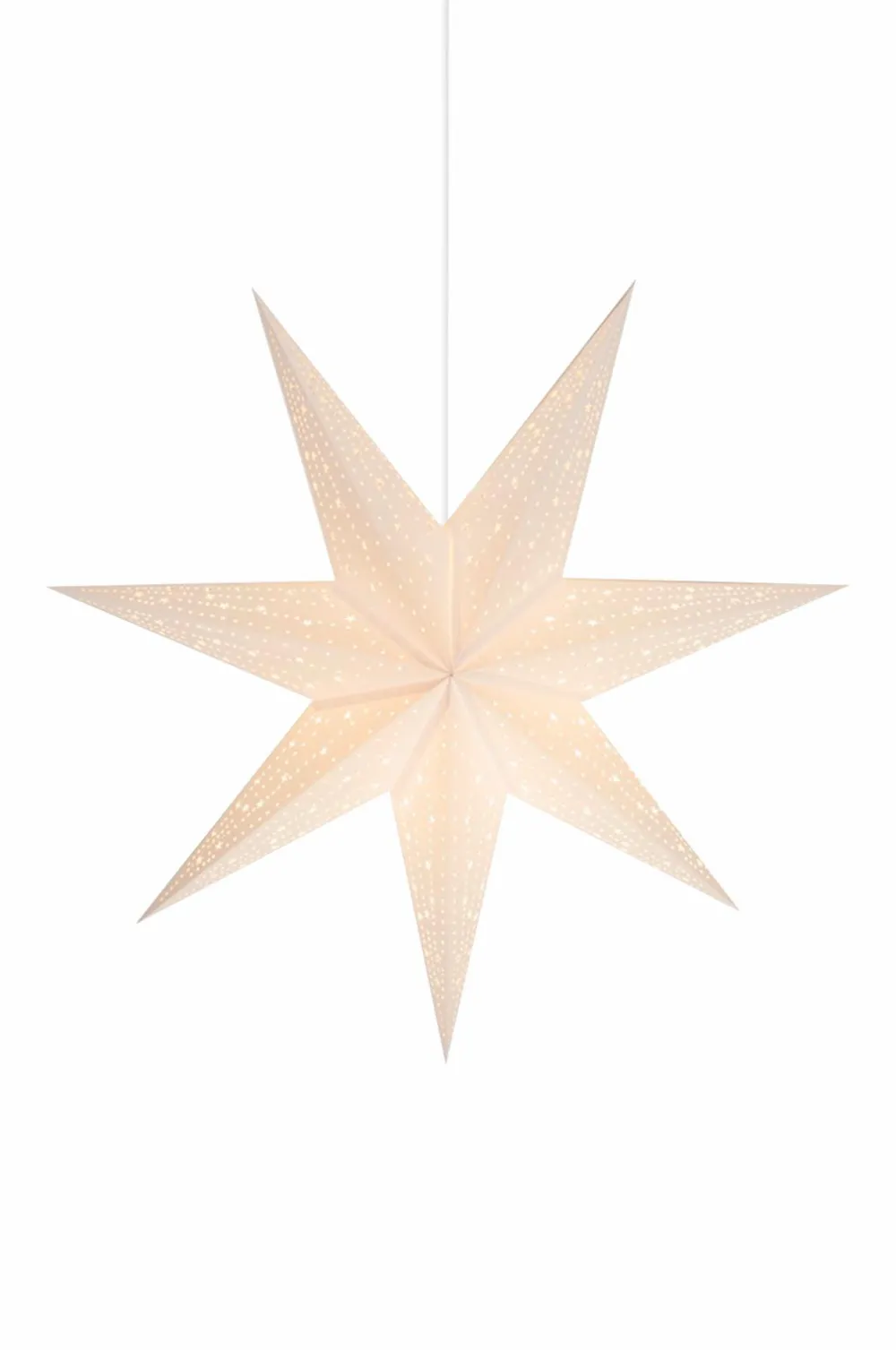 En klassisk stjerne af pap. Håndlavet med et smukt hulmønster i form af små mini-stjerner, der skaber den rette julestemning. Må kun bruges med LED-pære. Ledningssæt / loftophæng og lyskilde medfølger ikke.