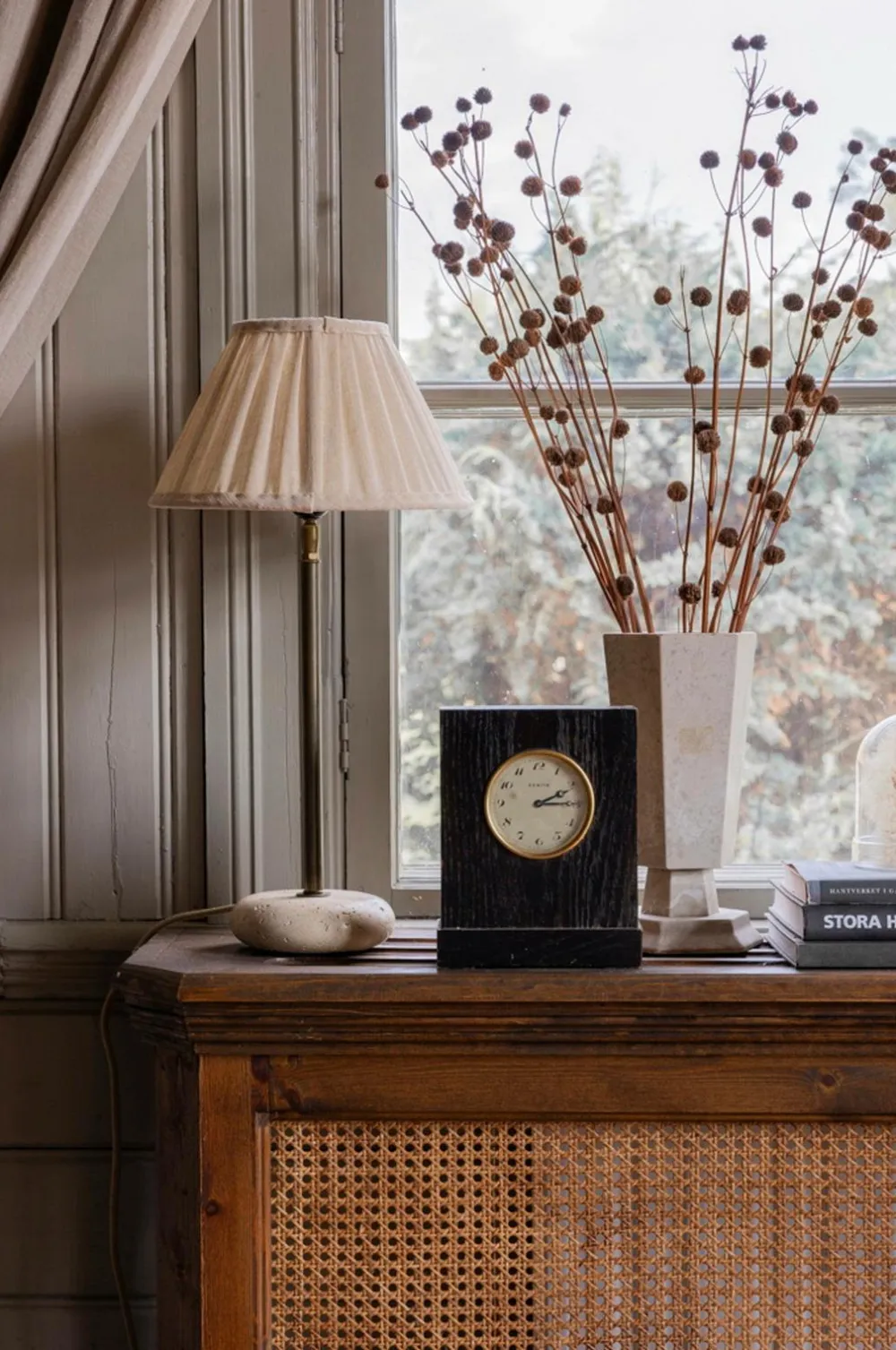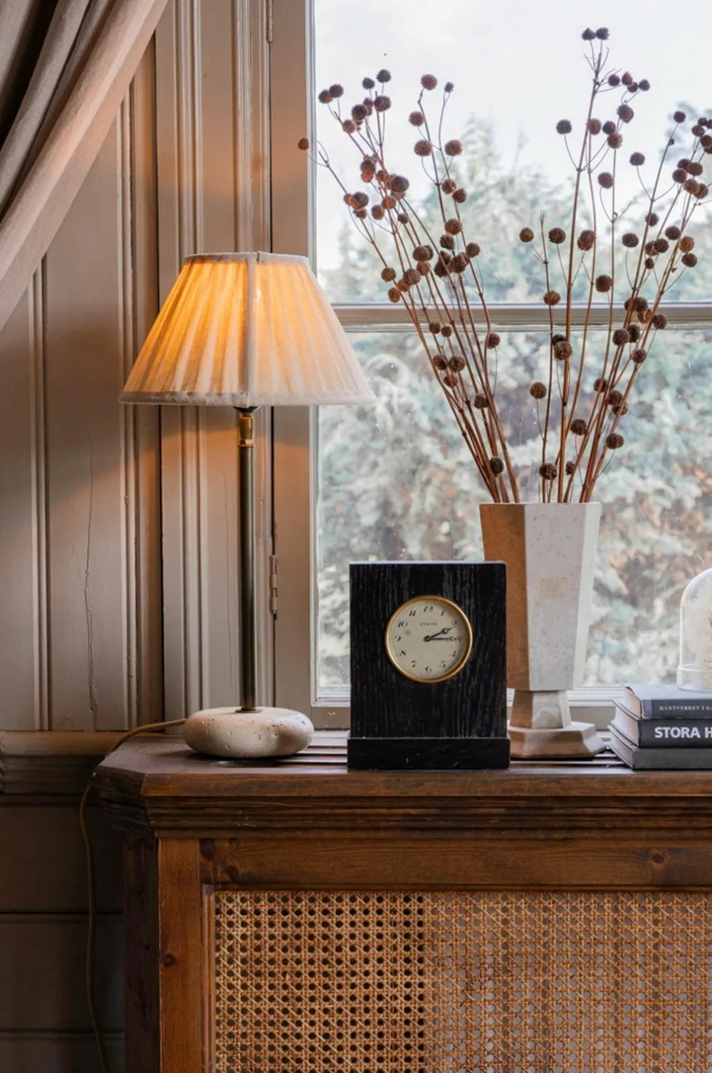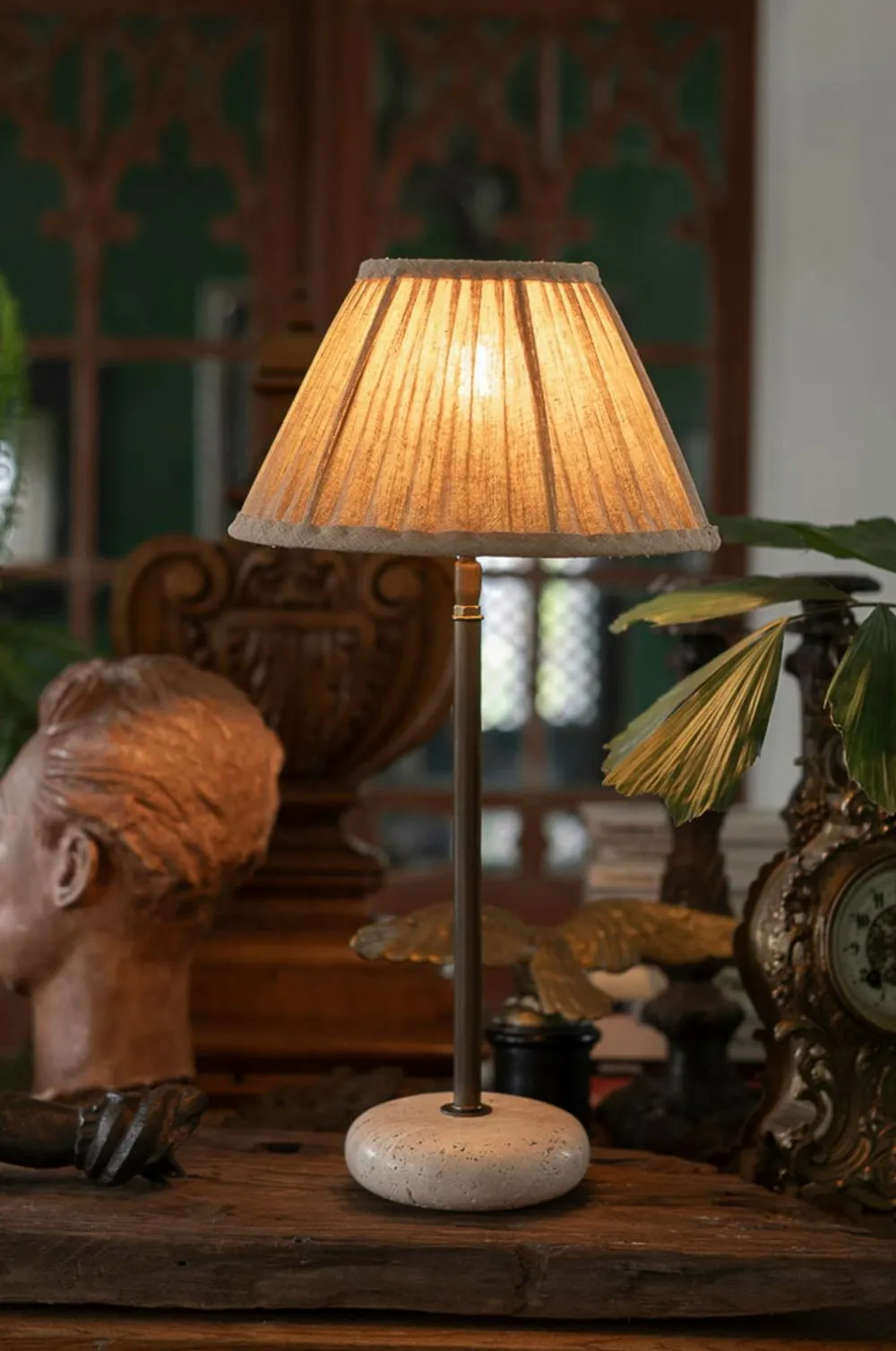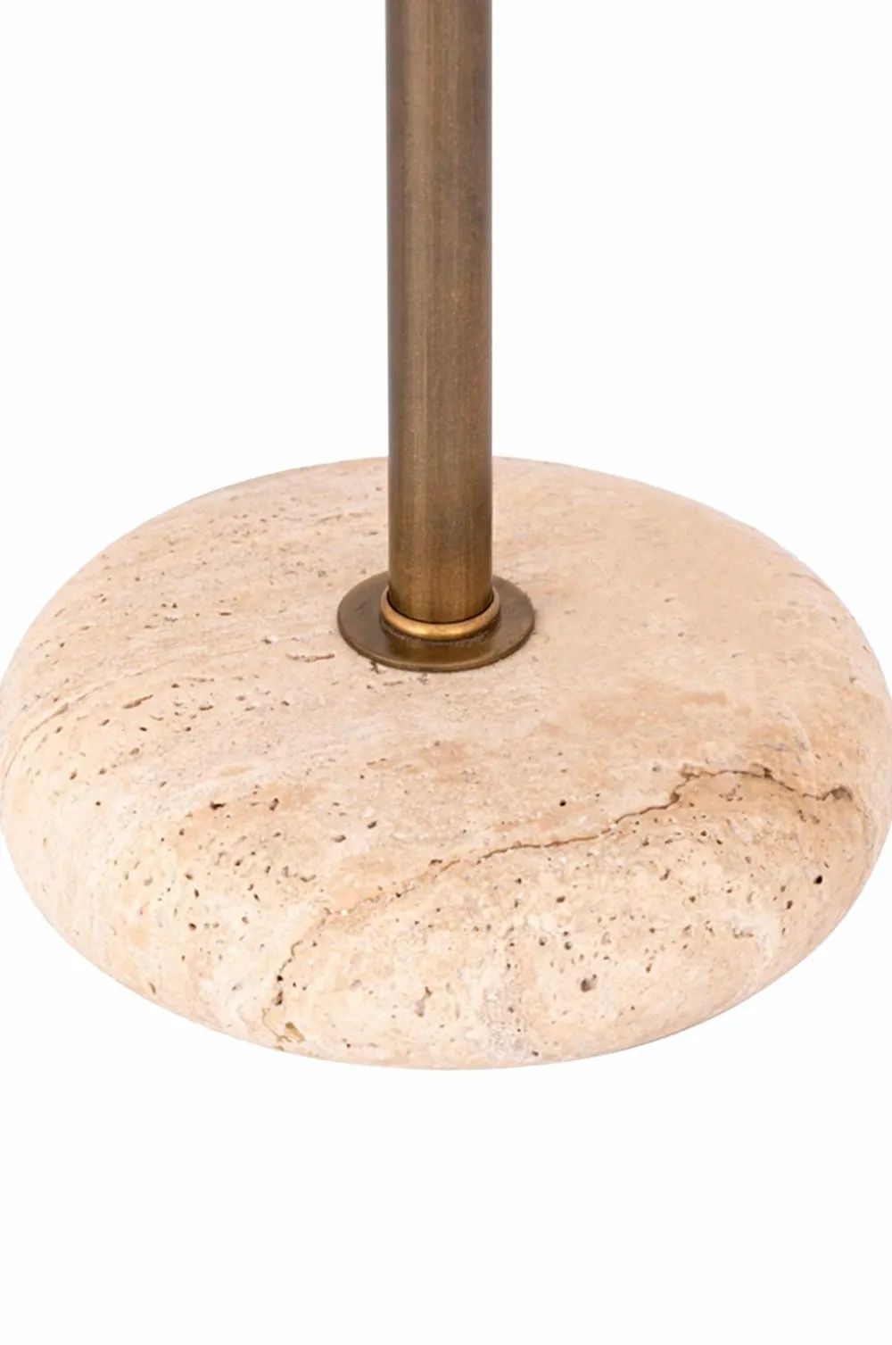 En smuk bordlampefod. Foden er drejet til en blød, afrundet form. En robust og stabil lampefod med antikfarvede messingdetaljer. Materialet er naturligt, og hver lampe er unik, da stenens farve varierer fra stykke til stykke. Praktisk med en kontakt på lampeholderen.