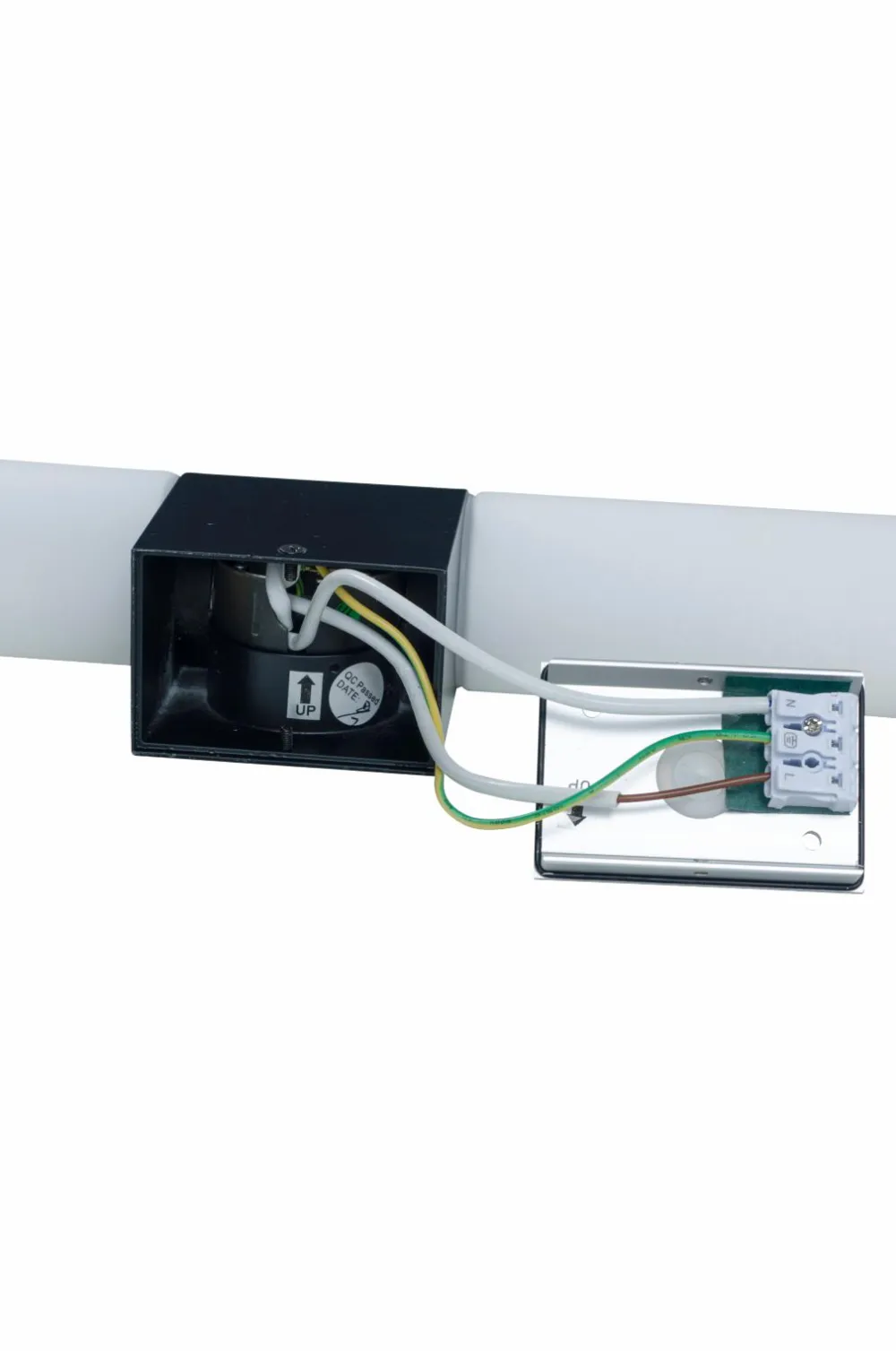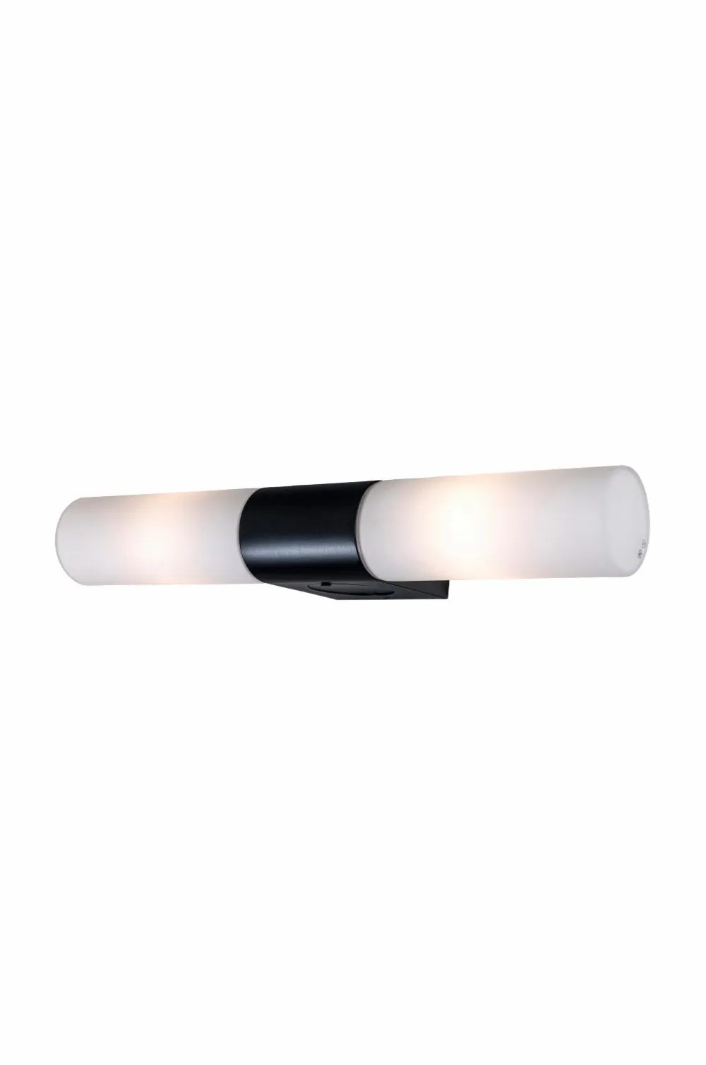 MARCO væglampe dobbelt IP44, krom. Væglampe til montering ovenfor spejlet i badeværelset med strømudtag. Slut f.eks. barbermaskinen eller hårtørreren direkte til lampen. Materiale: metal og glas.