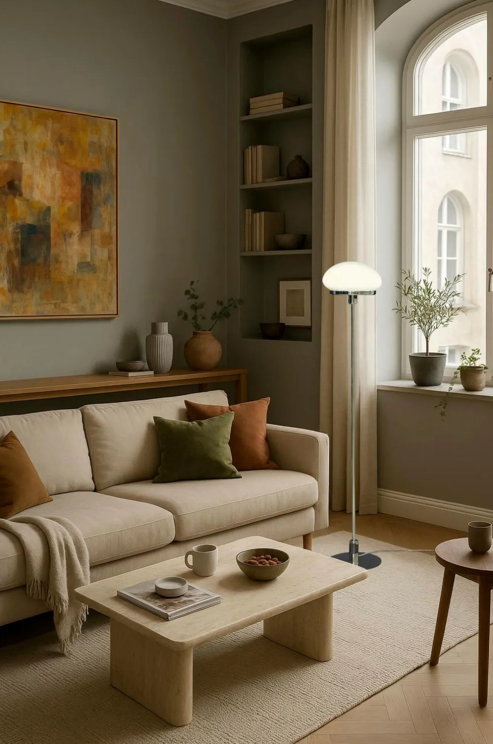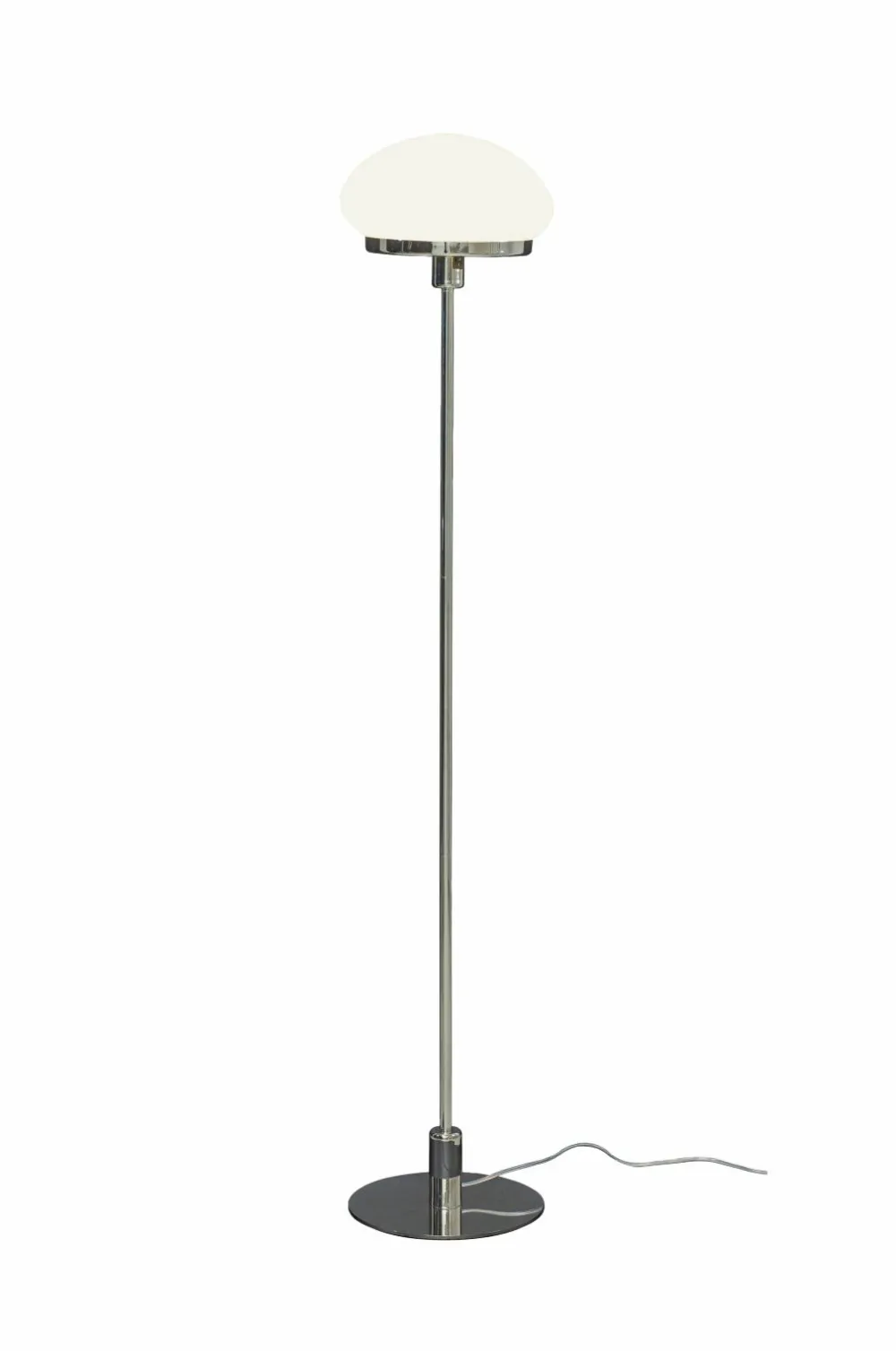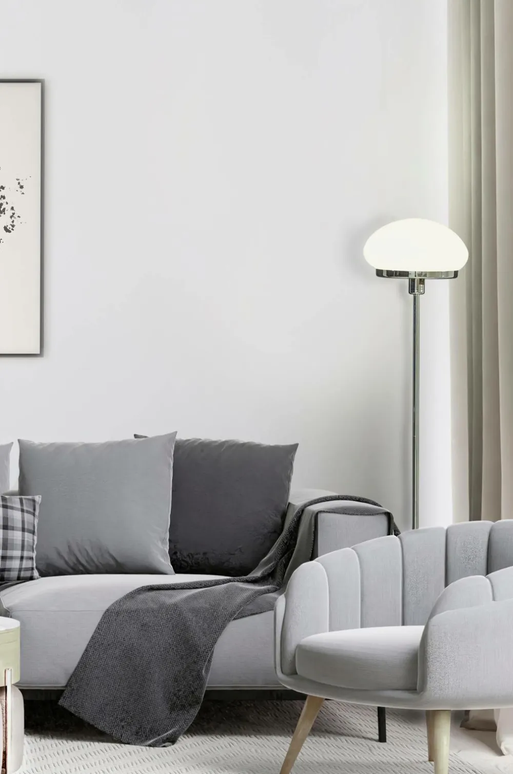 New august Gulvlampe i et stilfuldt design med metalfod og blankt glas, der giver et blødt og behageligt lys. Den bliver en smuk indretningsdetalje, der skaber en indbydende atmosfære i stuen eller hallen.