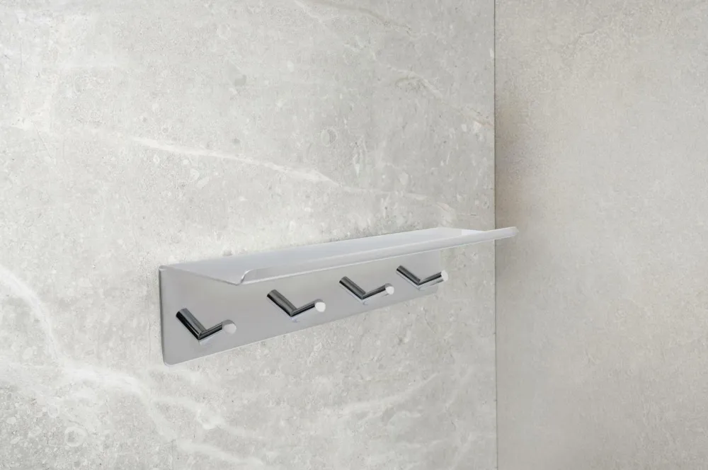 Base – Krogskinne med hylde er den perfekte løsning til at opfylde nutidens badeværelsesbehov og samtidig tilbyde et slankt design. Fremstillet af solidt rustfrit stål. Vi har kombineret fire funktionelle kroge til elegant ophængning med en praktisk hylde, der giver dig mulighed for at opbevare smykker, dekorere med en smuk vase eller tænde et duftlys for at skabe den rette atmosfære. Kombinationen af kroge og hylde gør Beslag Designs knagerække til en pladsbesparende og alsidig løsning til badeværelset. Med sit minimalistiske og moderne design passer den perfekt ind i forskellige badeværelsesstile og skaber en harmonisk orden. Kroghylden har en selvklæbende bagside, der gør det nemt at installere den uden at skulle lave unødvendige huller.