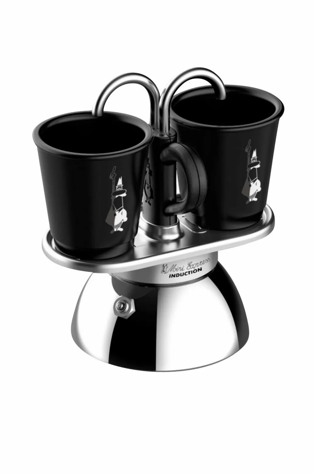 Et klassisk design, som i dag er meget unikt. Placer bryggeren direkte på komfuret med en kop under kranen. Når bryggeren har brygget, tager du bare koppen direkte til servering. passer til alle typer kogeplader. 2 sorte, matte kopper og sølvlogo