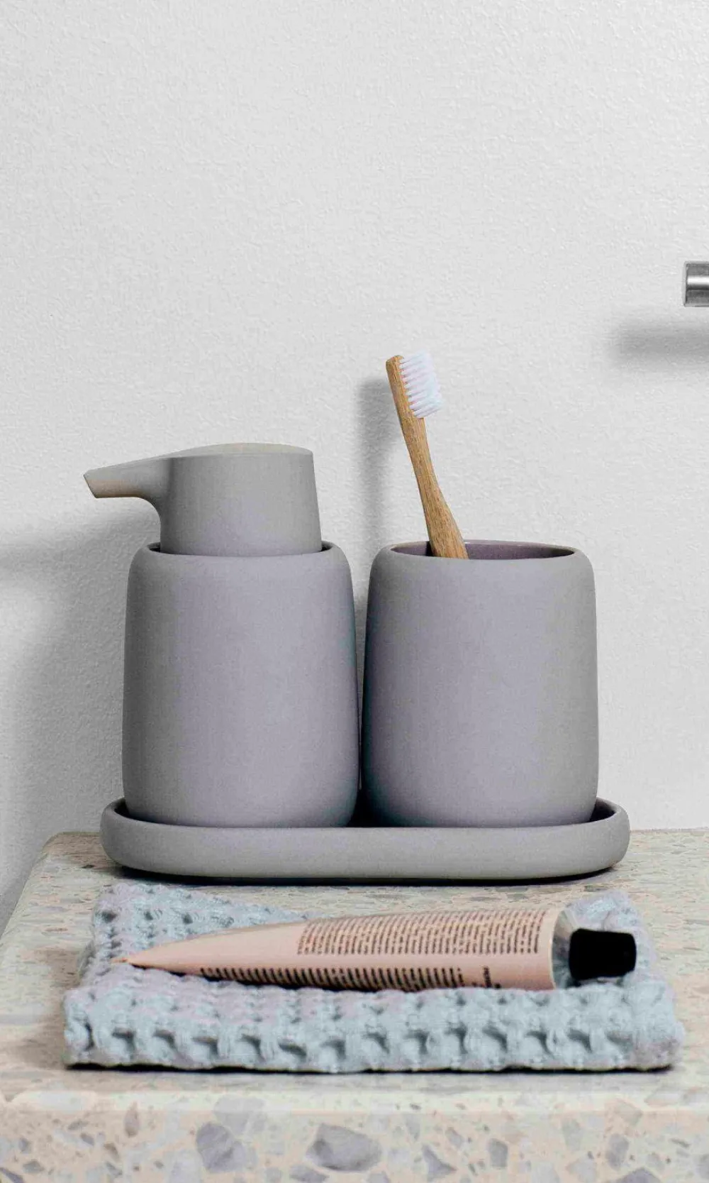 SONO keramisk sæbepumpe fra Blomus taler et roligt og fredfyldt formsprog.