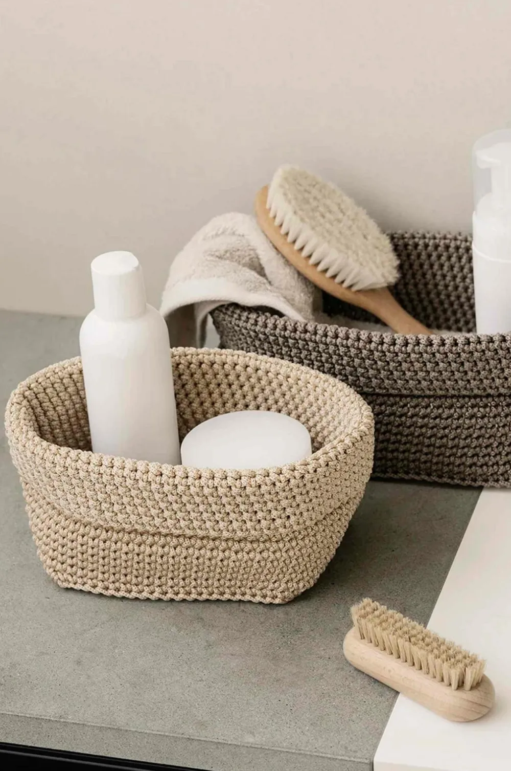 Smuk kurv i hæklet tekstil. Praktisk opbevaring på badeværelset til alle småting om makeup, pads eller vatpinde. Kan også bruges som brødkurv eller opbevaring på kontor eller børneværelse.