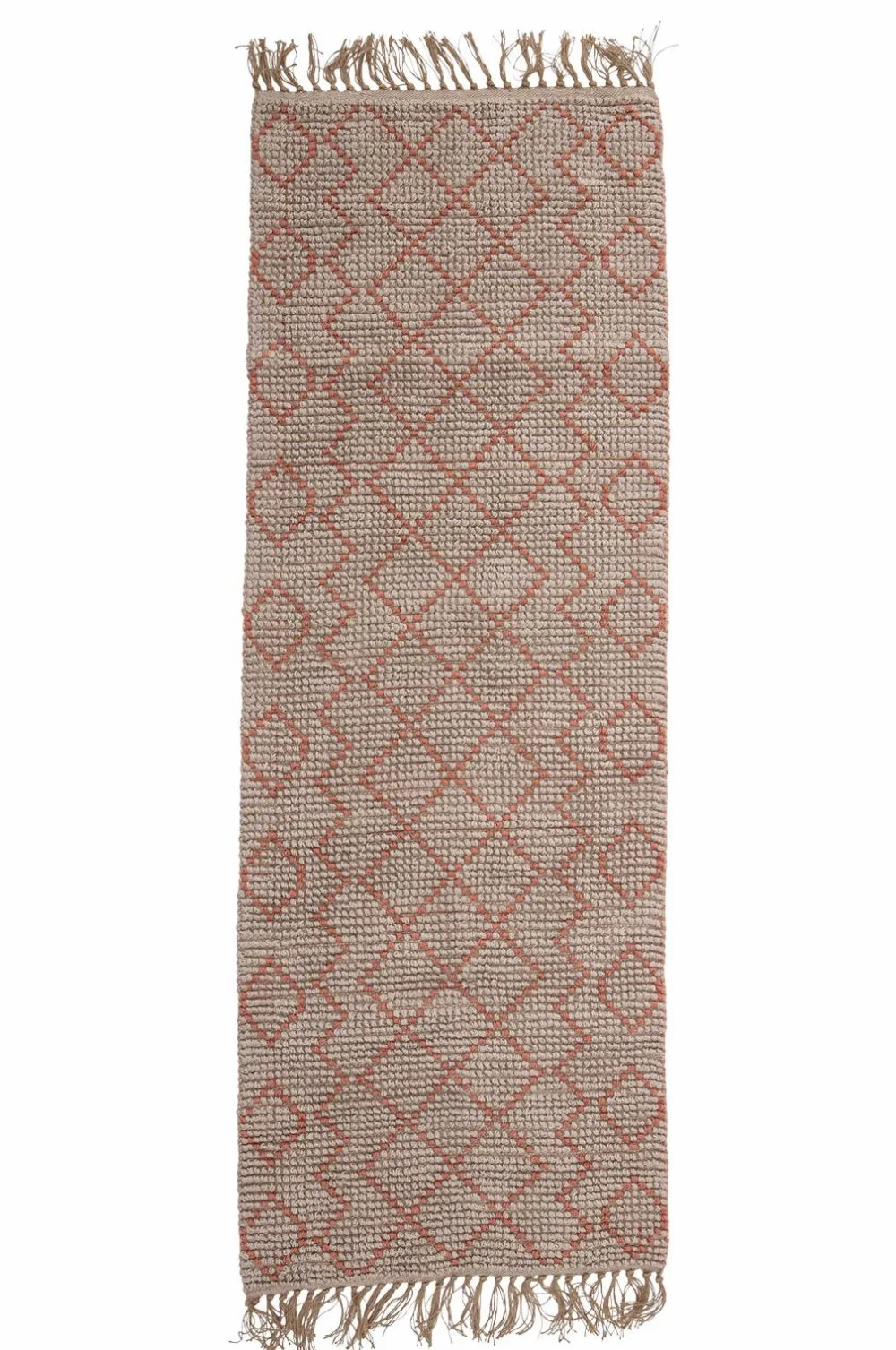 Abriella gulvtæppe fra Bloomingville er et smuk, vævet tæppe af jute. Gulvtæppet har et geometrisk, orange rombemønster på naturfarve, og har frynser i begge sider. Det er så behageligt at du altid vil gå barfodet på det.