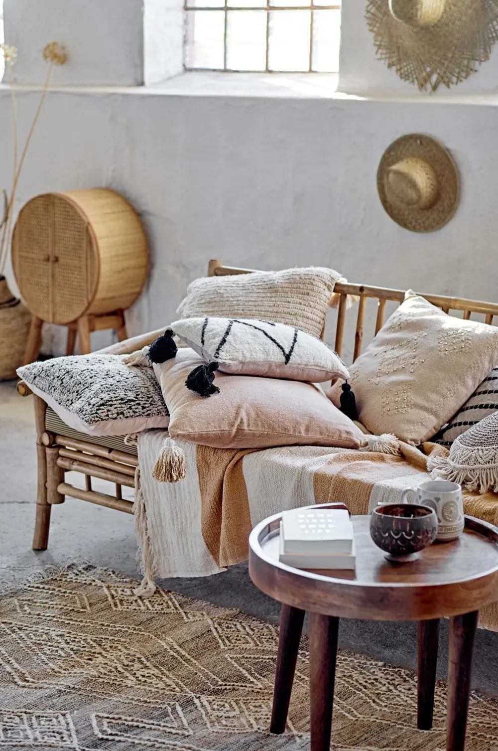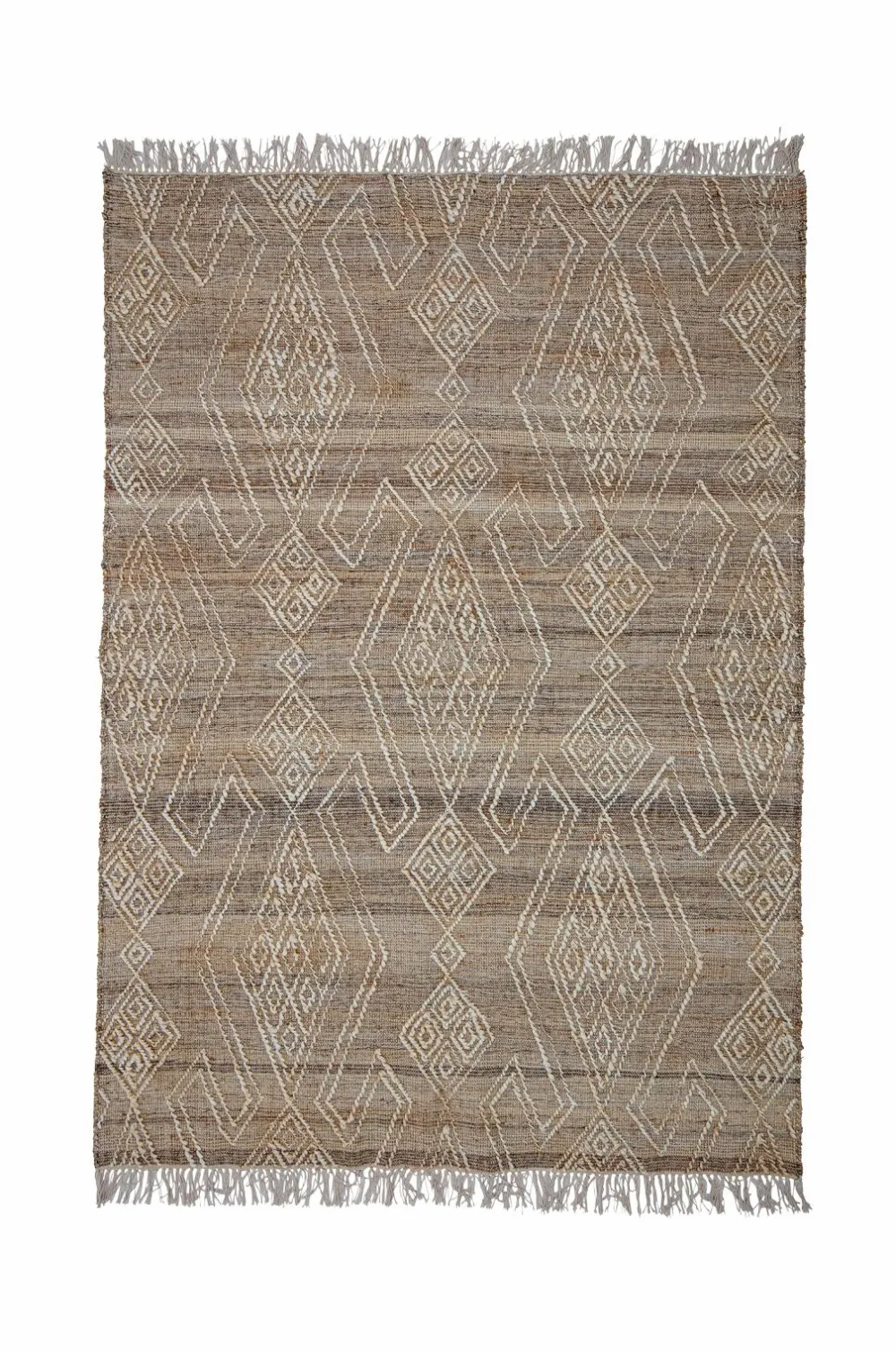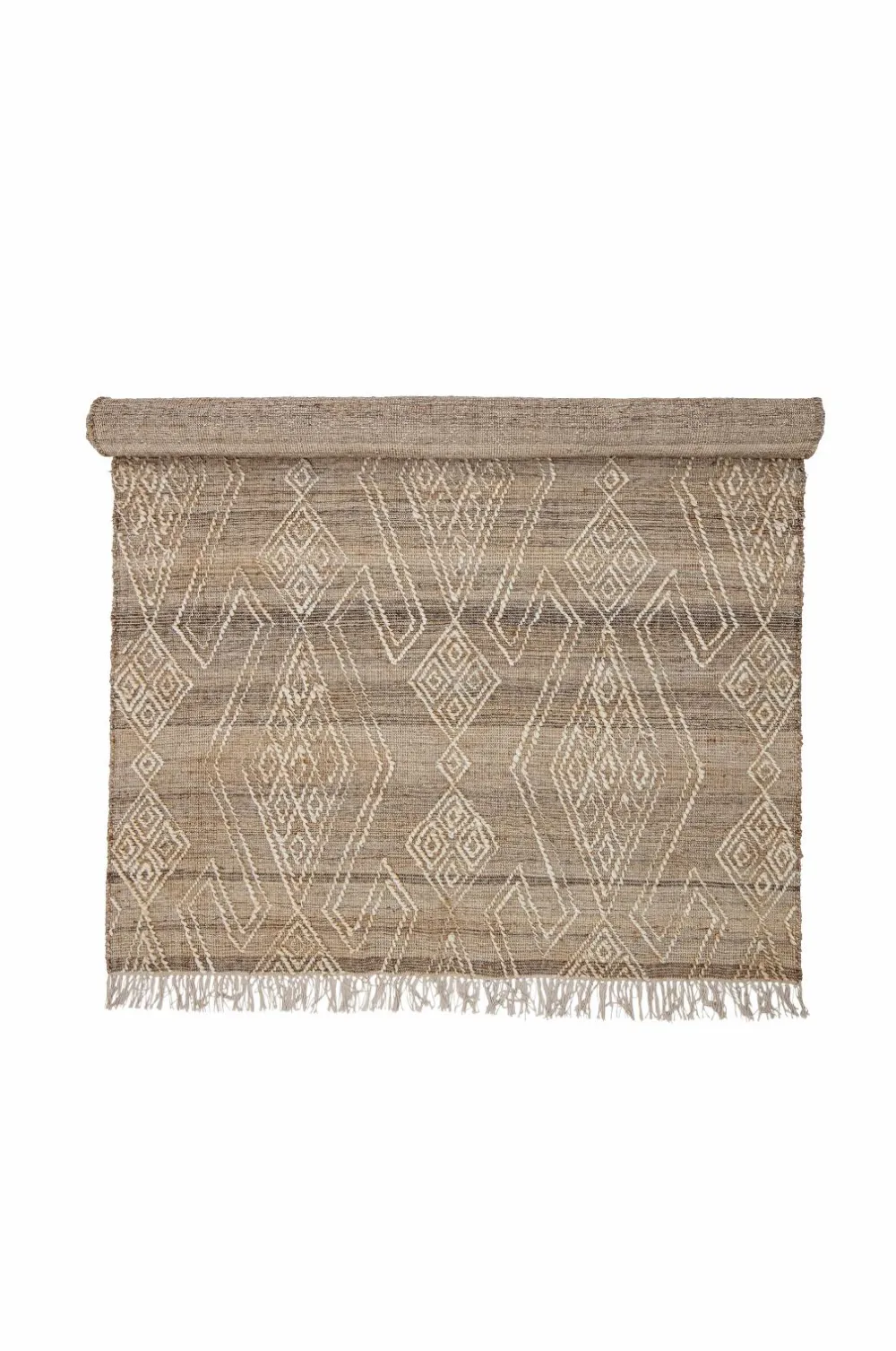 Rupen tæppe fra Bloomingville er et smukt, vævet tæppe af jute og uld. Gulvtæppet har et fint tone-i-tone-mønster i naturfarve, med små frynser i begge ender. Det er så behageligt at du altid vil gå barfodet på det.