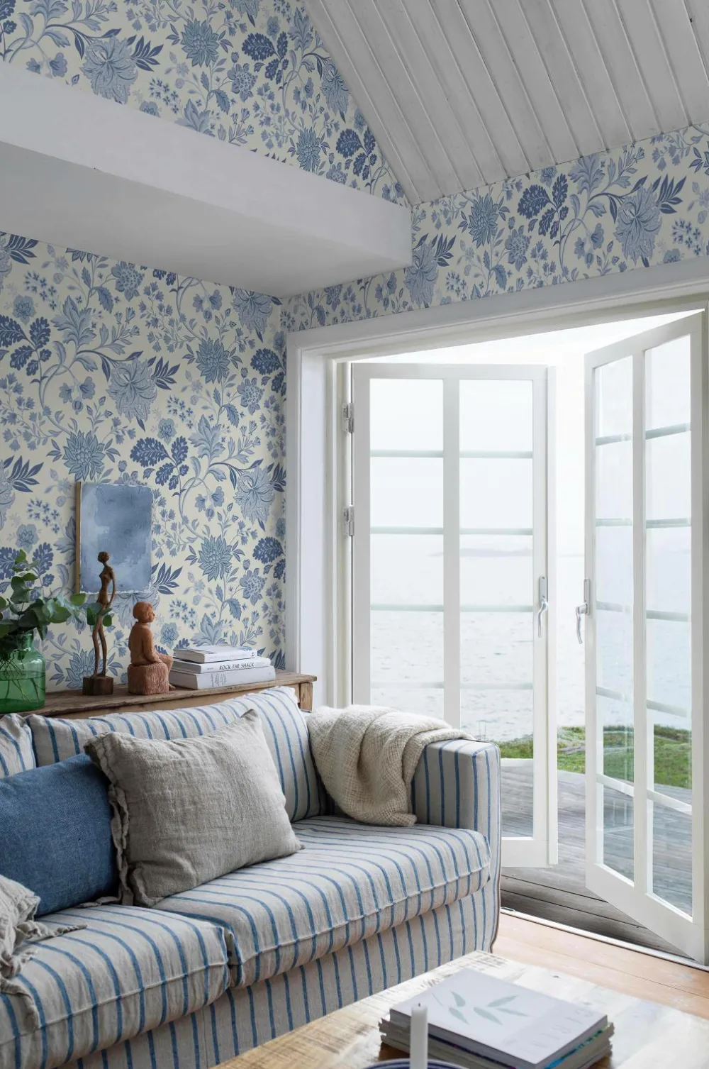 Blomstertapetet Alicias smukke mønster blev håndmalet i af Sissa Sundling i 2015. Hver rulle er 10,05 m. Bredde 53 cm. Forskudt mønsterrapport 64 cm. Printet i Sverige på et non-woven materiale. Tapetet er Easyup-mærket, hvilket betyder, at du påfører limen direkte på væggen, og du behøver ikke grunde først.