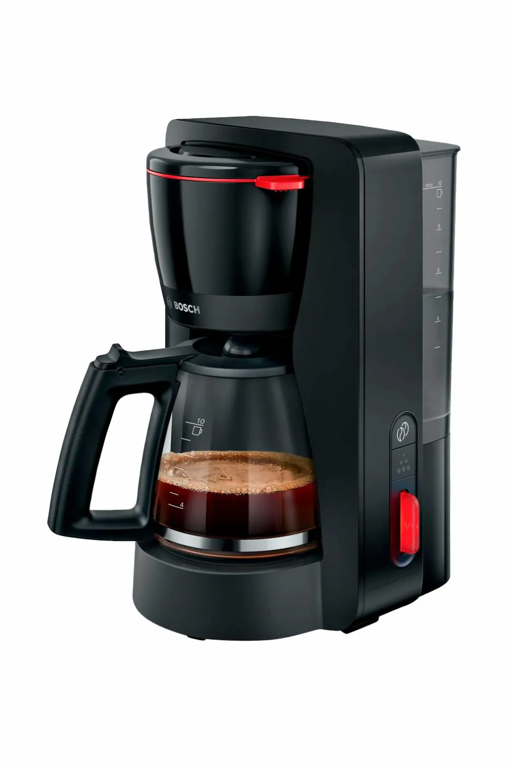 Kaffebryggaren har en aftagelig vandtank og en funktion til at holde kaffen varm, og den har et slankt design med skinnende detaljer, der giver dynamik til dit køkken.