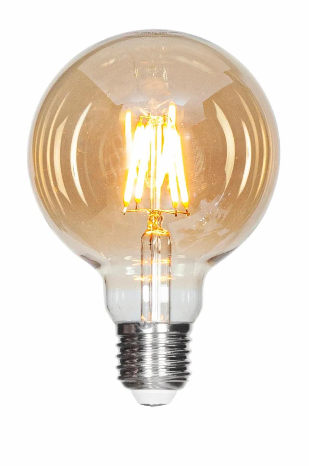 En globeformet LED-pære med en diameter på 95 mm. Pæren kan dæmpes, når den tilsluttes en dæmper