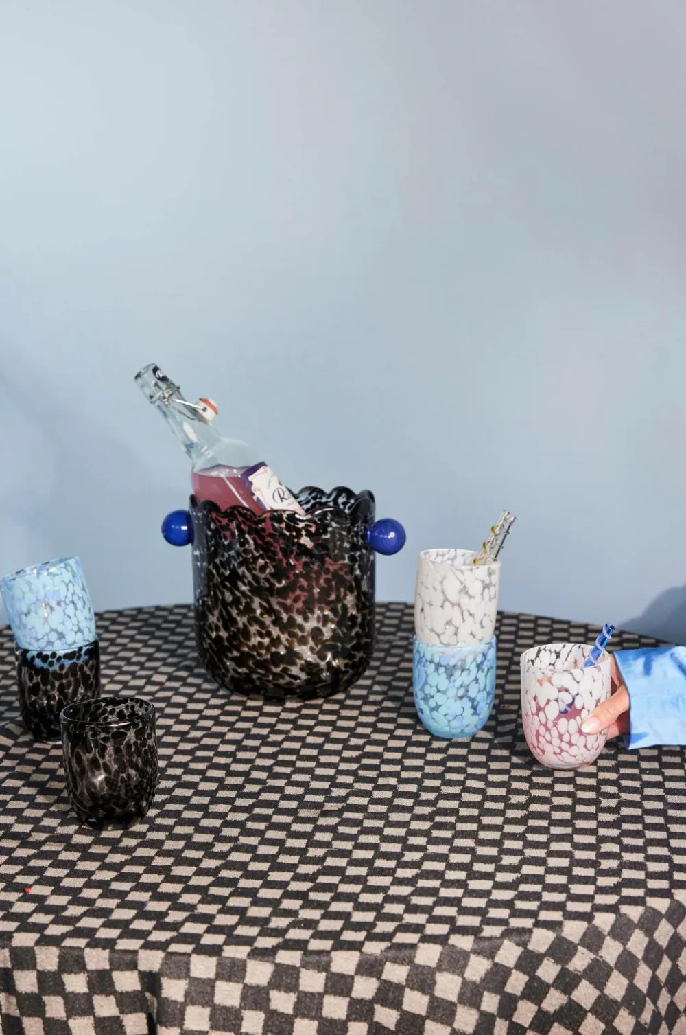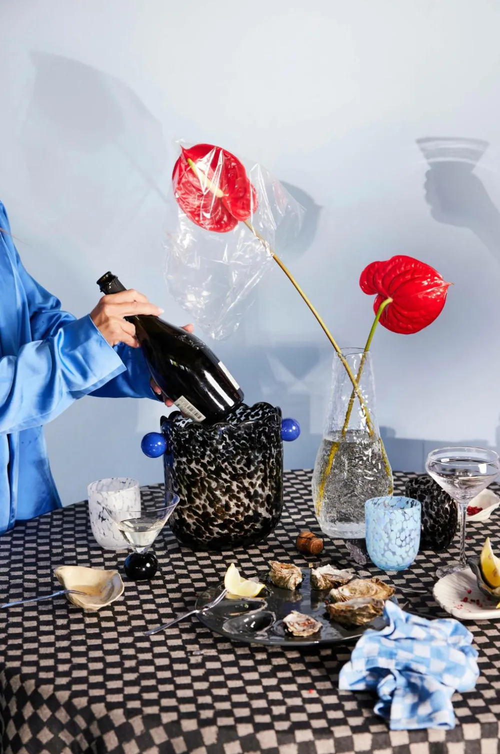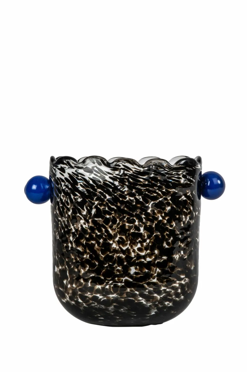 Serien Messy er både legesyg og sjov at bruge til servering. Den indbyder til at lave kreative drikke og være lidt drilsk. Vasen, vinkøleren eller puncheskålen Messy er lige så flot som sine familiemedlemmer og leverer flere anvendelsesområder, kun fantasien sætter grænser. Formen er oval, så den passer ind overalt, og den er dekoreret med to runde håndtag i power-blue. Det tykke glas er håndlavet og mundblæst i klare sorte toner. Alle glas er unikke på deres egen måde – ligesom dig. Farve- og teksturforskelle kan forekomme. Tåler opvaskemaskine. Designet af Byon Studio. 26,5×14,5×21,5cm