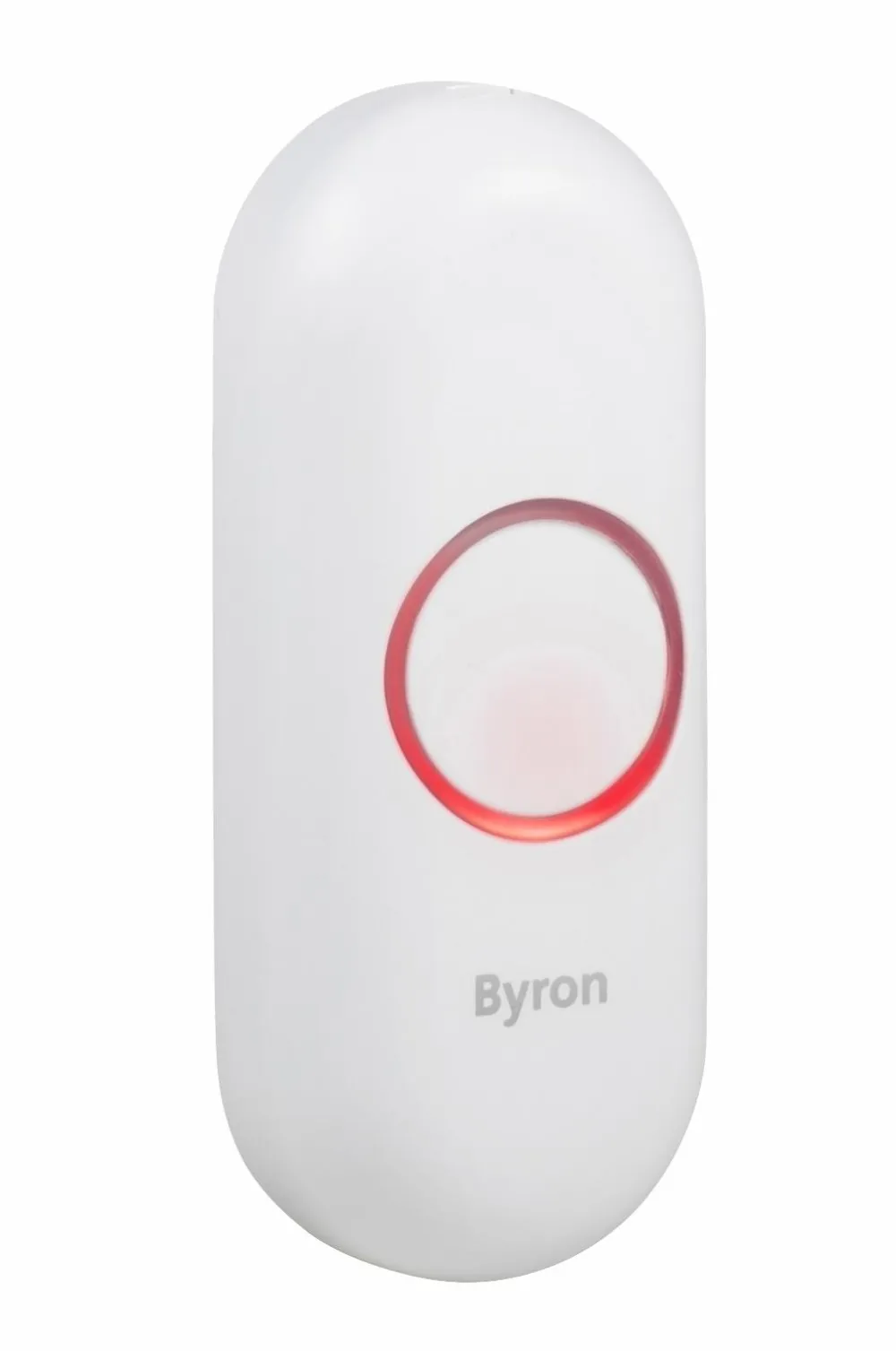 BY510 trådløs trykknap til DBY-dørklokker med LED-indikator. Kompatibel med Byron DBY-serien og har en rækkevidde på op til 100 m. Den kan tilsluttes maksimalt 2 dørklokker. Monteres nemt med 3M-tape. Inkluderer CR2032-batteri og bruger en frekvens på 433 MHz. Kan monteres på væggen og er trådløs. Kompatibel med Byron BY-serien.