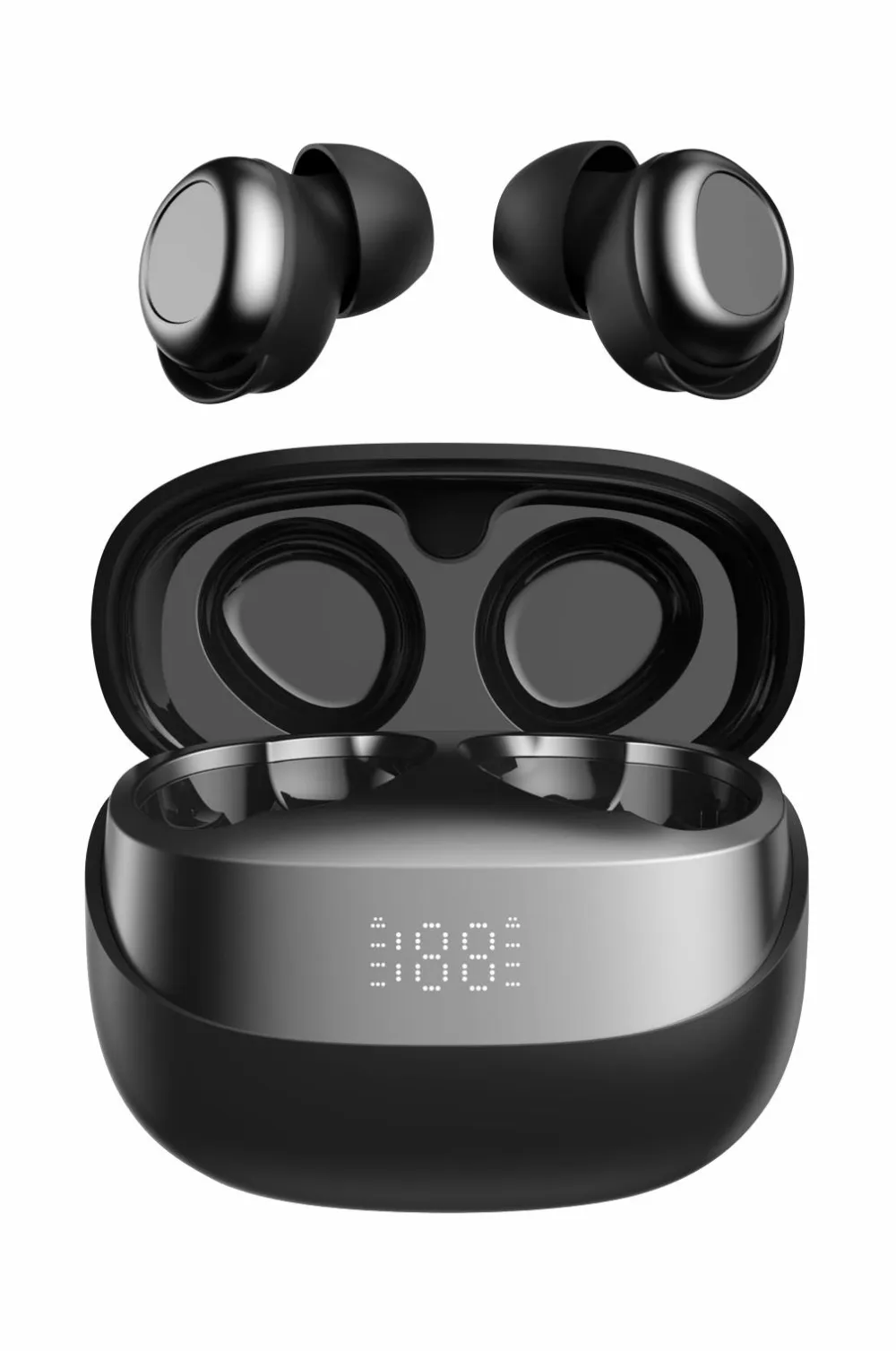 Leveres med et opladningsetui. LED-displayet på opladningsetuiet viser den resterende opladning i høretelefonerne.