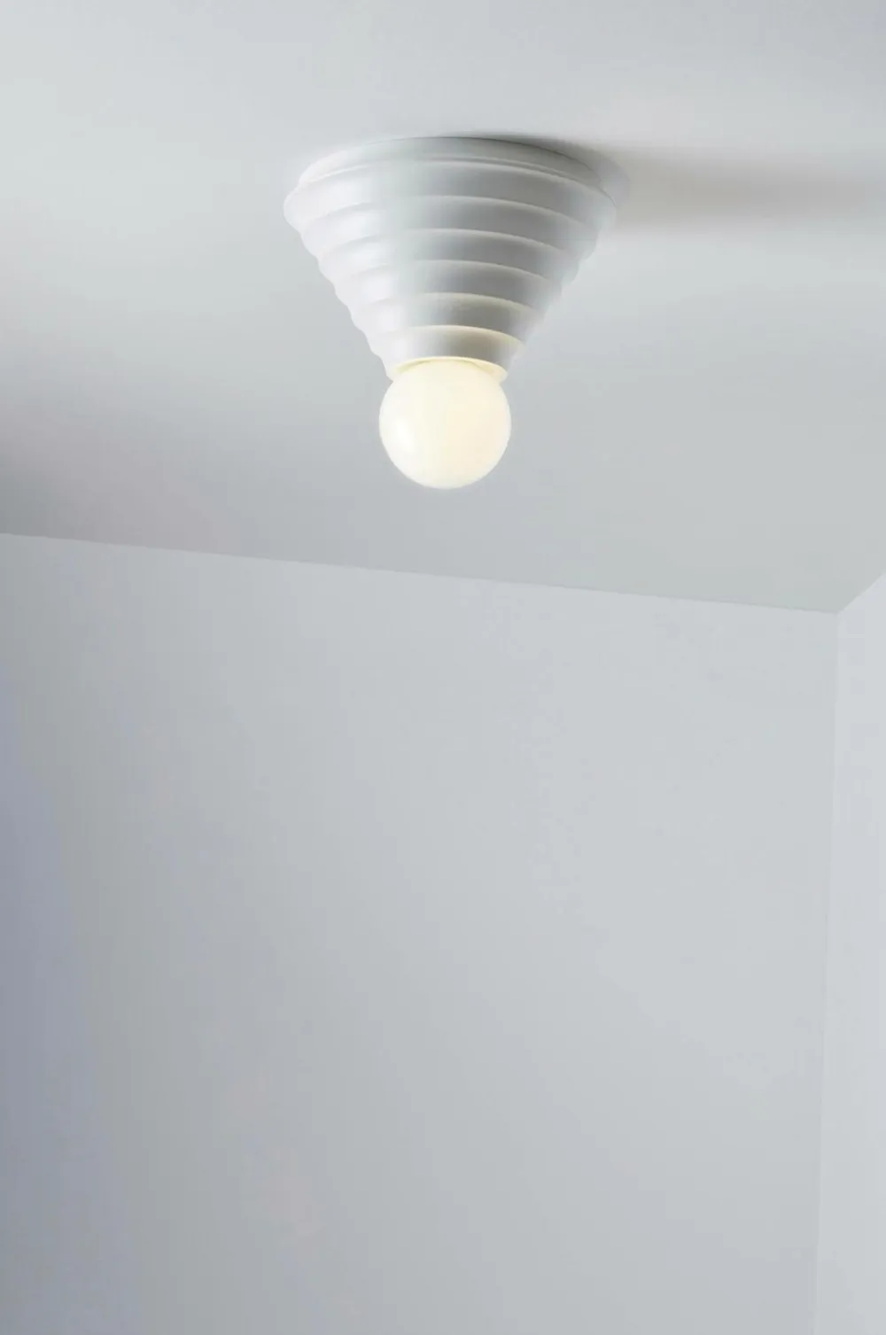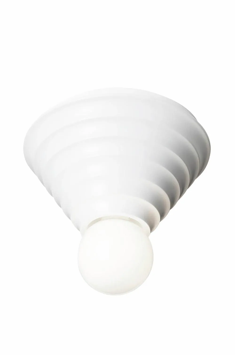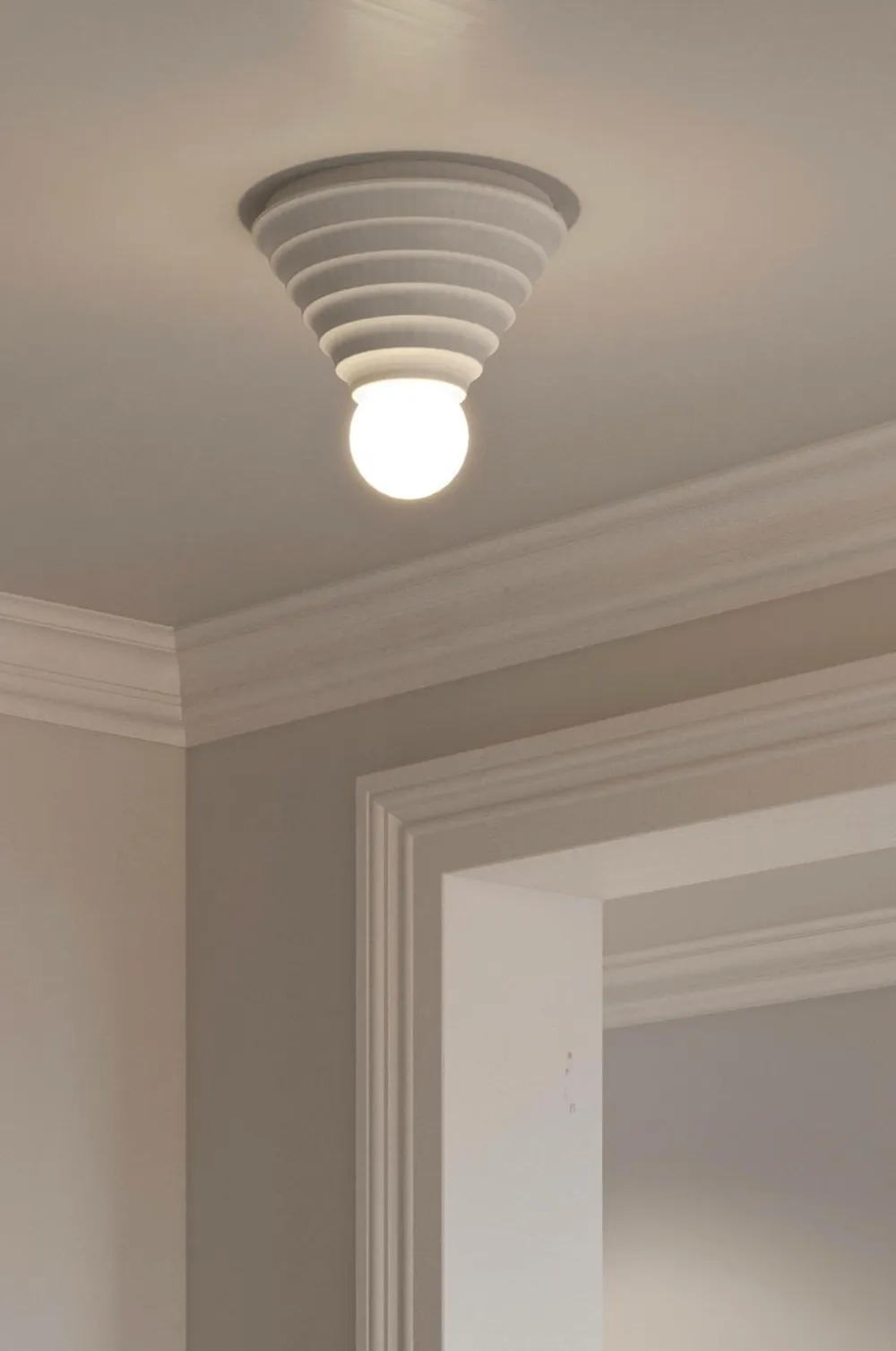 Loop 24 har lighed med en arkitektonisk roset, der bruges til at dekorere lofter i et rum. Brug en større matteret lyskilde, og lampen giver et blødt generelt lys eller et diffust atmosfærisk skær, når den er dæmpet. Den passer perfekt i rum, hvor en hængende loftslampe ikke passer ind. Meget nem at installere med et krogophæng. Designet af monika mulder. Pære og loftsstik medfølger ikke.