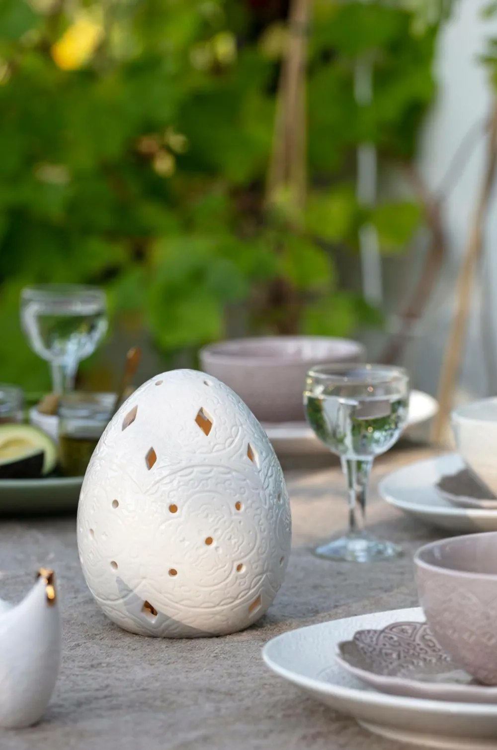 Orient LUMINA. En æggeformet led-lampe i hvid keramik med vores smukke orient mønster i relief. Lampen drives af 2 Aa batterier, som ikke medfølger. Designet af Marita Lord