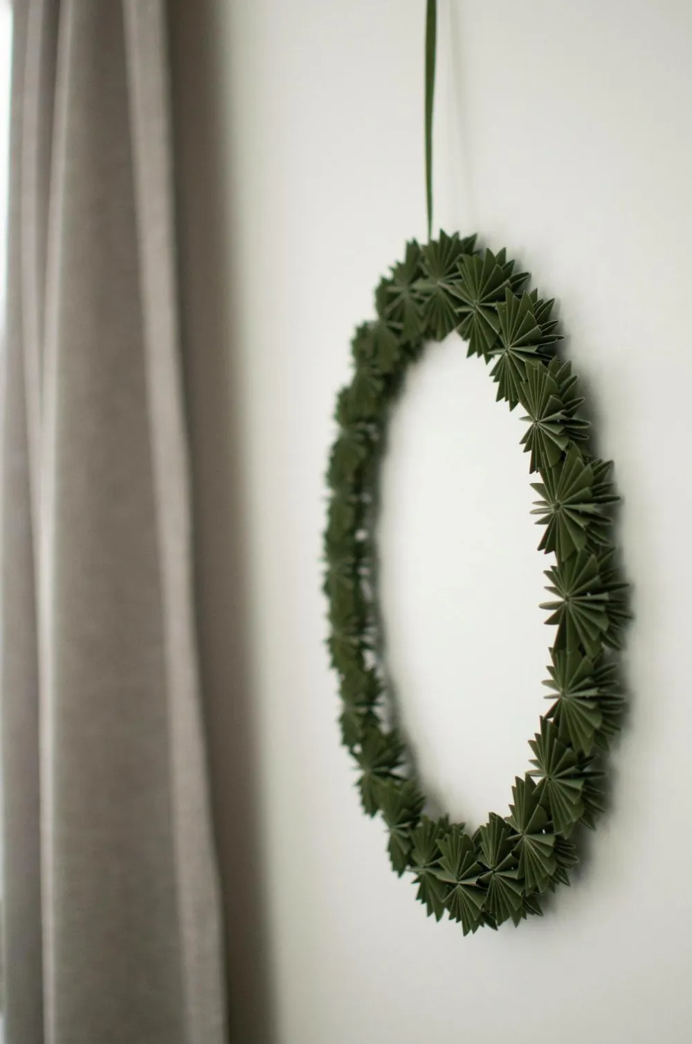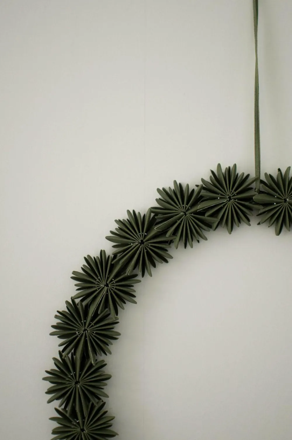 Denne krans lavet af papir giver en illusion af en minimalistisk krans lavet af kviste. Den vil forblive grøn år efter år. Ø35 cm.