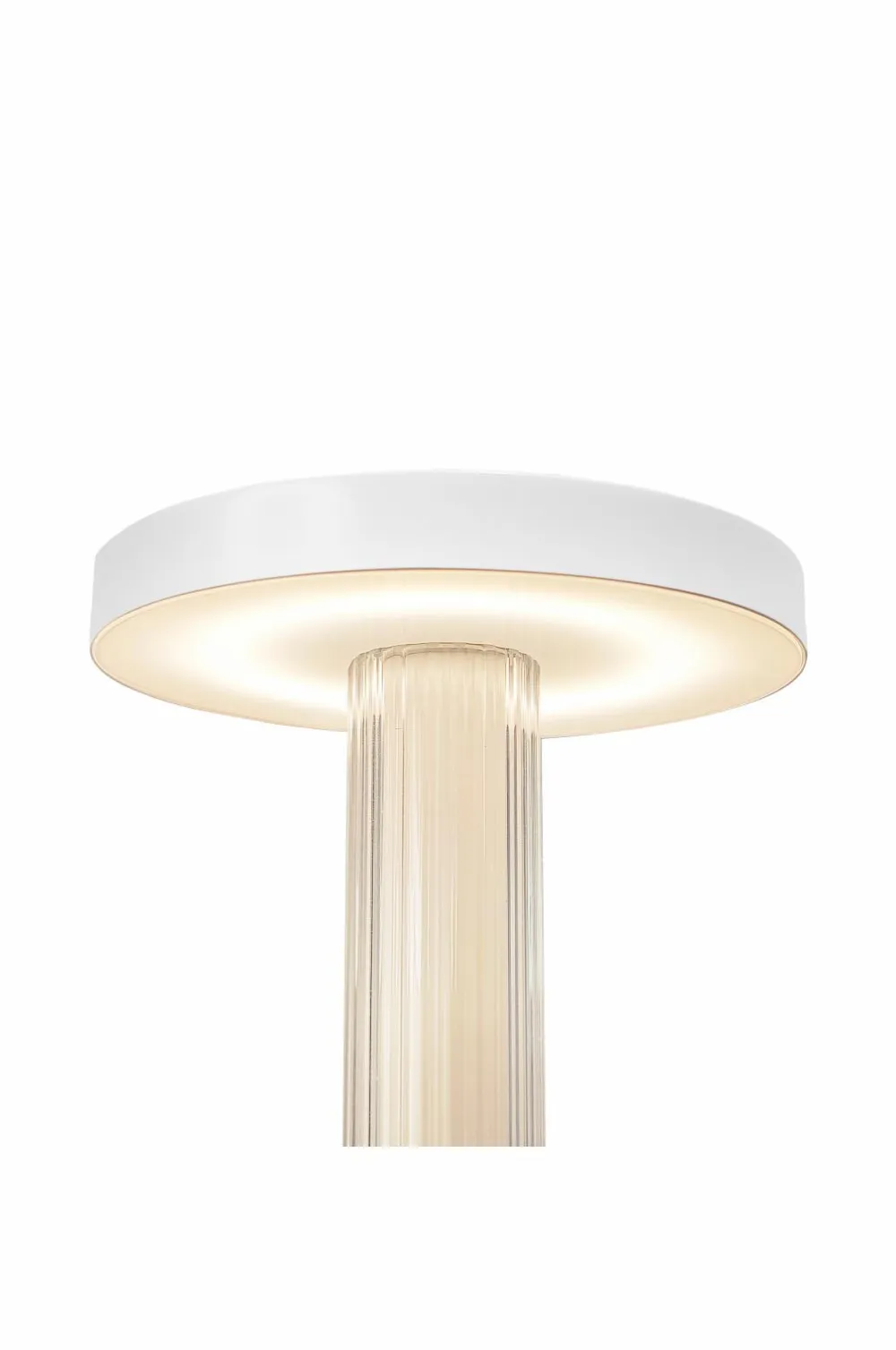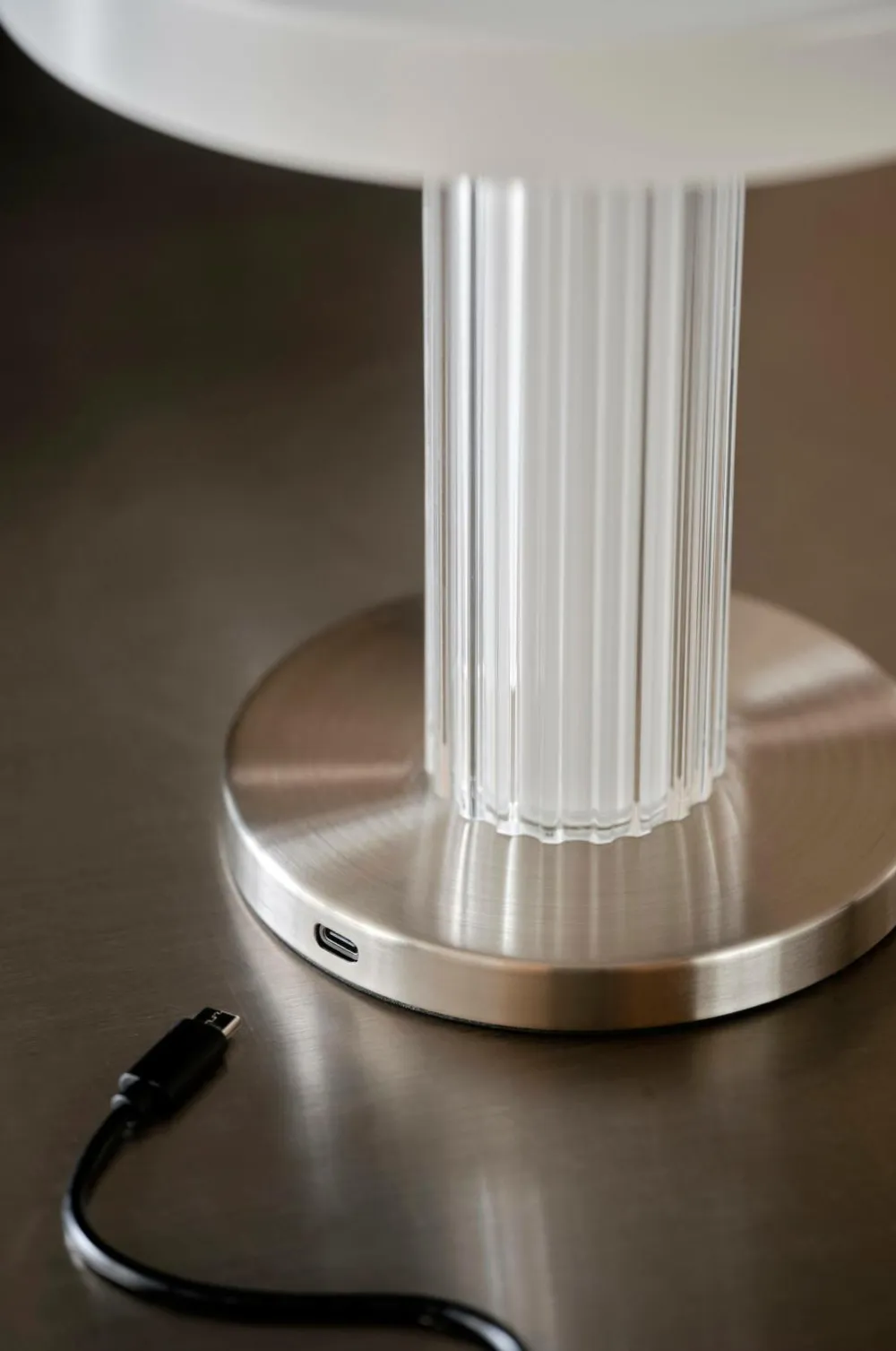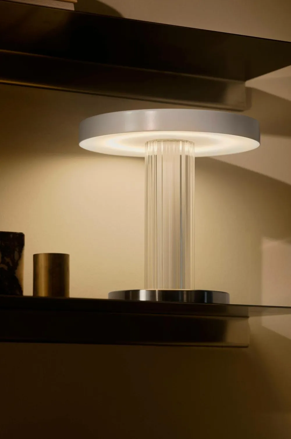 Trezzi, en elegant, bærbar bordlampe, er designet af den danske designduo anker studio. Trezzi har et moderne og elegant design med riflet glas, der henter inspiration fra art deco-stilen. Dæmp lyset i tre trin ved hjælp af touch-knappen for at skabe den perfekte stemning. Lampen oplades nemt med det medfølgende usb-kabel.