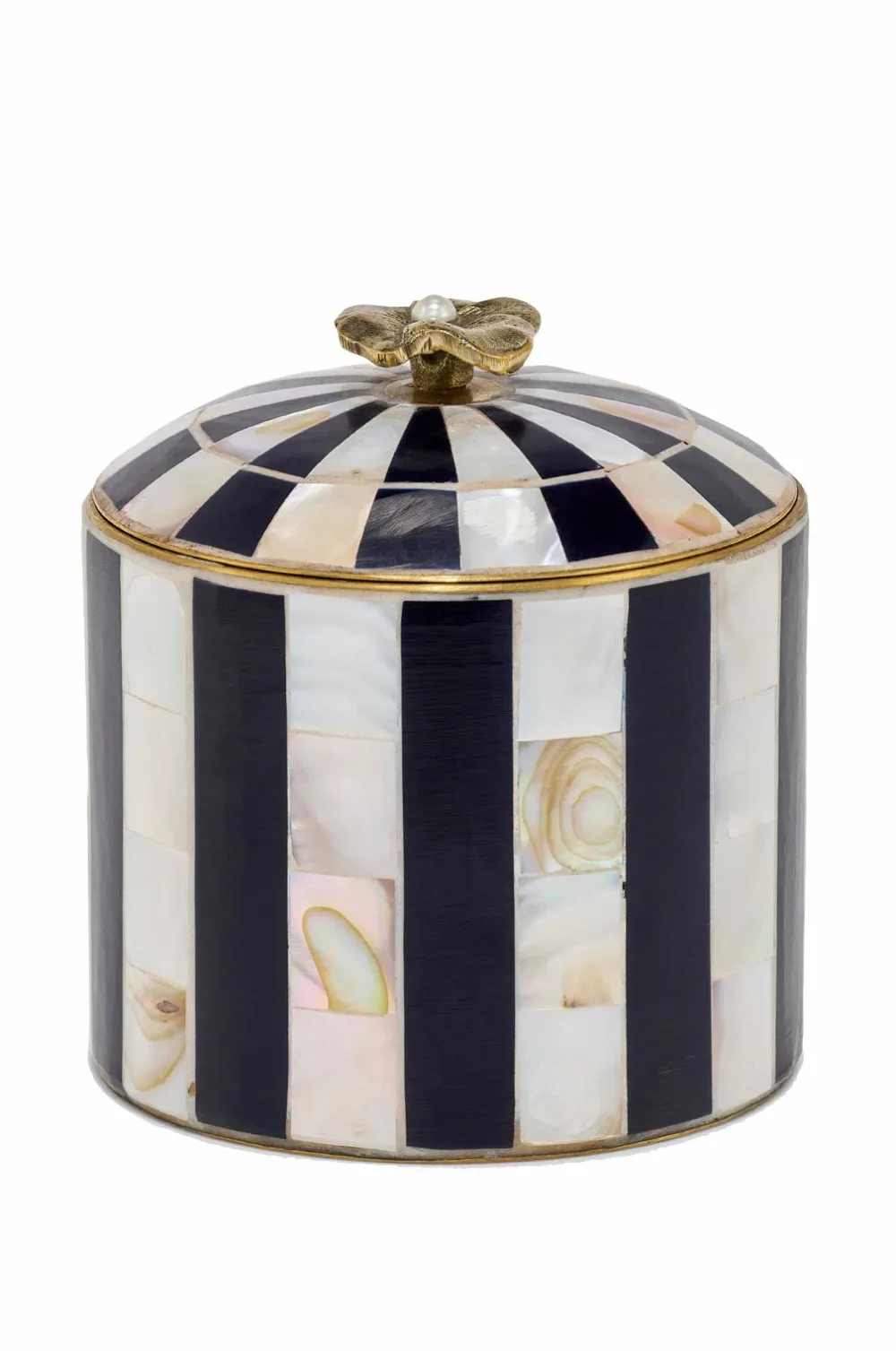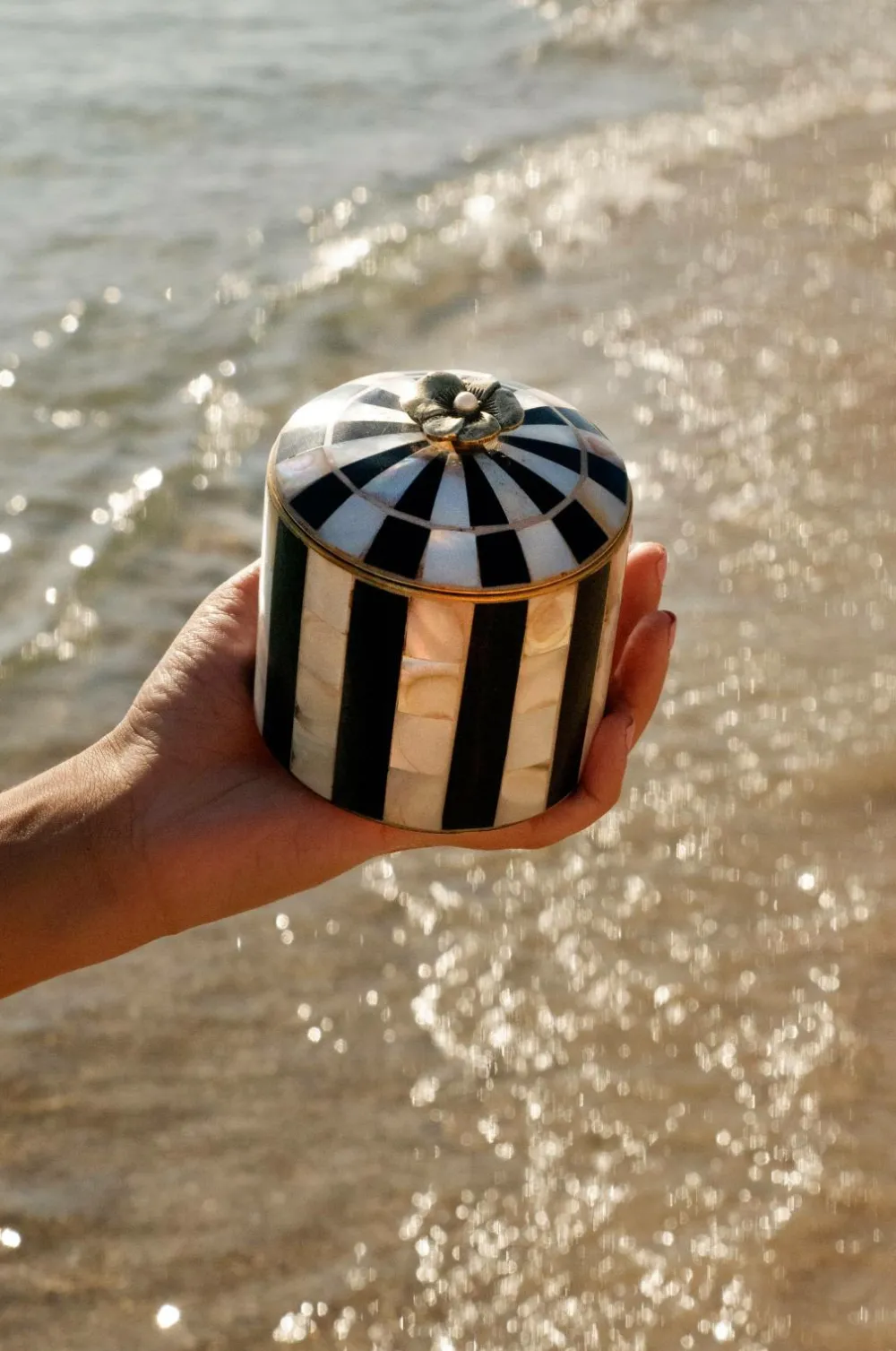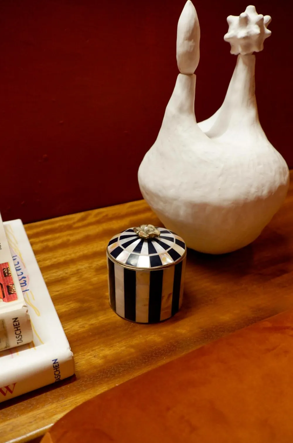 Sæt et markant præg på dit rum med Zoey Circus Box, et fantastisk håndlavet møbel, der er designet til både at være praktisk og charmerende. Denne store æske (10,5 x 10 x 10 cm) er med sit elegante marineblå og hvidstribede mønster lavet af muslingeskaller og harpiks og en delikat blomst på toppen ideel til at organisere og løfte ethvert rum. Uanset om det er til toiletsager, småting eller bare som et dekorativt midtpunkt, er Zoey Circus Box en alsidig og stilfuld tilføjelse til ethvert rum!