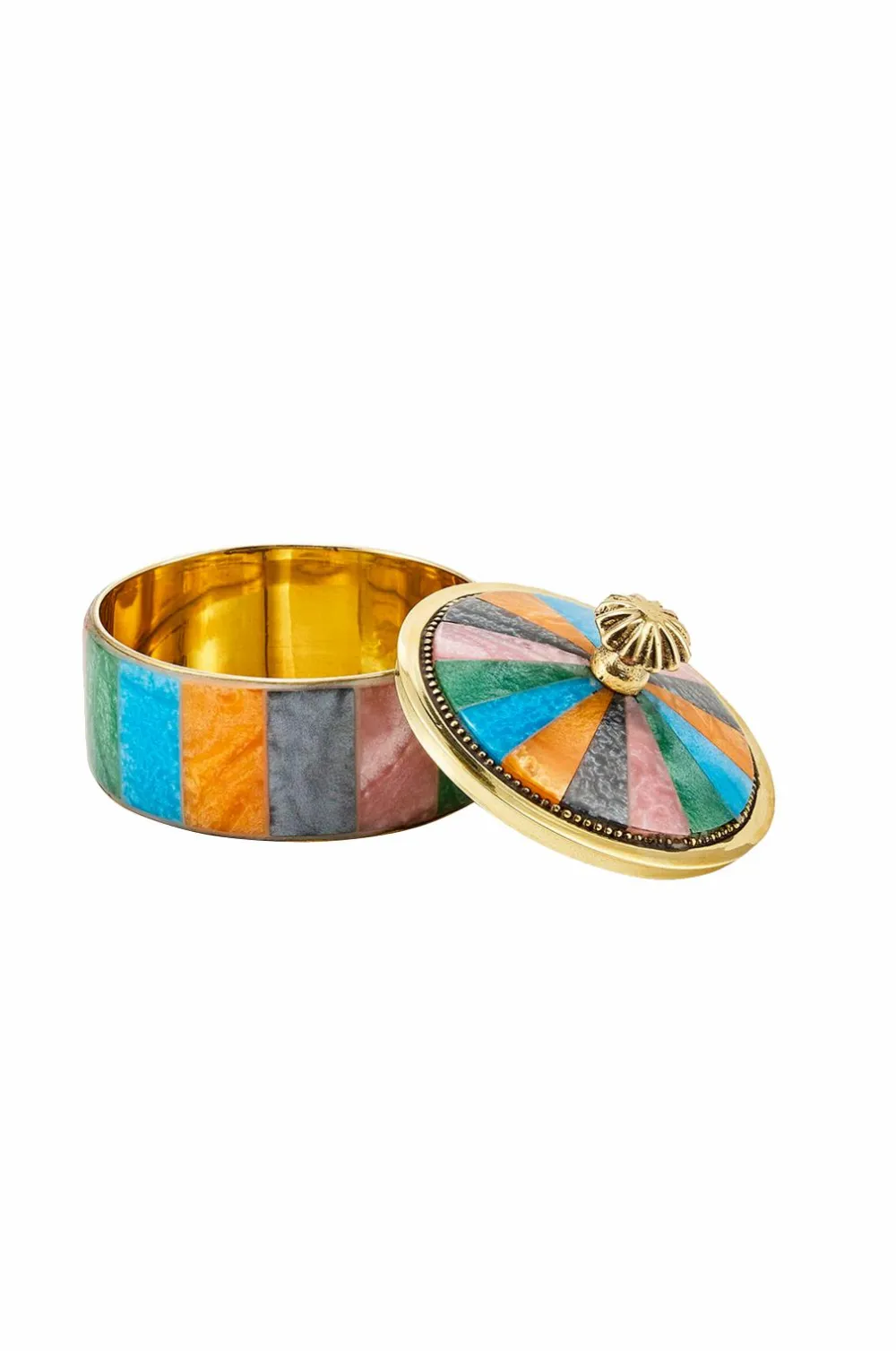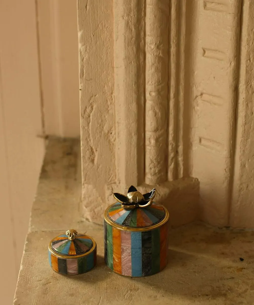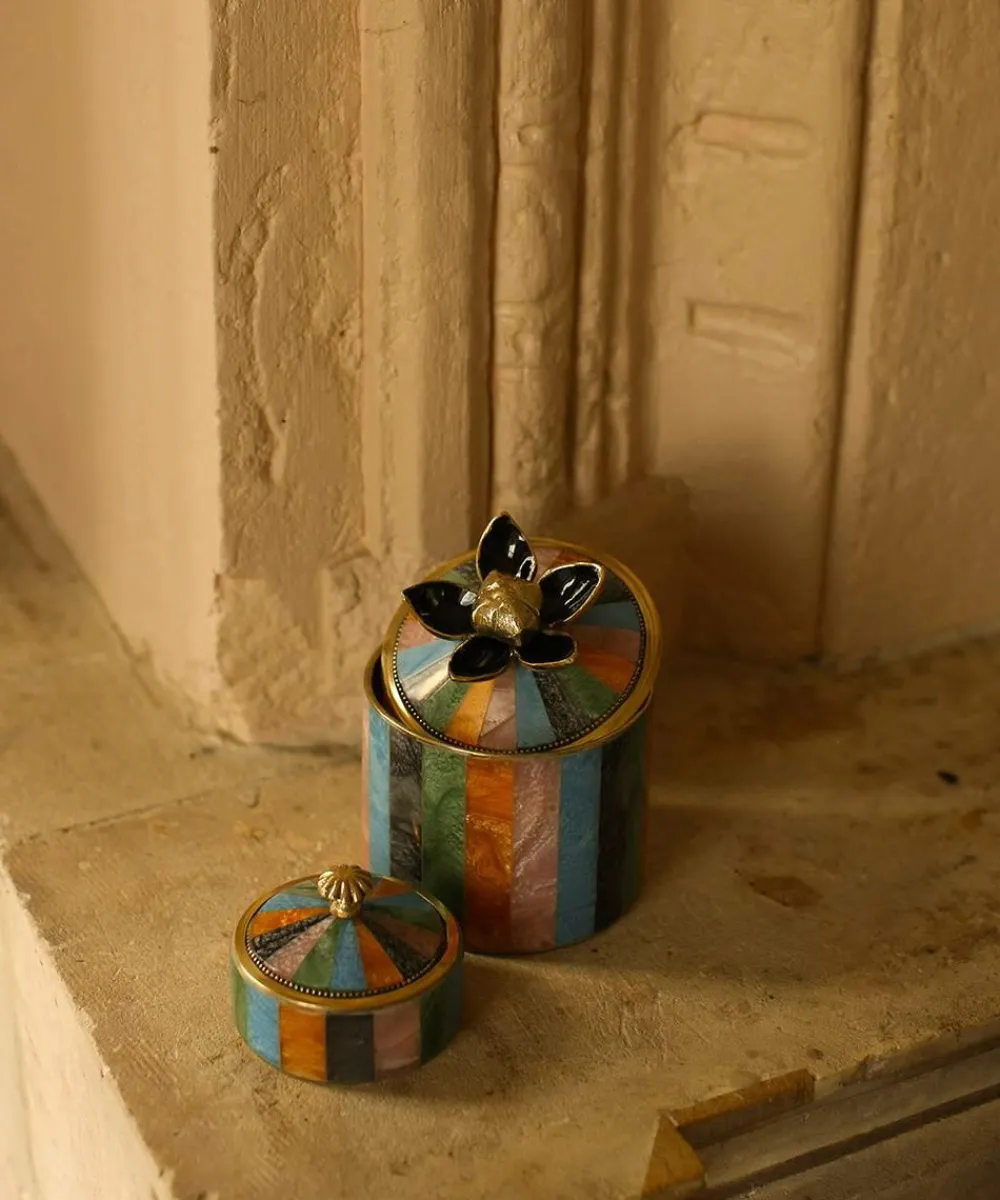 Piper Circus Box Medium Multi er et fortryllende og farverigt opbevaringstilbehør, der giver dit interiør et legesygt og stilfuldt touch. Denne smykkeskrin er fremstillet af 60 % messing og 40 % harpiks og kombinerer bæredygtighed med håndlavet charme. Uanset om den bruges til smykker eller sentimentale minder, er denne skrin både praktisk og et stilfuldt dekorativt element. Låget har en elegant messingknap, der minder om toppen af et cirkustelt, hvilket gør den nem at åbne. Produktspecifikationer: