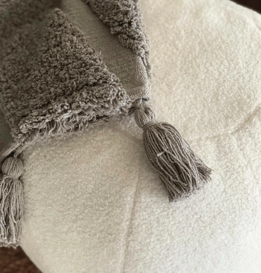 Plaid med tuftet mønster på forsiden og dekorative kvaste på de korte sider. Mål 130×150 cm. 100% bomuld. 30 °C finvask.