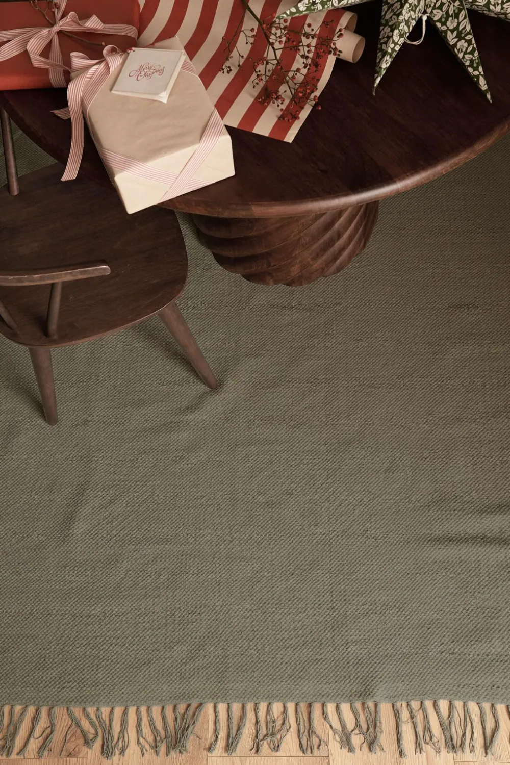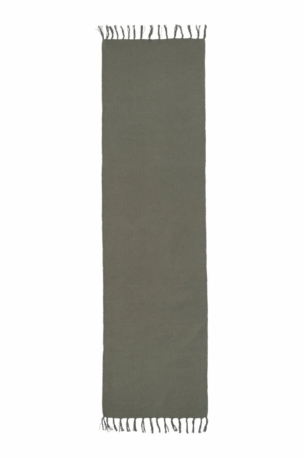 Glatvævet bomuldstæppe med farvede frynser. Højde 0,5 cm.