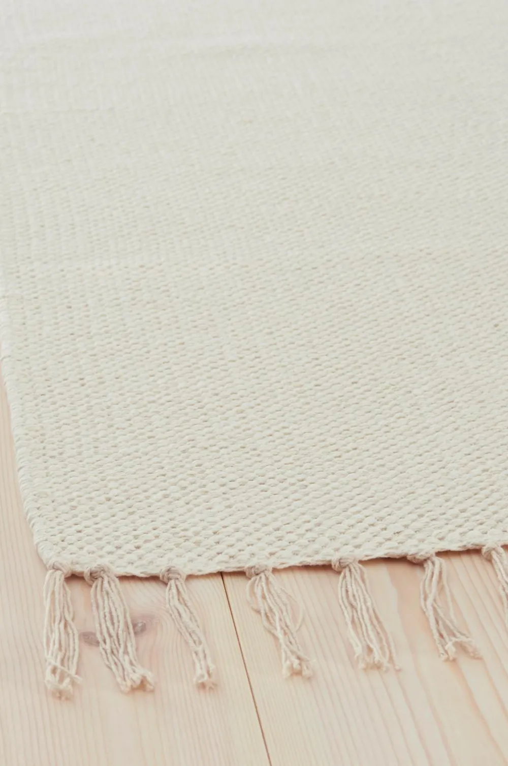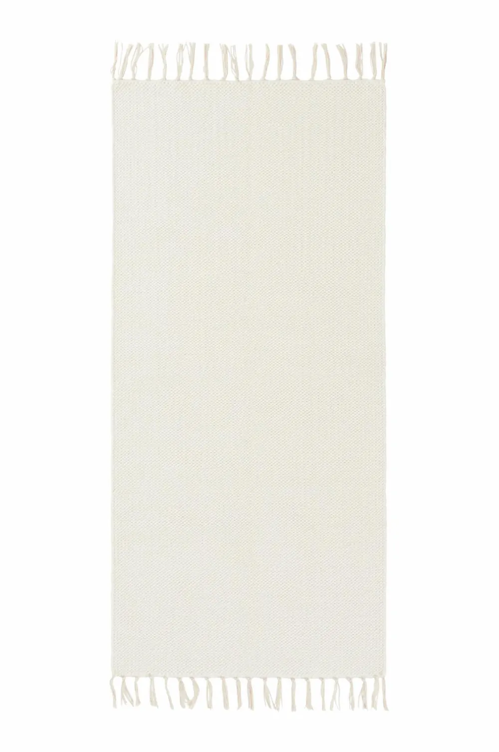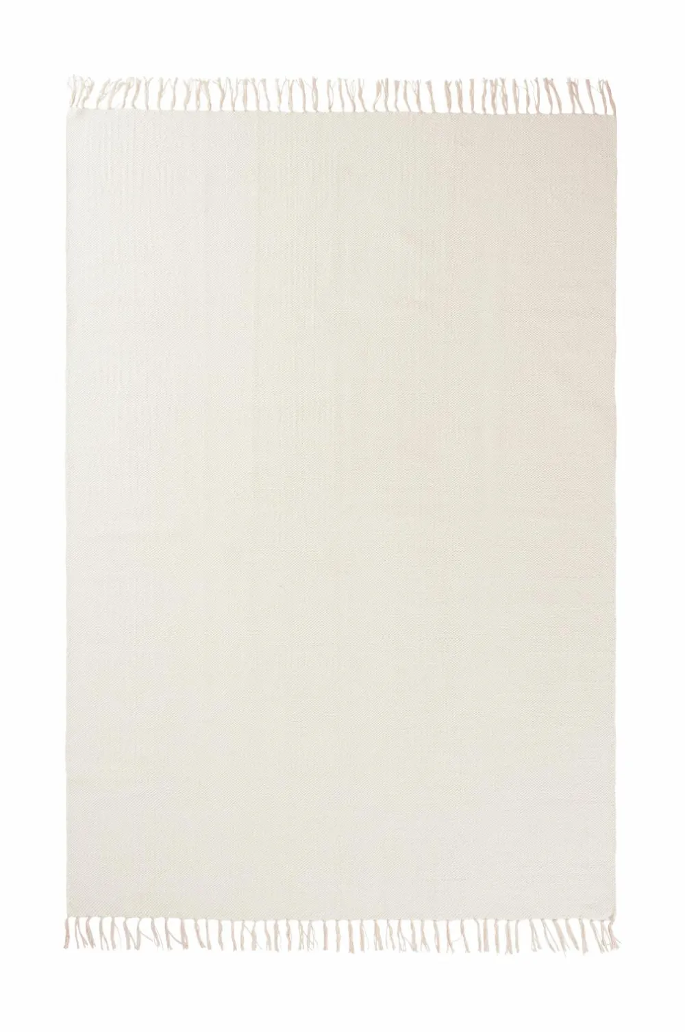 Glatvævet bomuldstæppe med farvede frynser. Højde 0,5 cm.