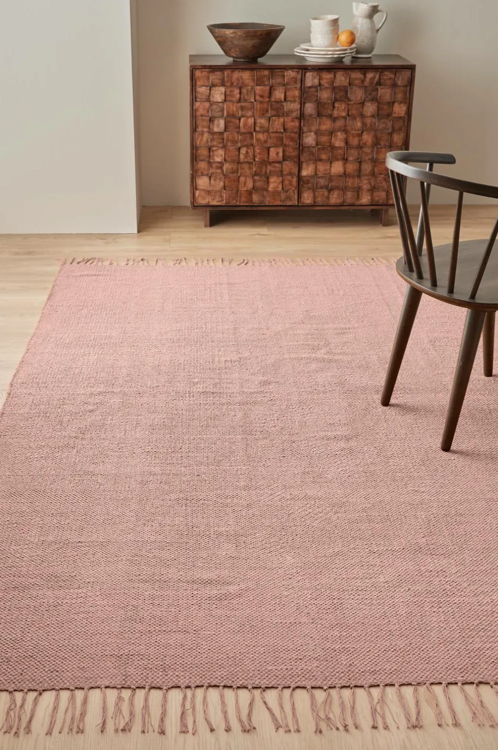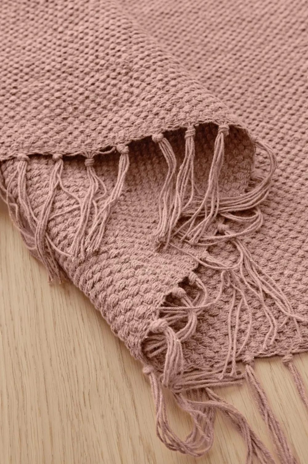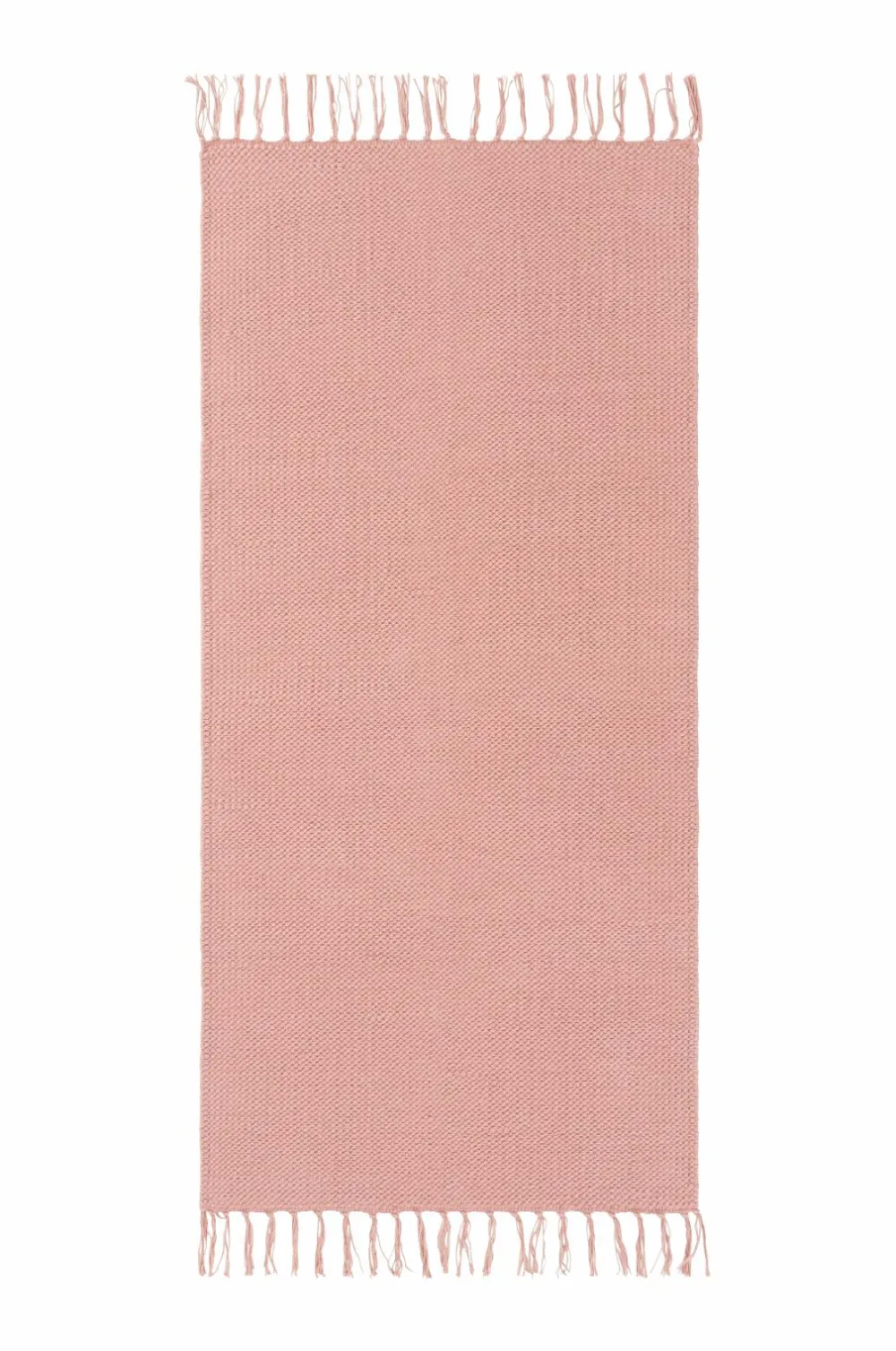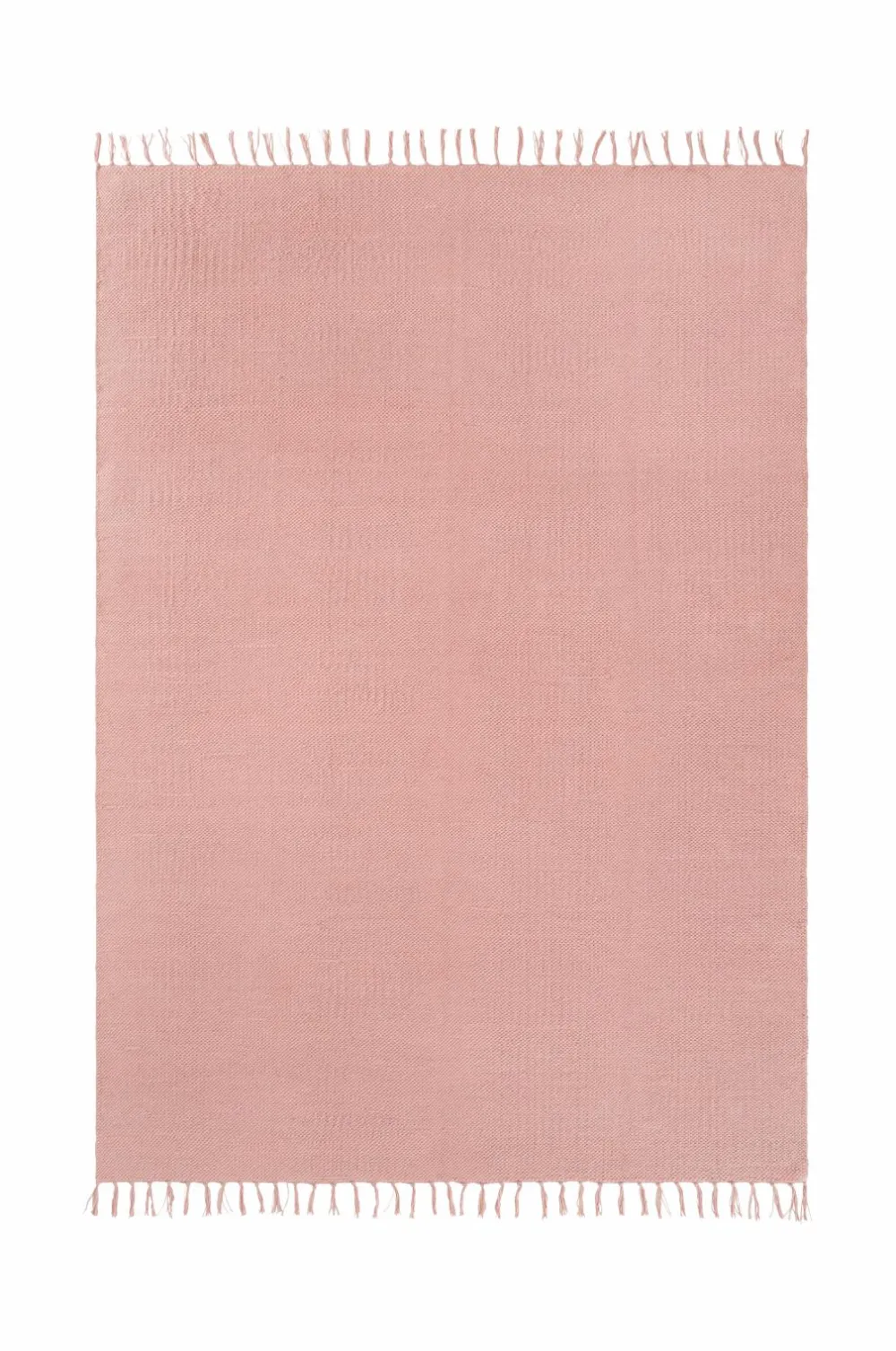 Glatvævet bomuldstæppe med farvede frynser. Højde 0,5 cm.