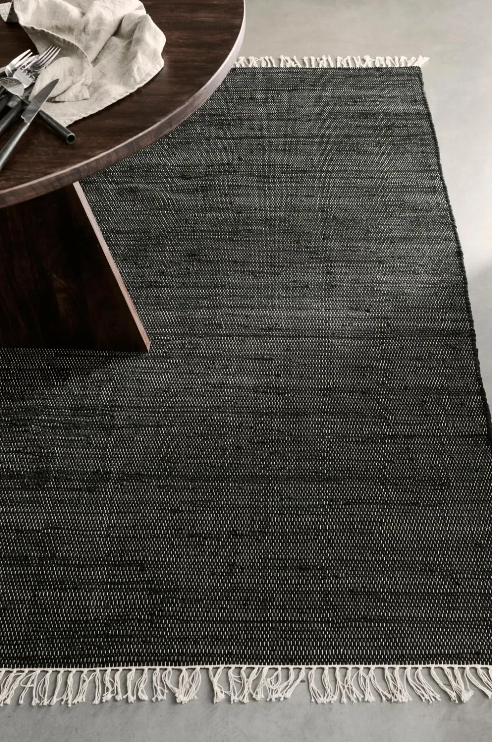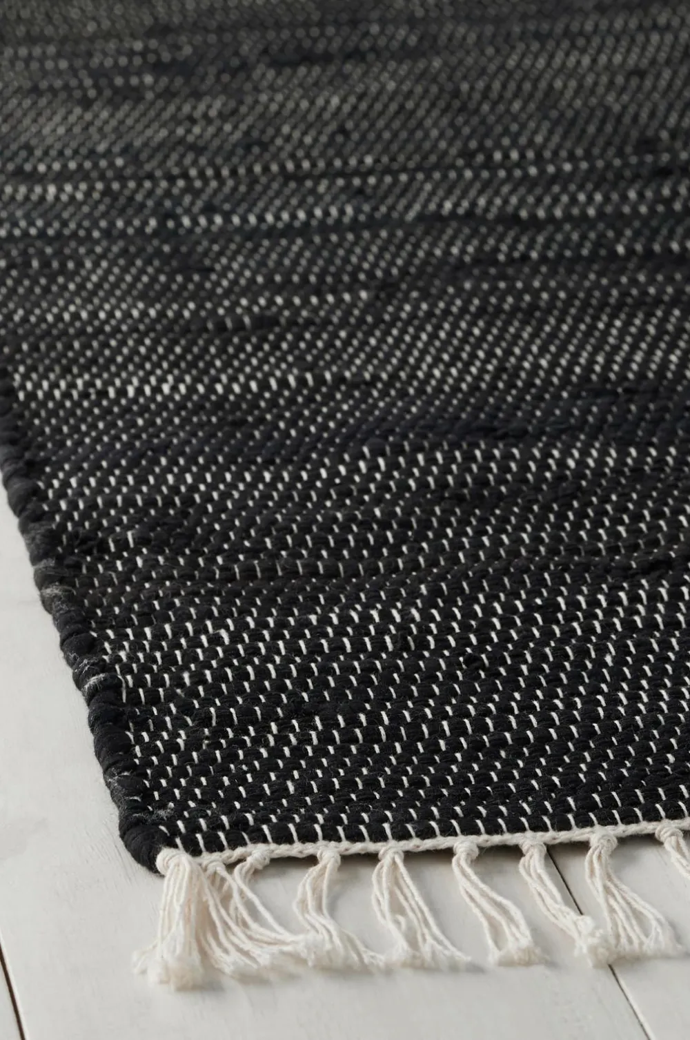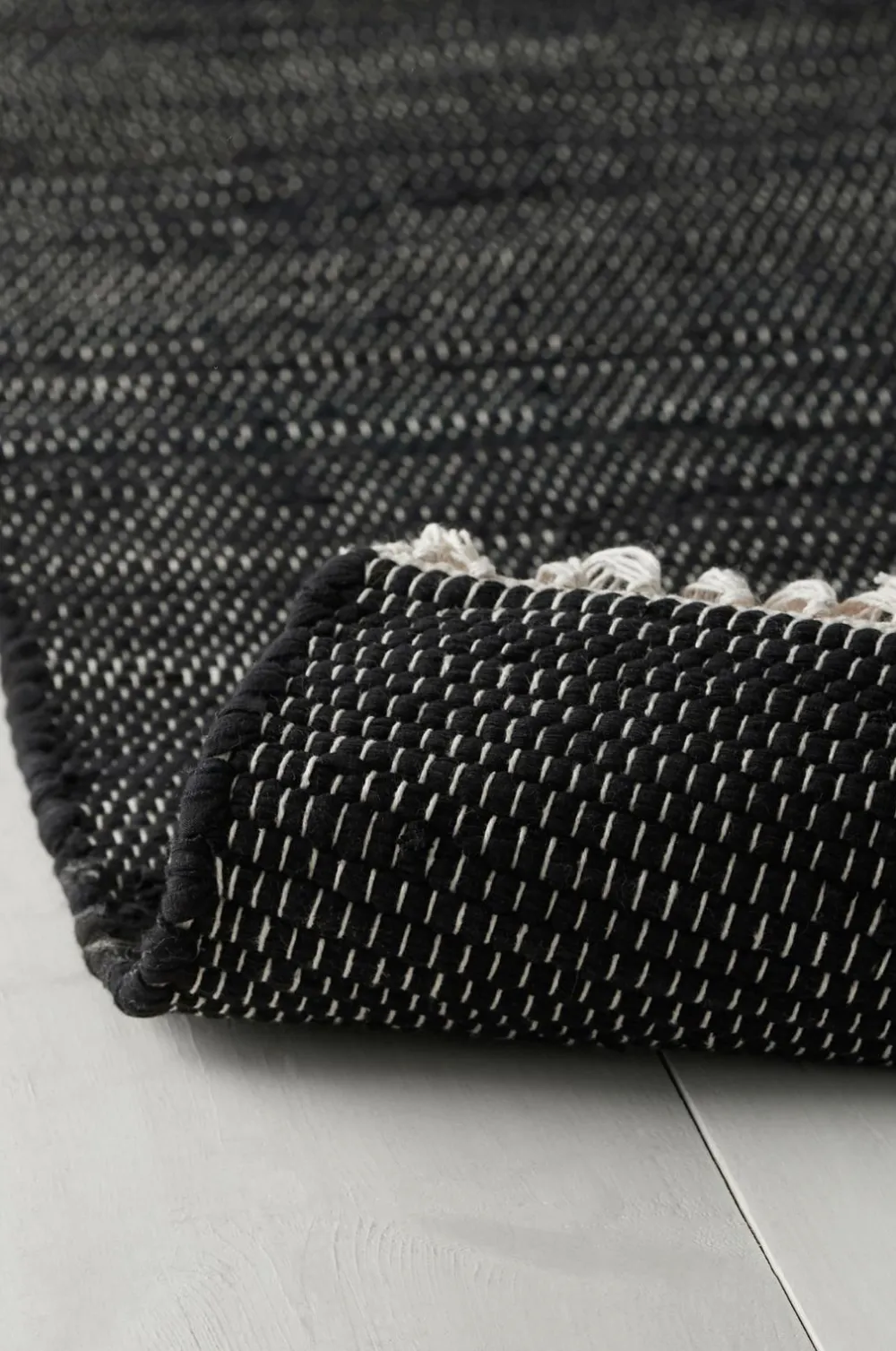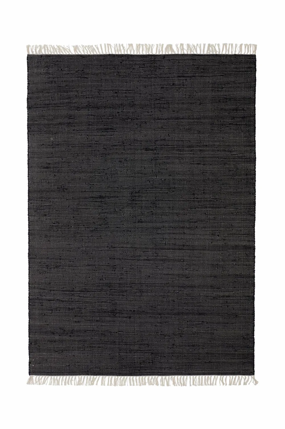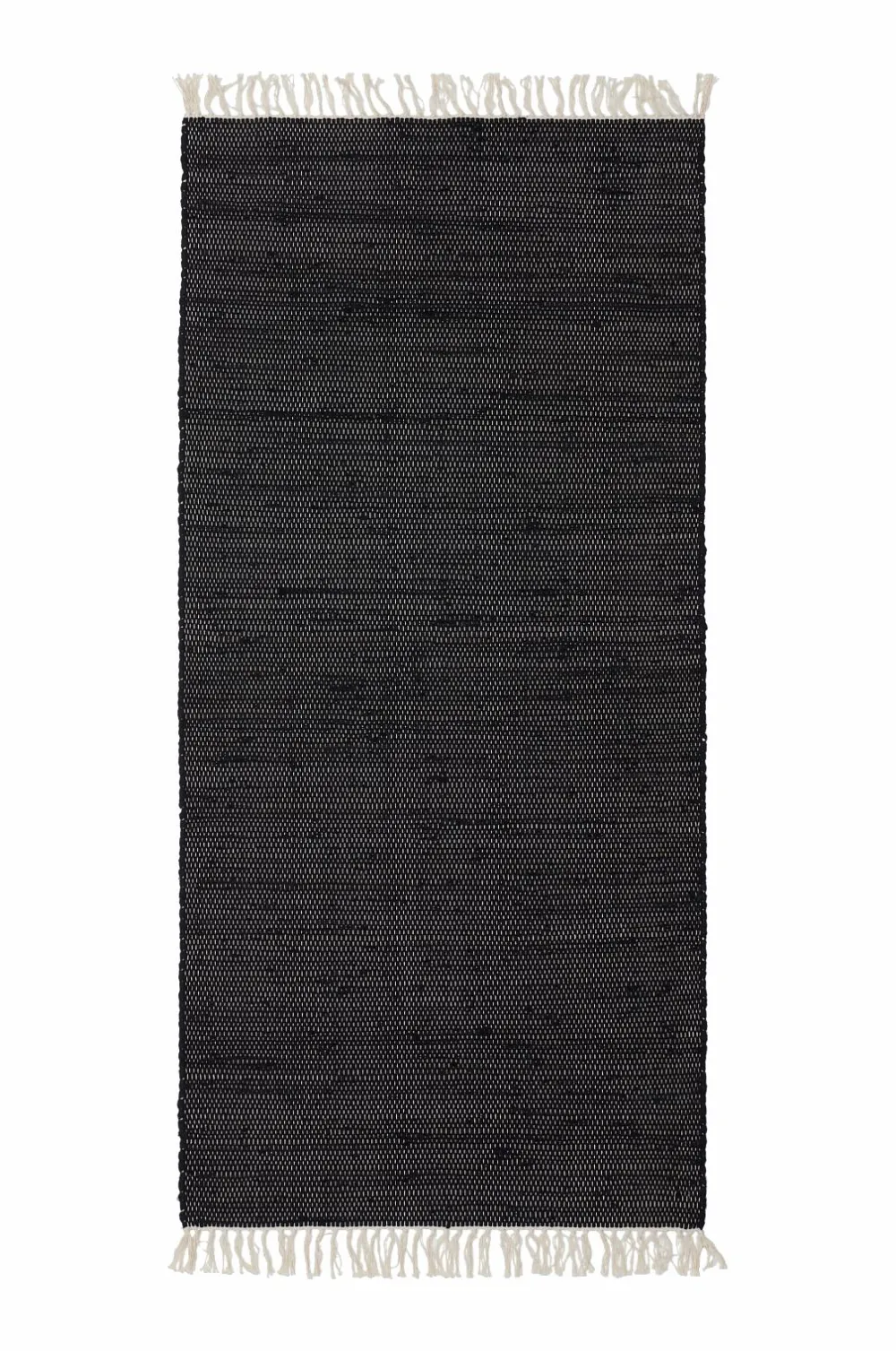 Vævet tæppe i bomuld og spandex, fremstillet af genindvundet materiale. Frynser i enderne.