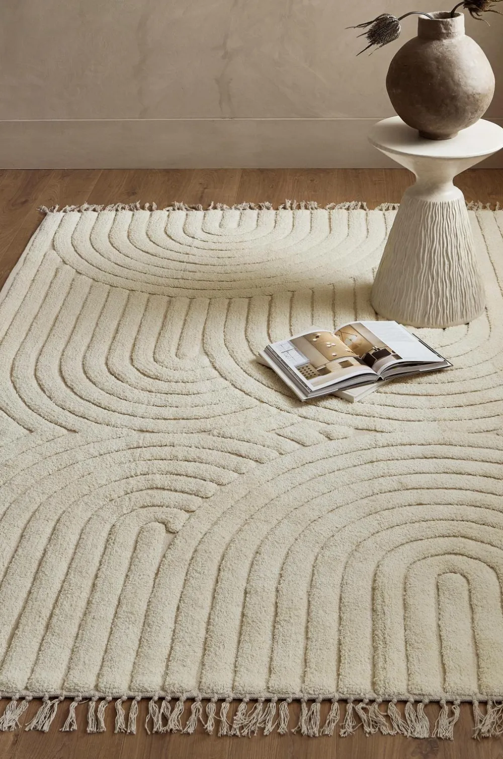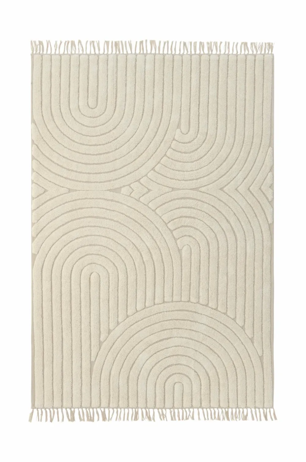Håndvævet bomuldstæppe med tuftet mønster. Frynser i enderne.