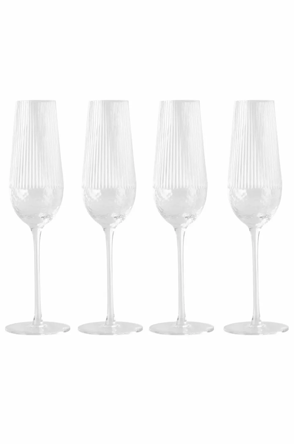 4 stk. champagneglas. Højde 24,5 cm. Diameter foroven 4 cm. Diameter fod 7 cm. Volumen: 260 ml. Tåler opvaskemaskine men ikke mikrobølgeovn.