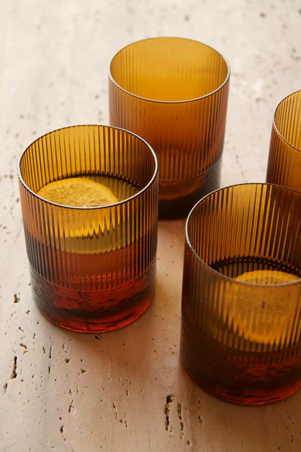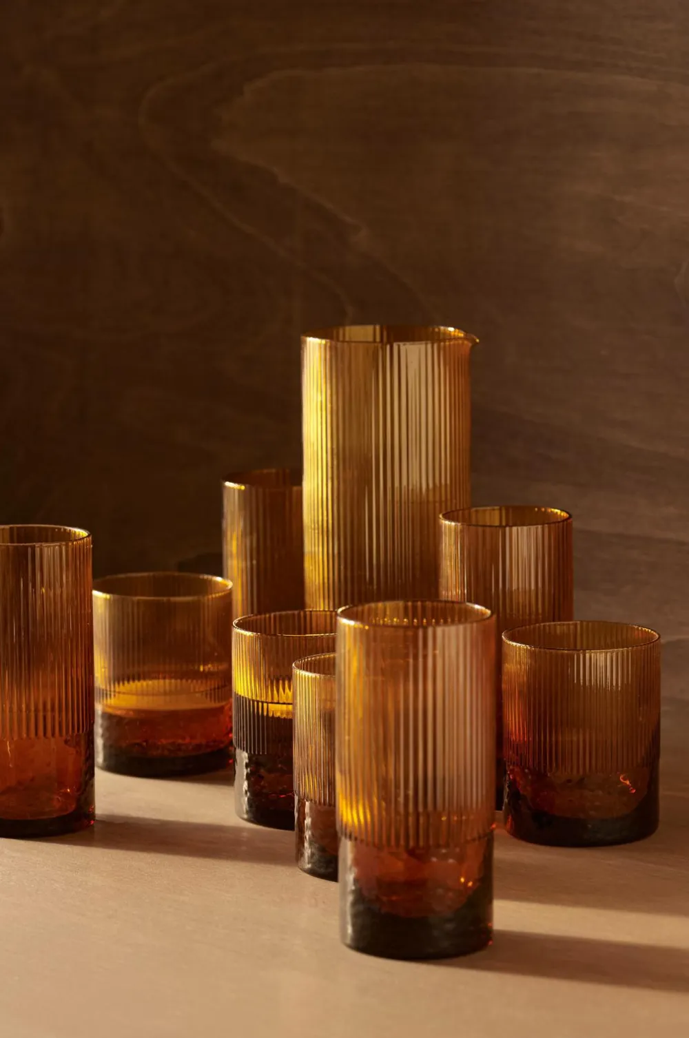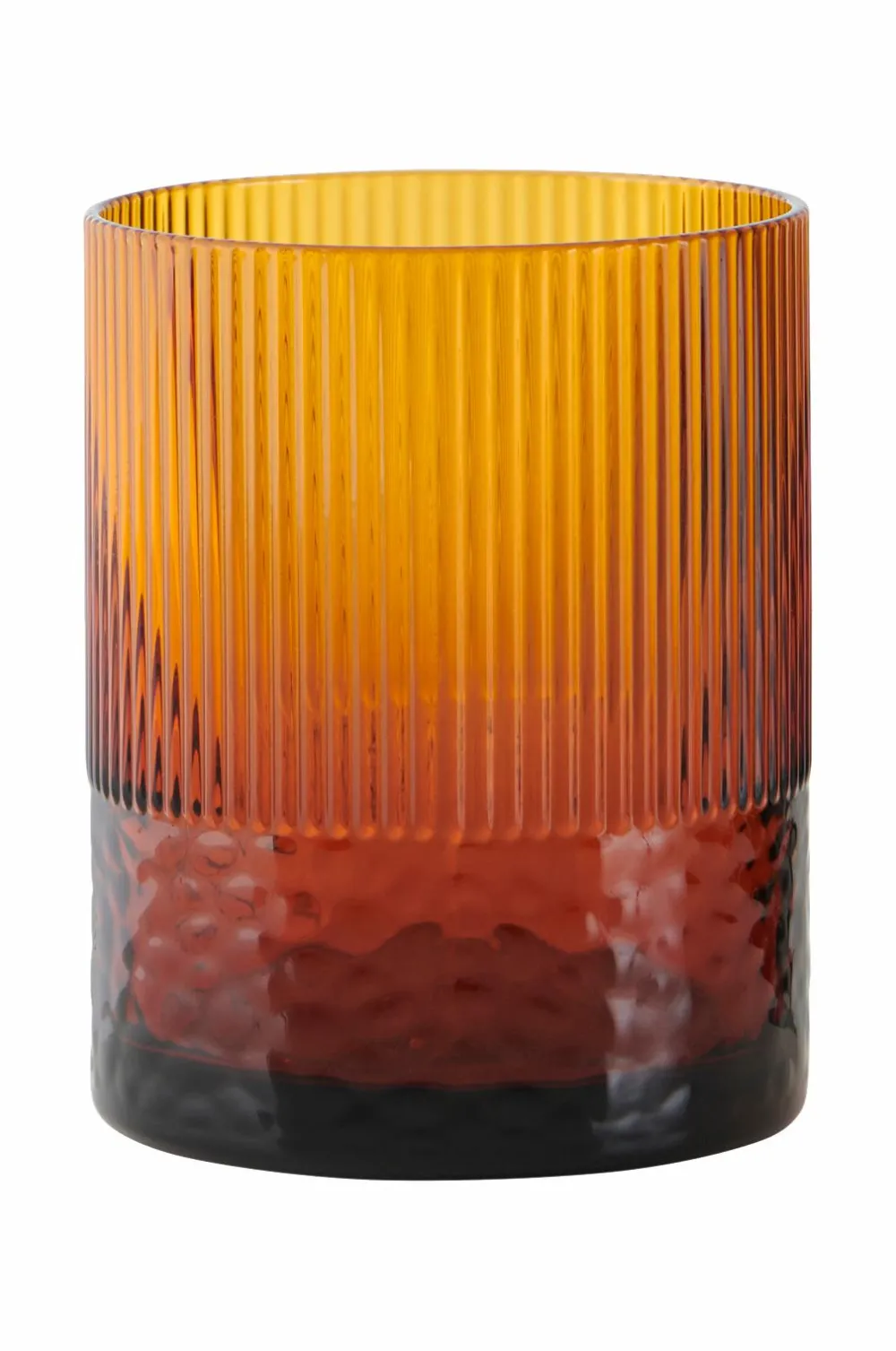 Drikkeglas med rillet overflade i toppen og dekorativ struktur i bunden. Volumen: 360 ml.