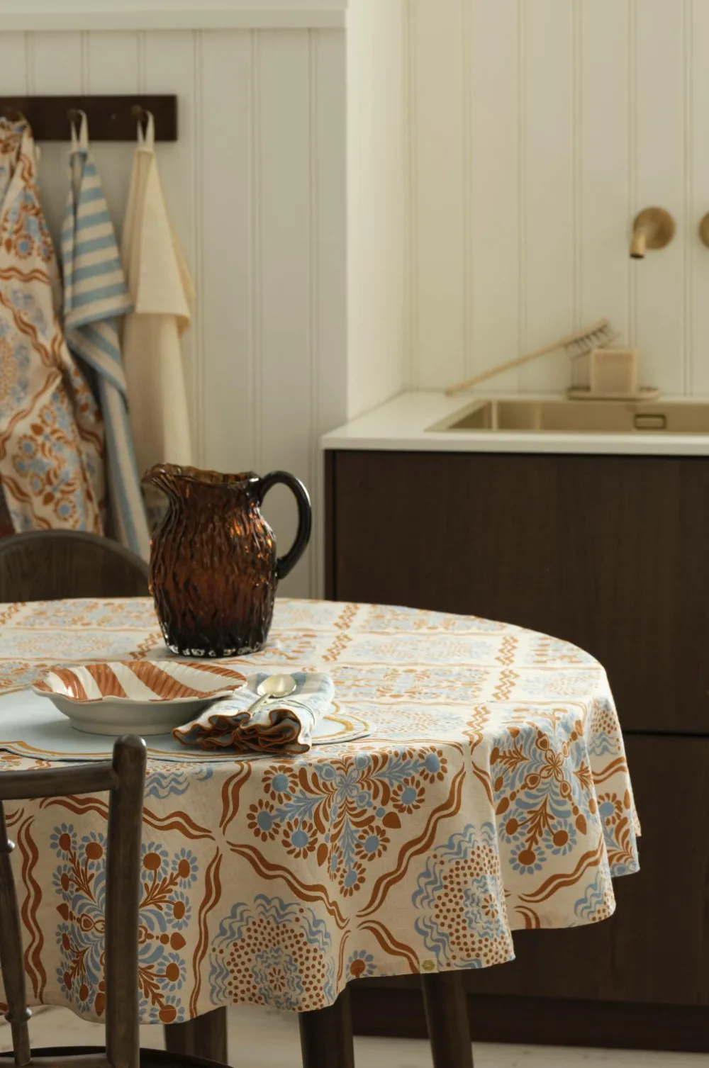 • Rund dug i bomuld og hør med blød, vasket afslutning
