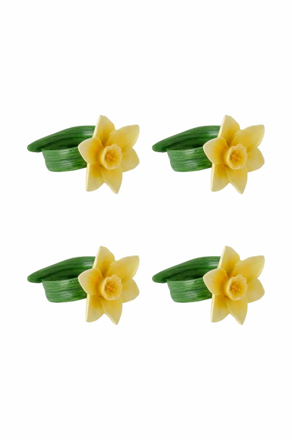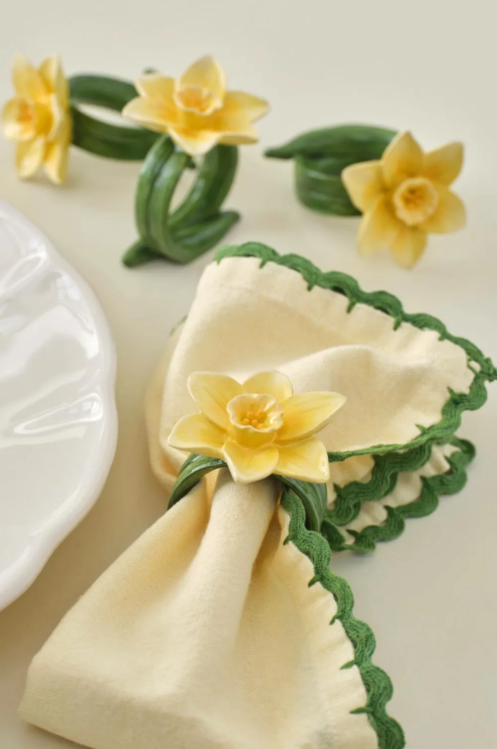 • Asymmetriske, snoede servietringe, som servietten trækkes igennem