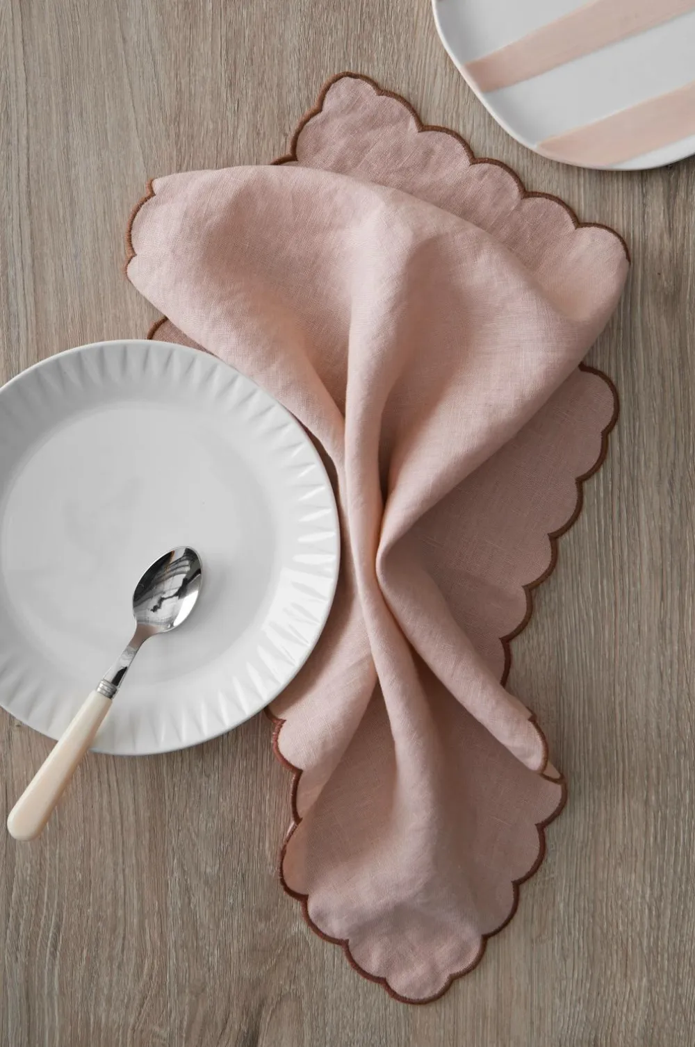 2 servietter i vasket hør med smuk struktur. Bølgekant med overlocksøm i kontrastfarve hele vejen rundt.
