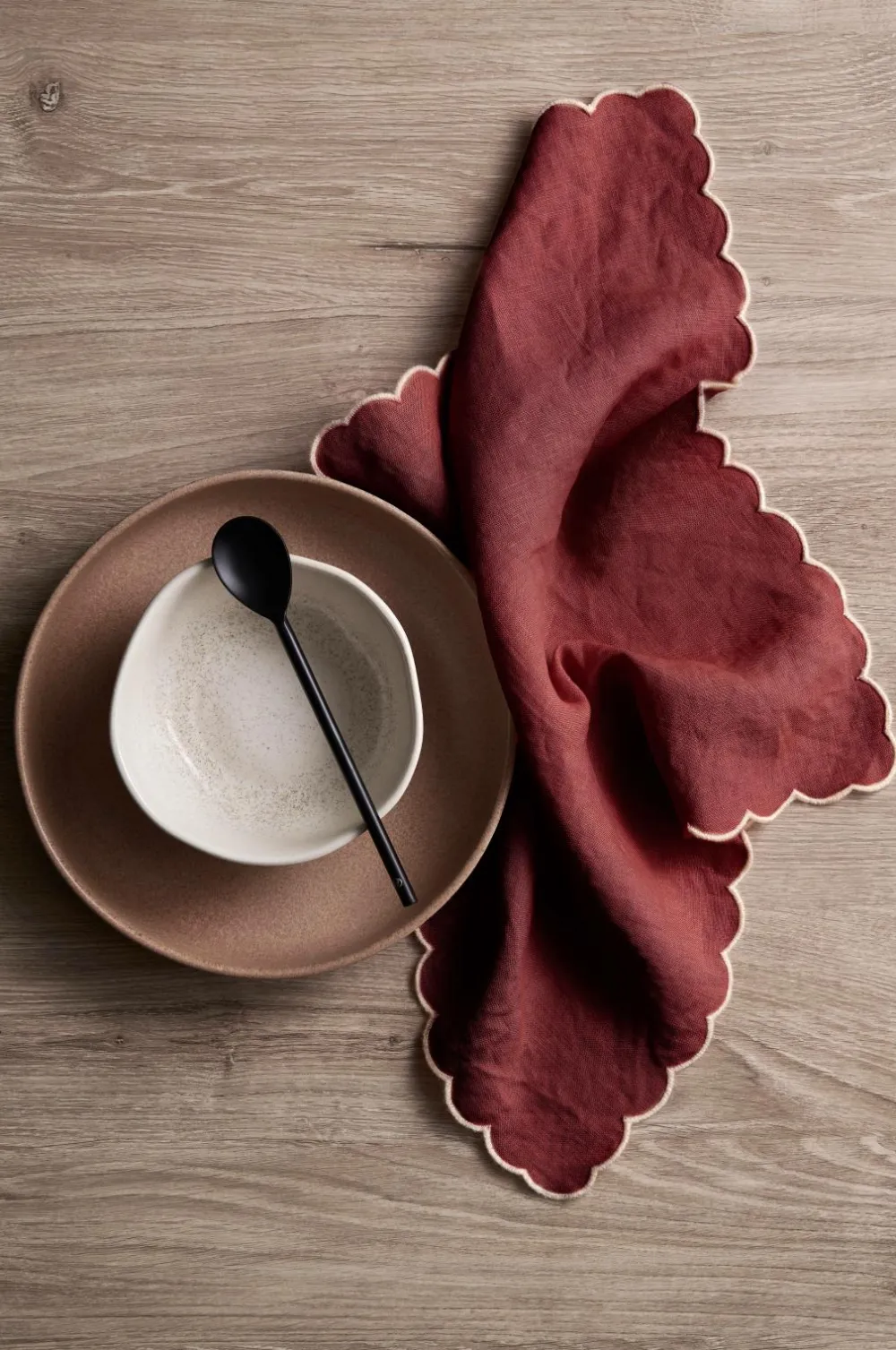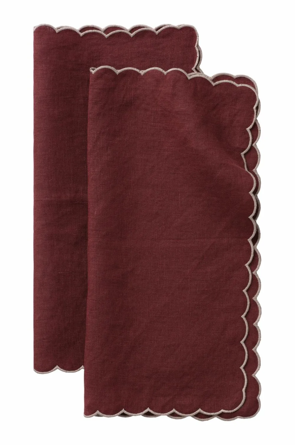 2 servietter i vasket hør med smuk struktur. Bølgekant med overlocksøm i kontrastfarve hele vejen rundt.