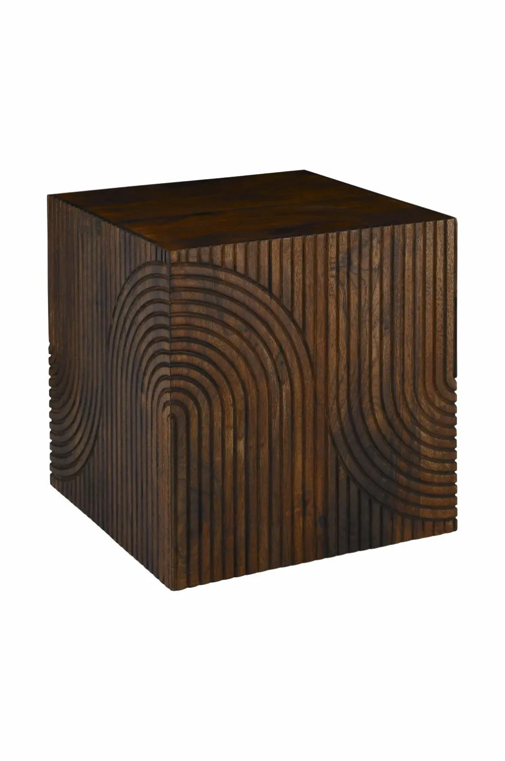 Kubeformet sidebord ad mangotræ med et dekorativt, udskåret strukturmønster på alle sider. Glat top.