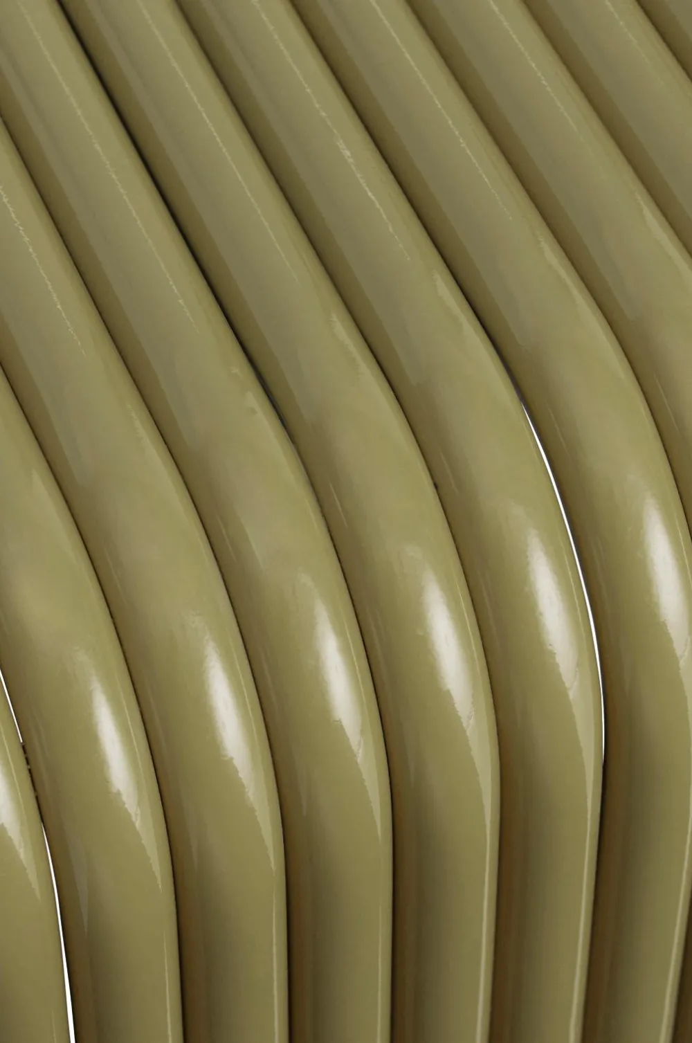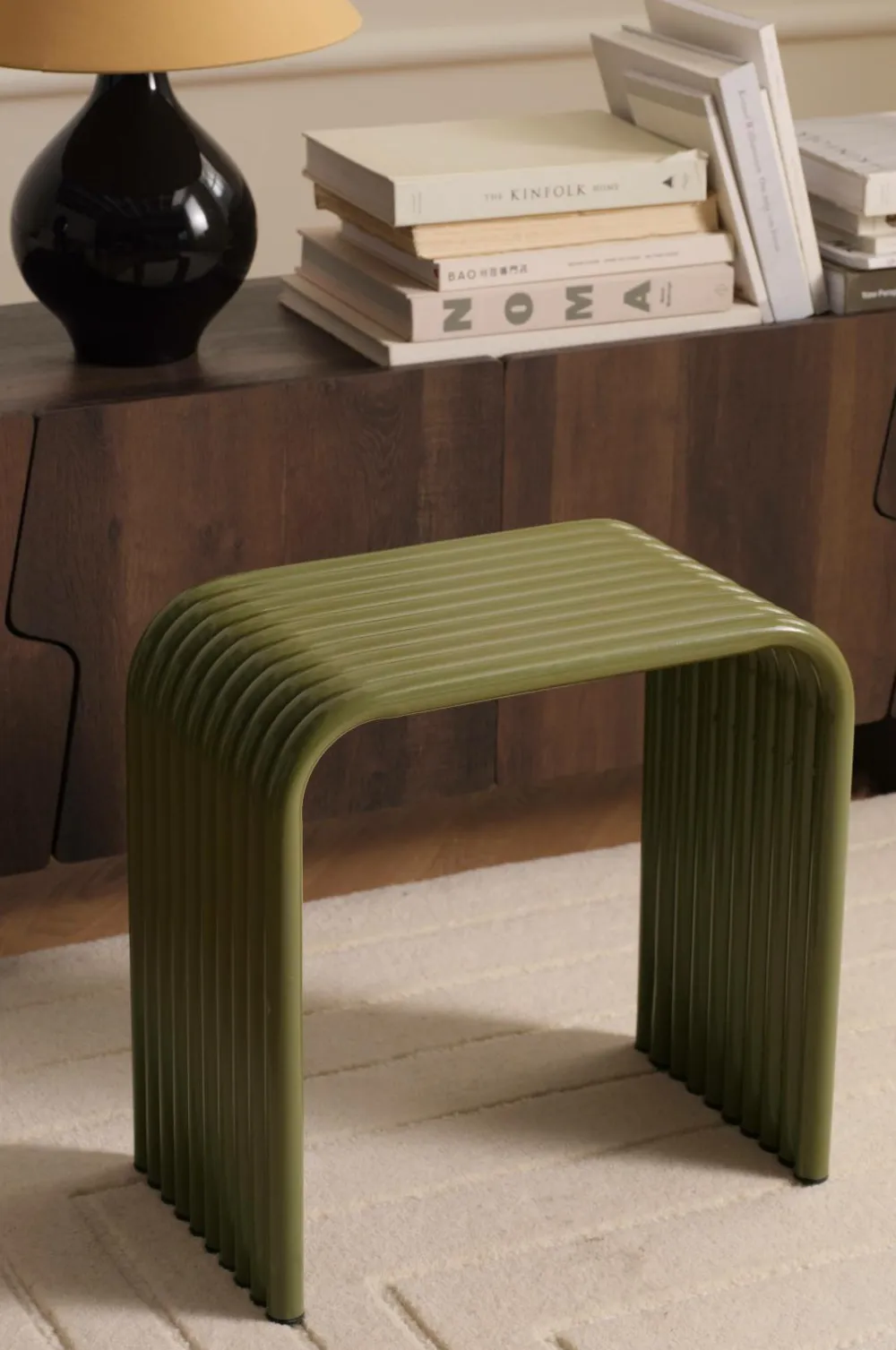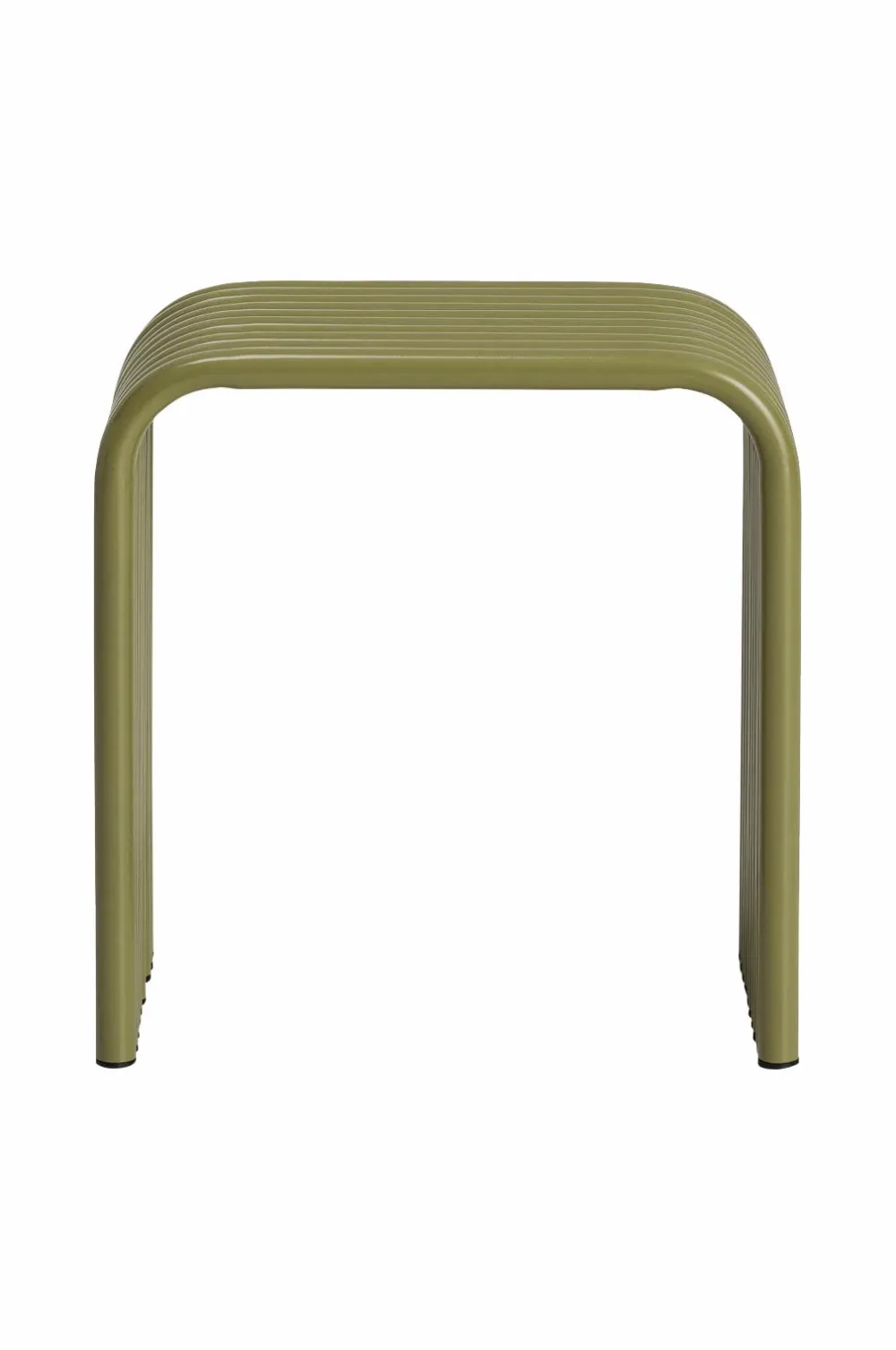 Skammel/sidebord i metal med sammensatte rør, der danner et stribet mønster. Maksimal belastning 100 kg. Plastdupper under. Leveres samlet.