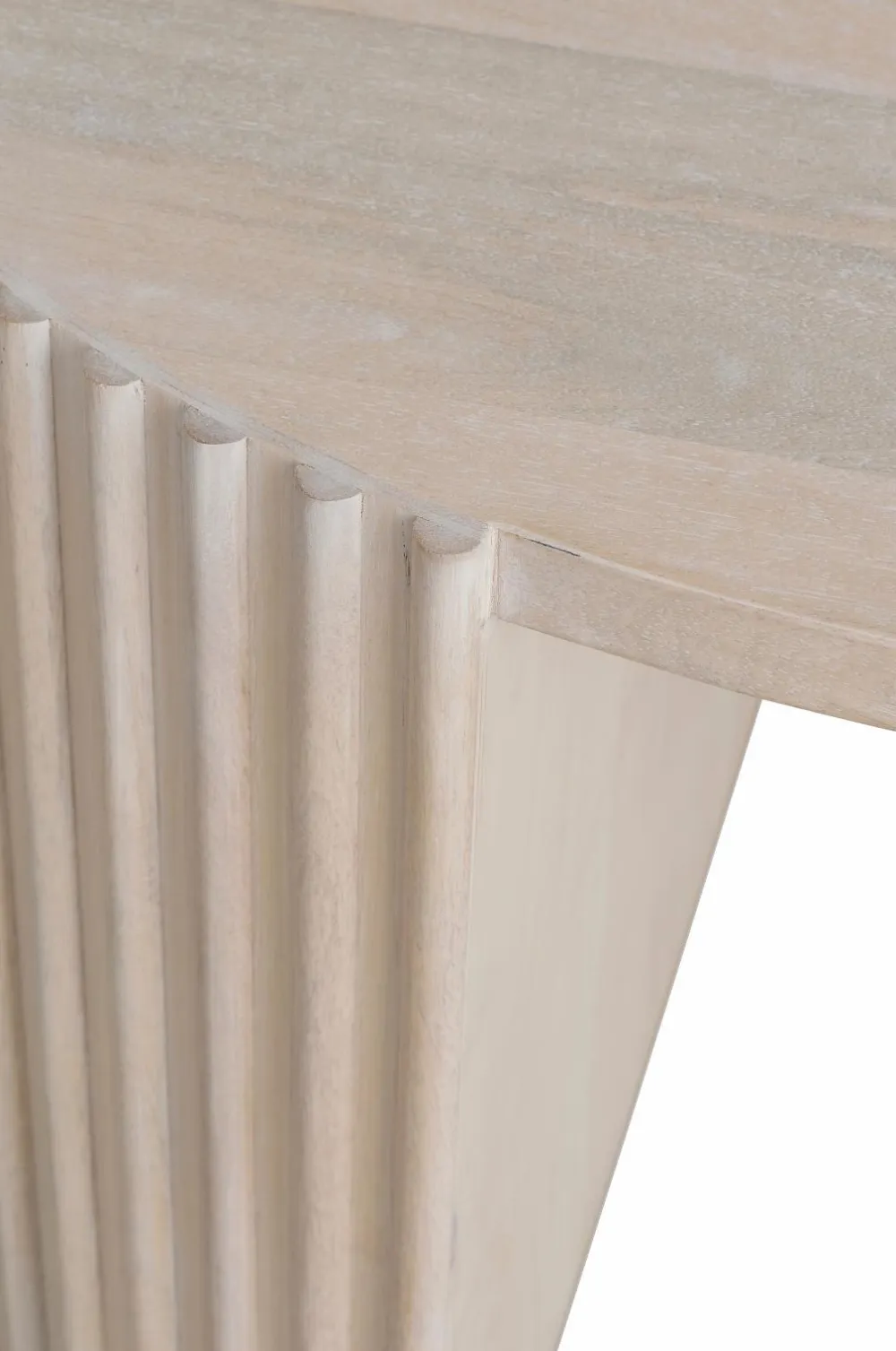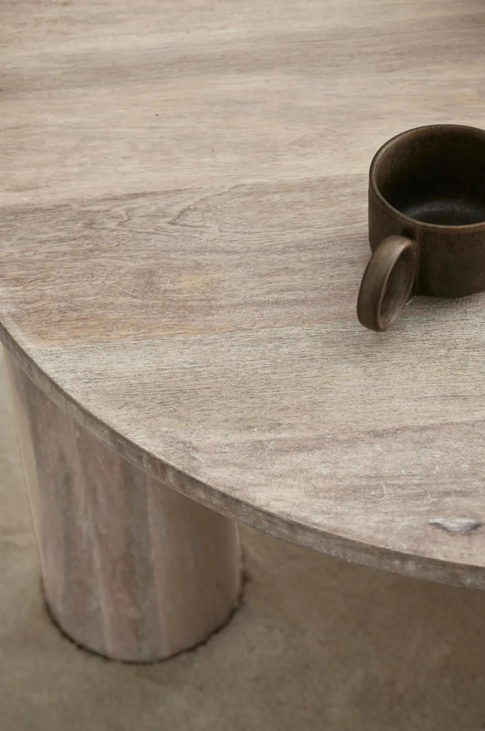 Sofabord i mangotræ. Understel med riflet struktur og et rundt, kraftigt ben. Højde 45 cm, diameter 80 cm. Samlet.