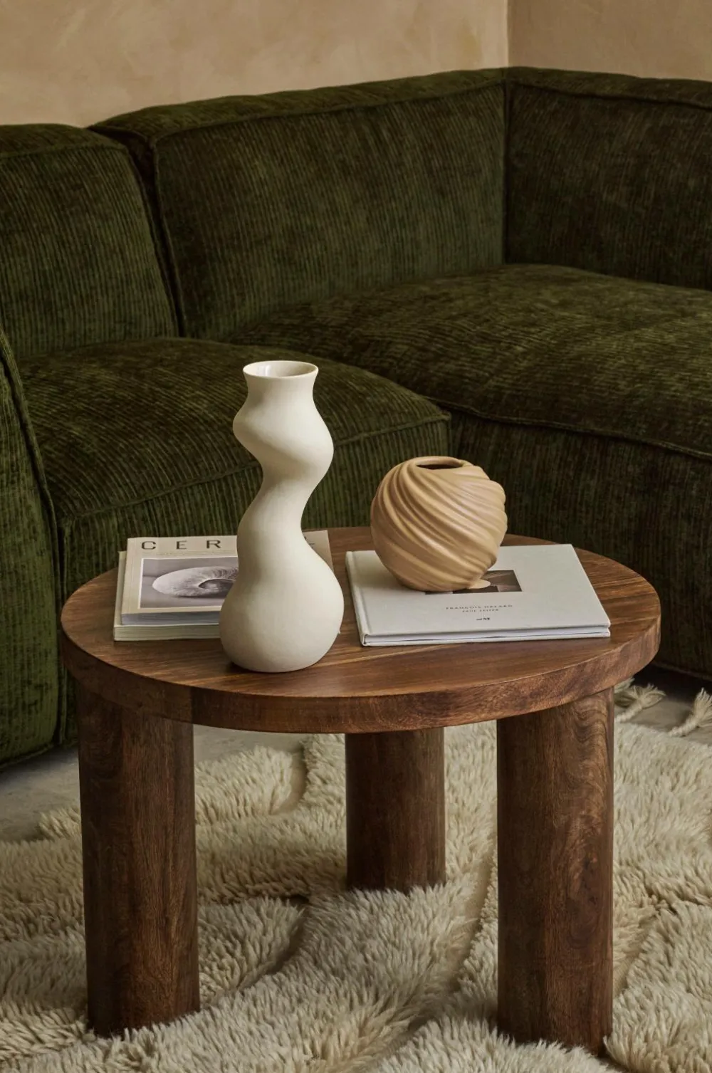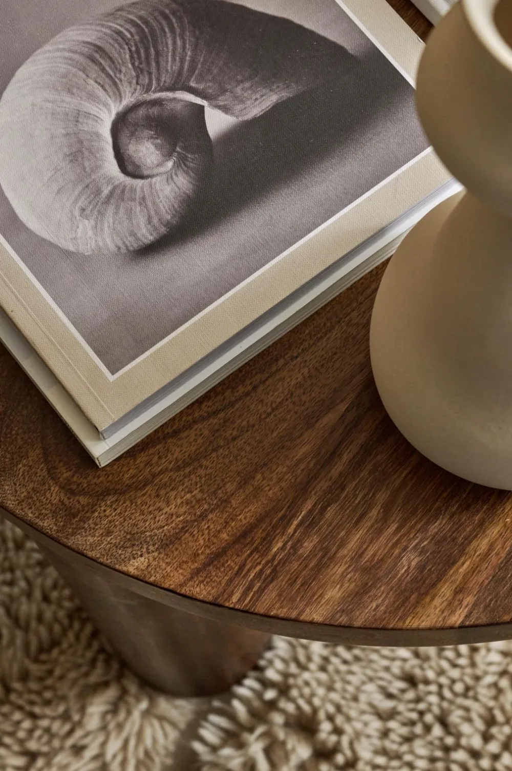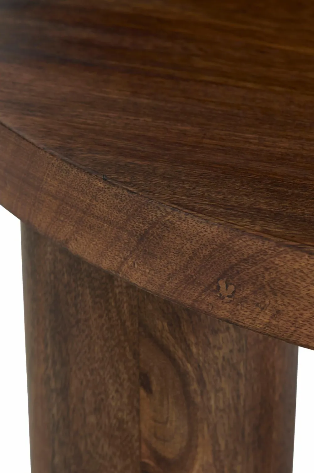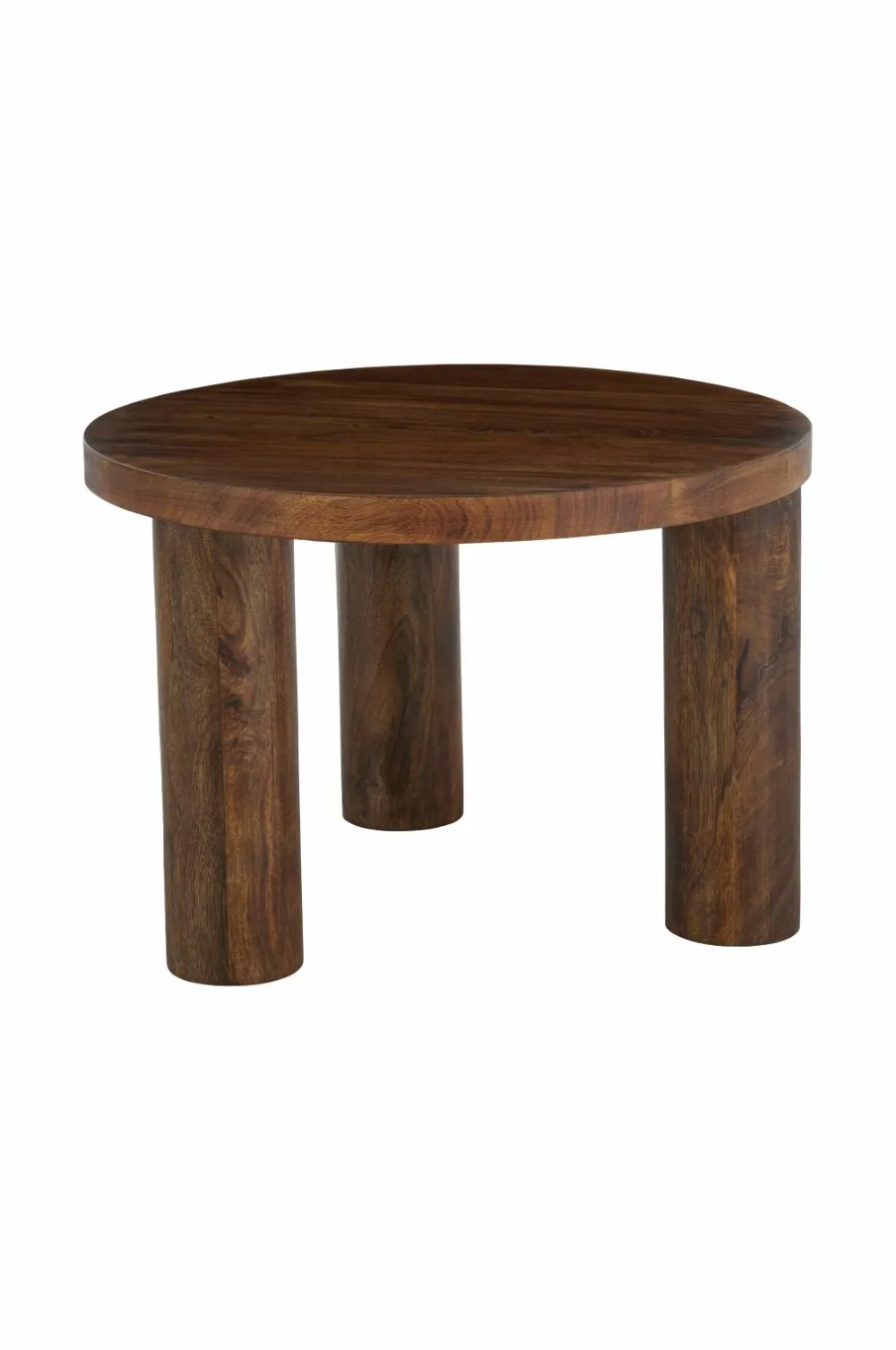 Rundt sofabord i mangotræ med kraftige, runde ben. Behandlet med mat lak. Højde 41,5 cm, diameter på pladen 60 cm. Lettere montering.