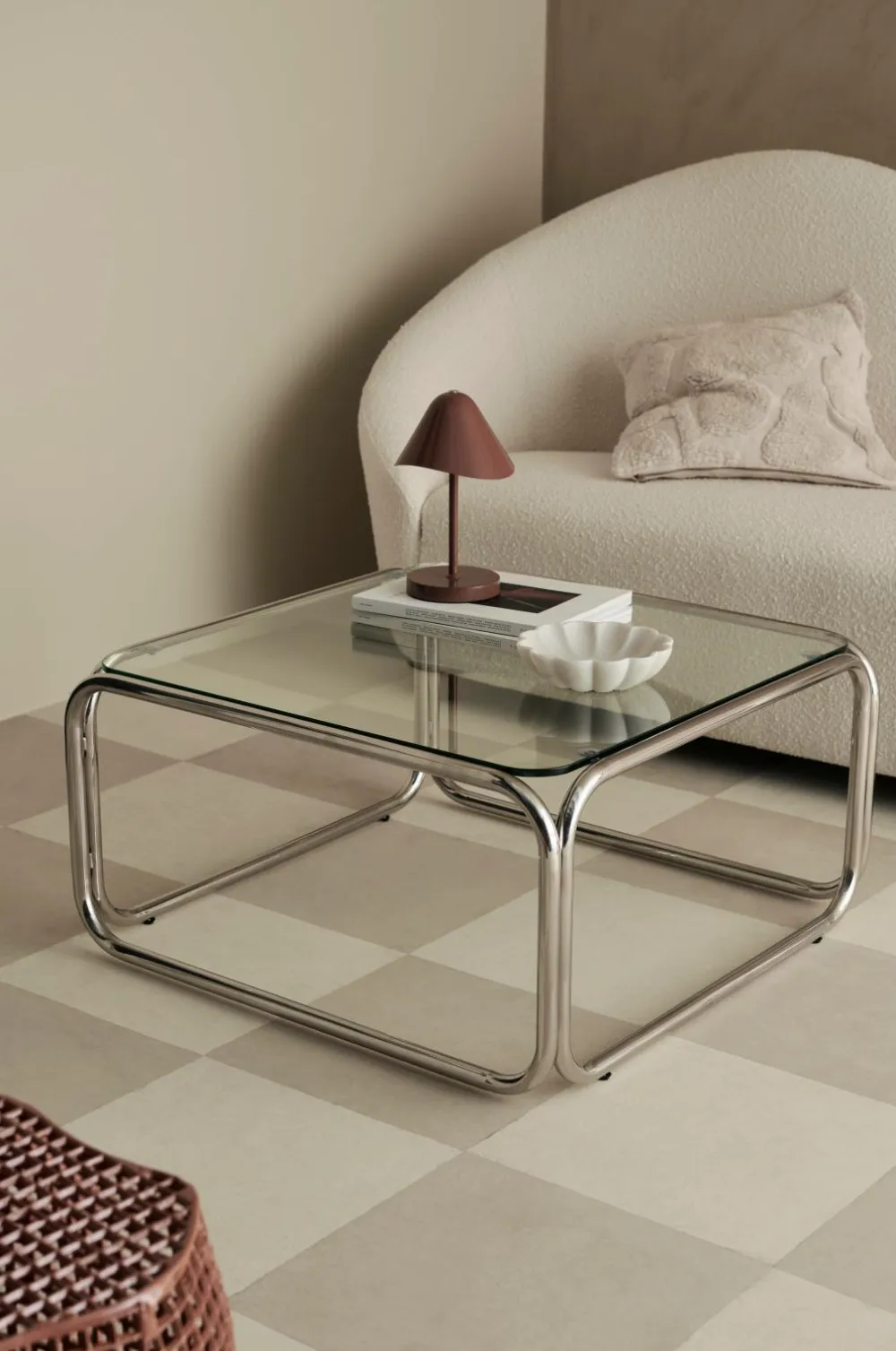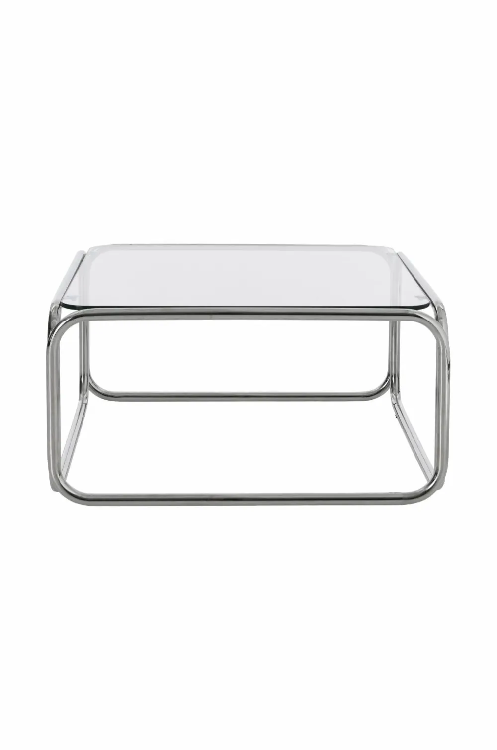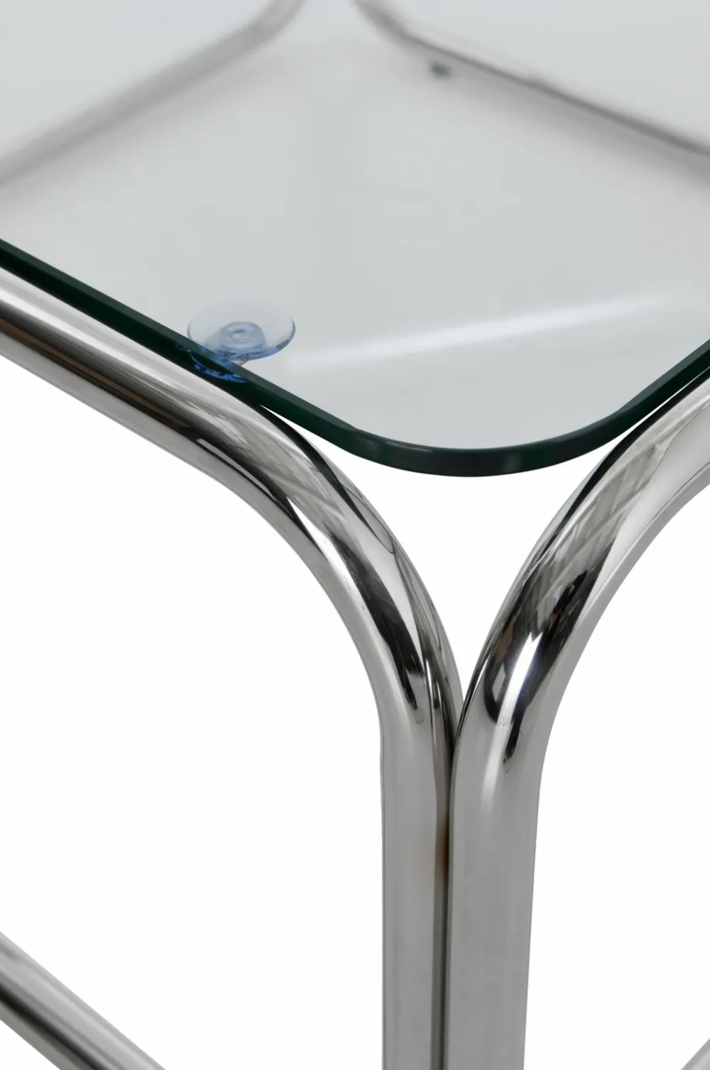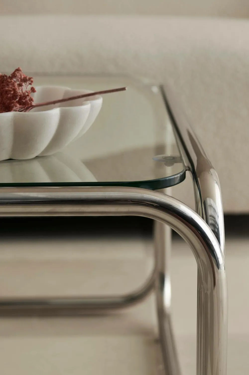 Sofabord med understel i poleret rustfrit stål. Bordplade i tempereret glas, tykkelse 10 mm. Maks. belastning 50 kg. Bordpladen er aftagelig.
