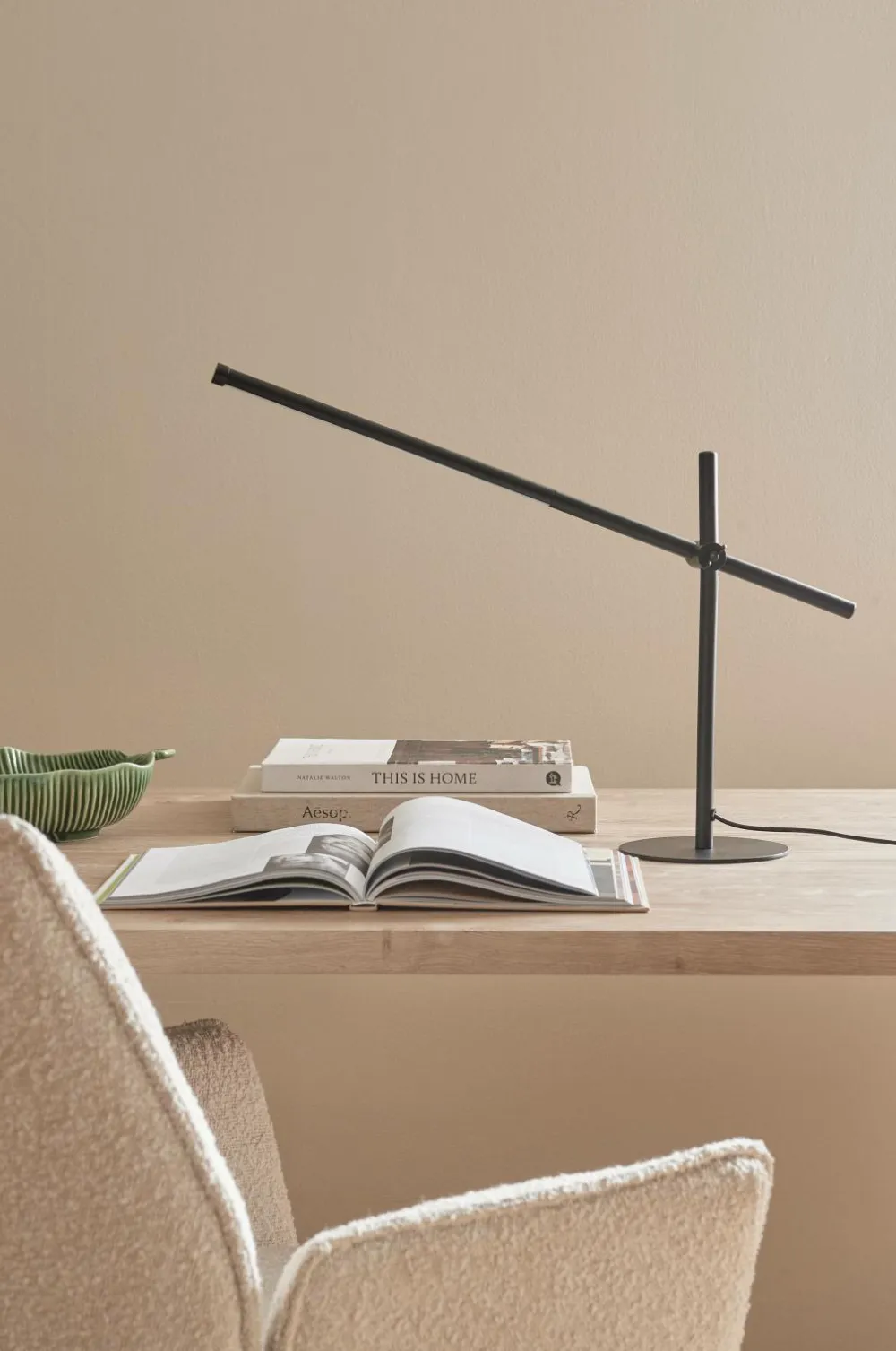Bordlampe af metal i moderne design med integreret LED-pære. Dæmpbar i tre trin med touch-knap. Arm som kan justeres op og ned. Bundpladens diameter 15 cm. Ledning med afbryder.