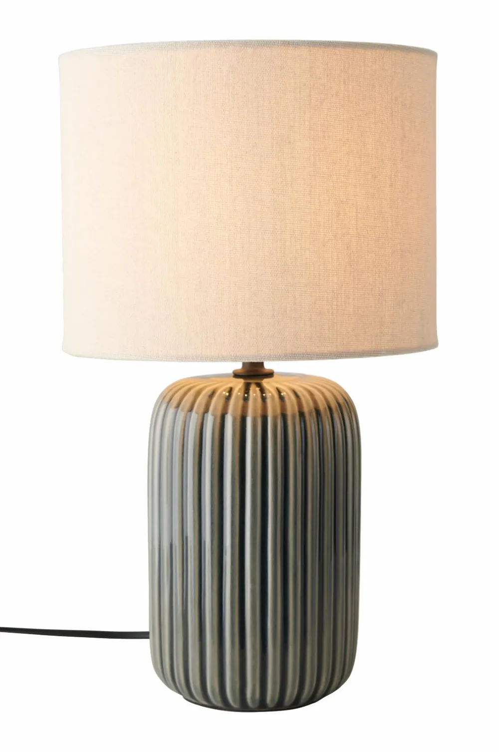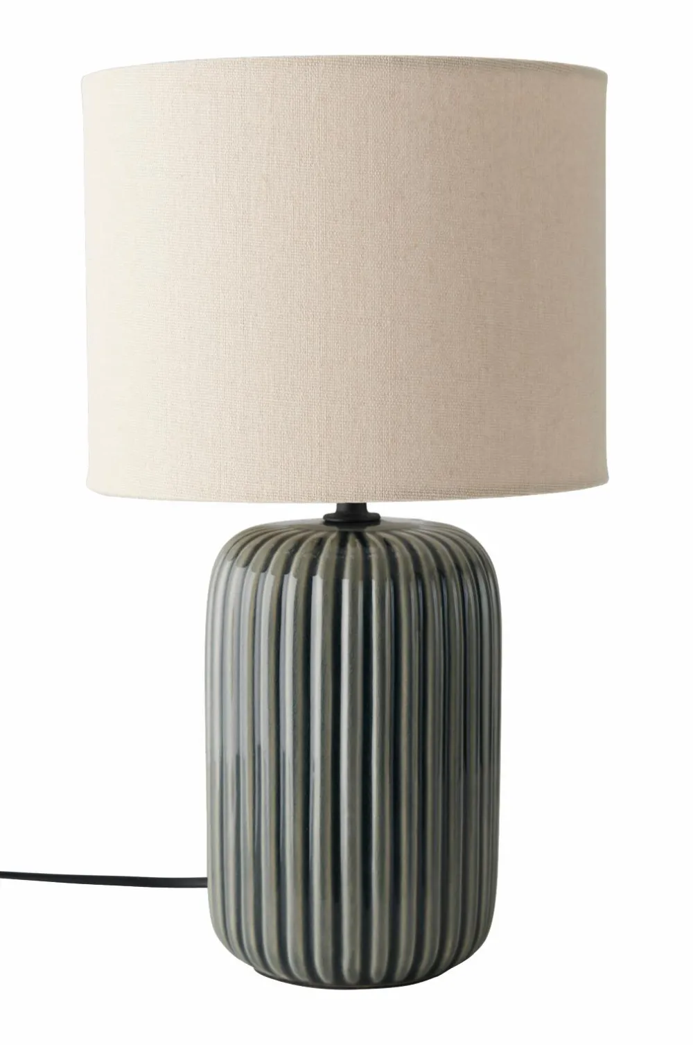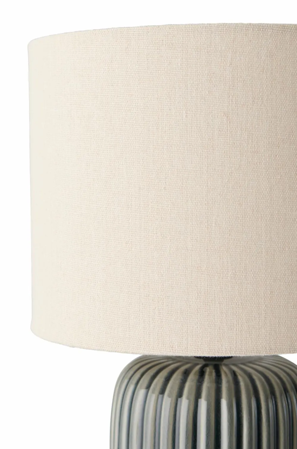 Bordlampe med fod af glaseret keramik med rillet struktur. Skærm af bomuldstekstil. Plastledning med strømafbryder. Skærmens mål: Diameter 20 cm, højde 16 cm. Lampefodens mål: Diameter 11 cm, højde 19 cm. Pære medfølger ikke.
