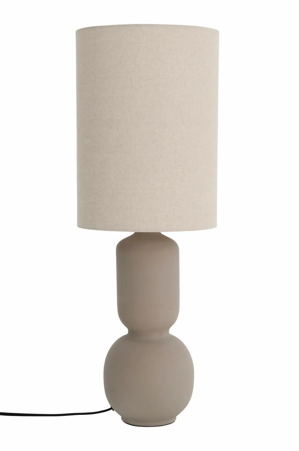 Bordlampe med fod af keramik med let struktur. Skærm i hørstof. Mål på skærmen: Diameter 28 cm, højde 38 cm. Mål på lampefod: Højde 38,5 cm, diameter på det bredeste sted 18 cm. Sort stofledning med strømafbryder, pære medfølger ikke.