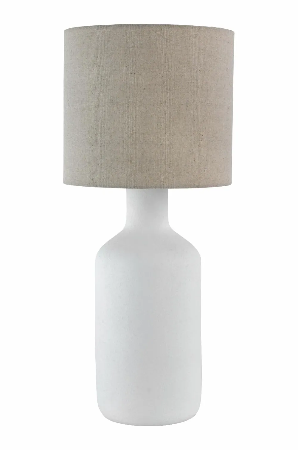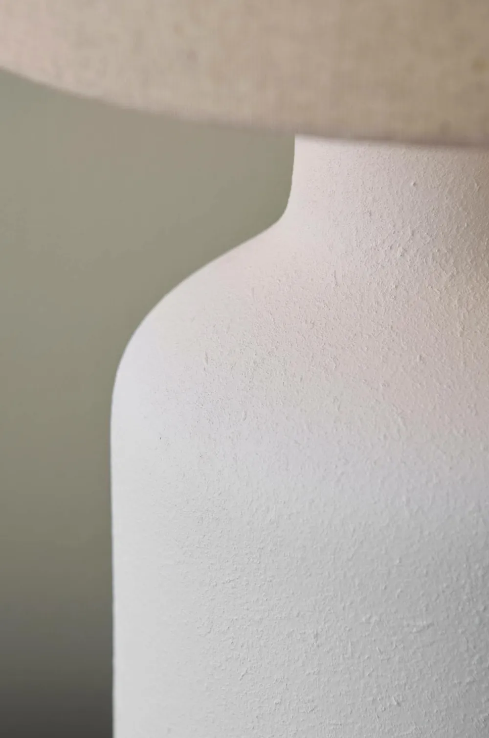 Bordlampe med fod i stentøj med let sandstensstruktur. Skærm i hørstof.