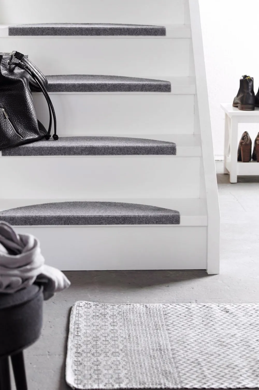 Ensfarvet med selvklæbende bagside. Af polypropylen. Støvsugning/skumvask. Str. 64×21 cm + 3 cm kant til at folde ned.