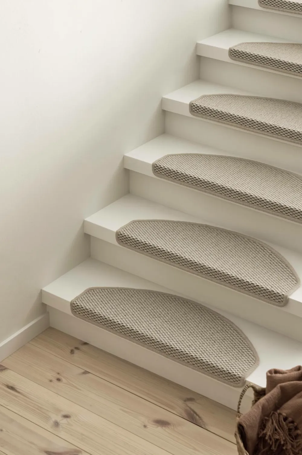Trappetrinsmåtte i 12-pak. Vævet i sisallignende struktur med riede kanter. Bagside af hård plastprofil og dobbeltklæbende tape.