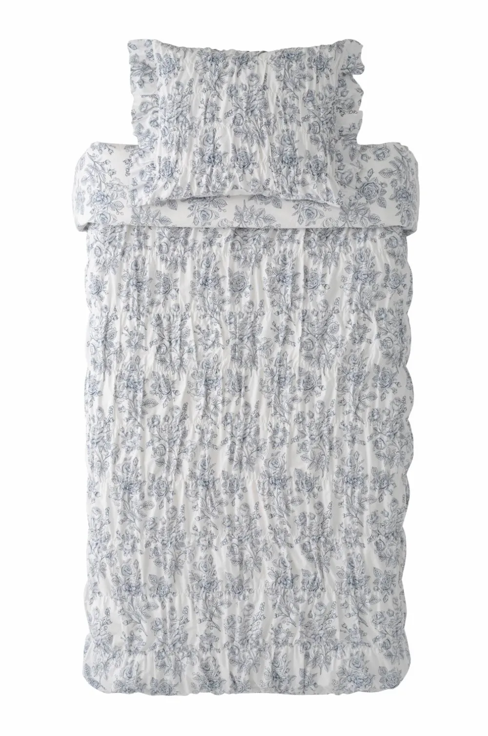 • Forsiden af dynebetrækket og pudebetrækket har en blød, elastisk linning med en dekorativ rynkeeffekt.